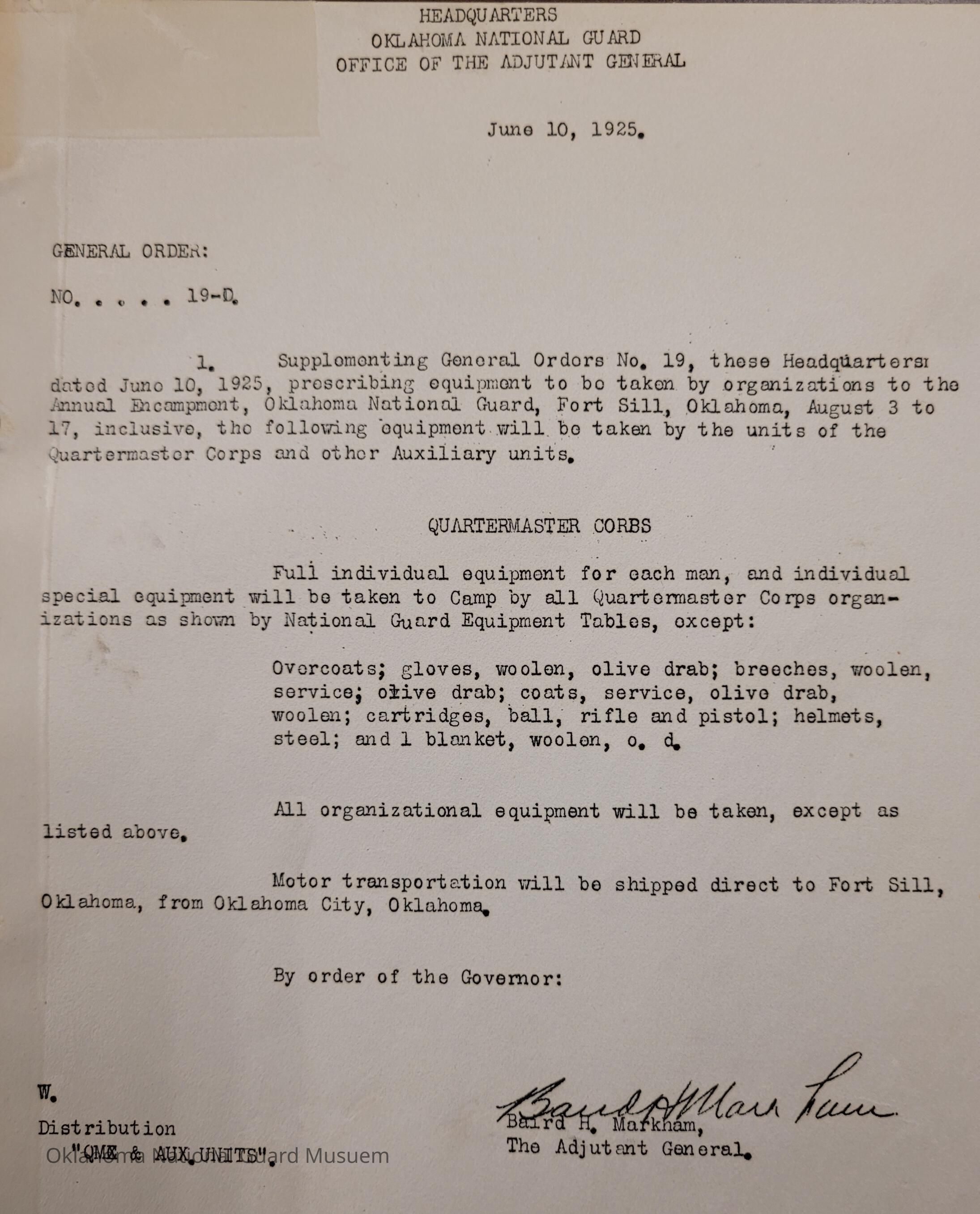 General Order #19-D from Headquarters Adjutant General's Office in Oklahoma City. The order supplements General Order 19 and details what equipment, particular to the Quartermaster Corps and other Auxiliary Units, should be taken to the annual encampmentDate(s) of Creation