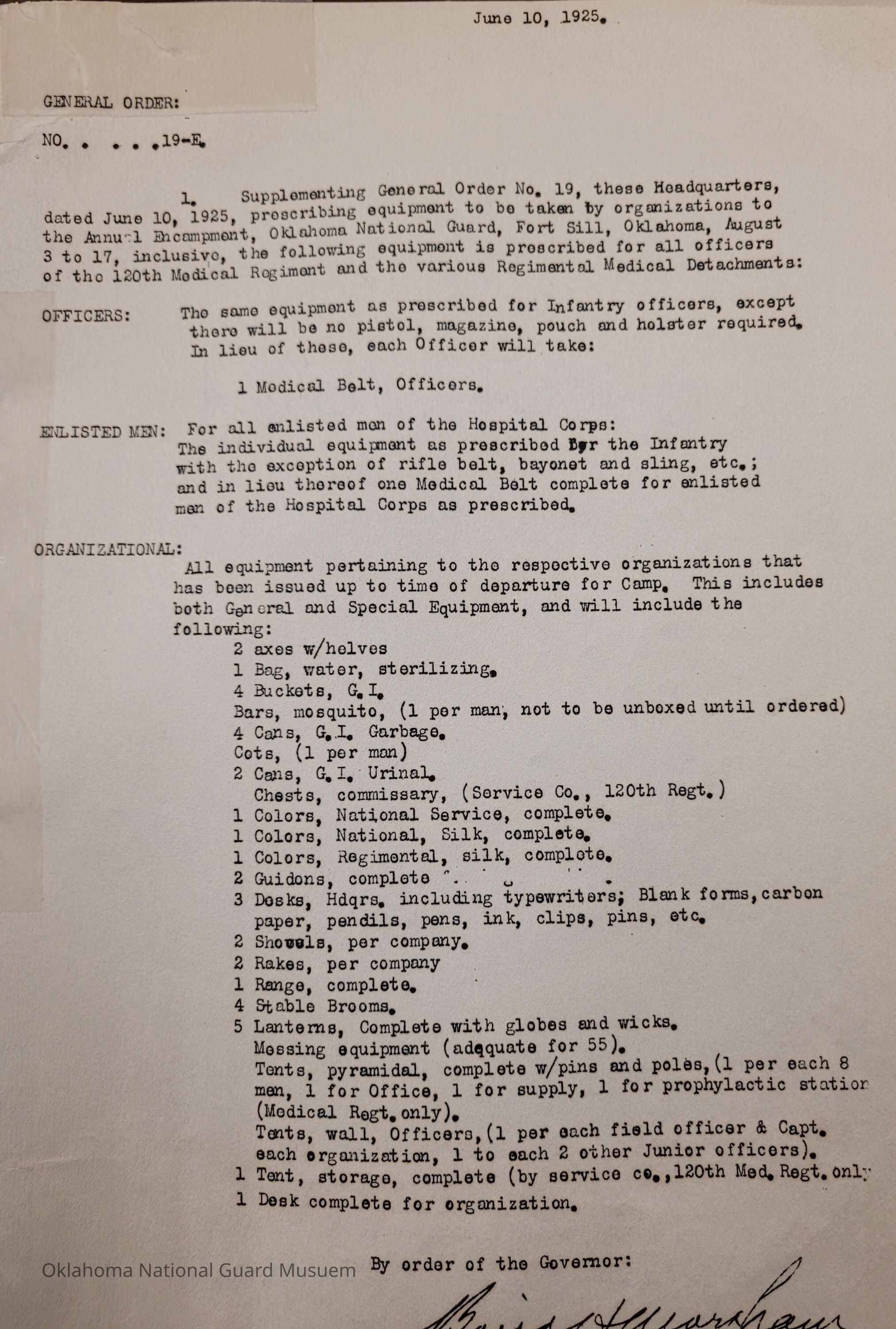 General Order #19-E from Headquarters Adjutant General's Office in Oklahoma City. The order supplements General Order 19 and details what equipment, particular to the officers of the 120th Medical Regiment, should be taken to the annual encampmentDate(s) of Creation