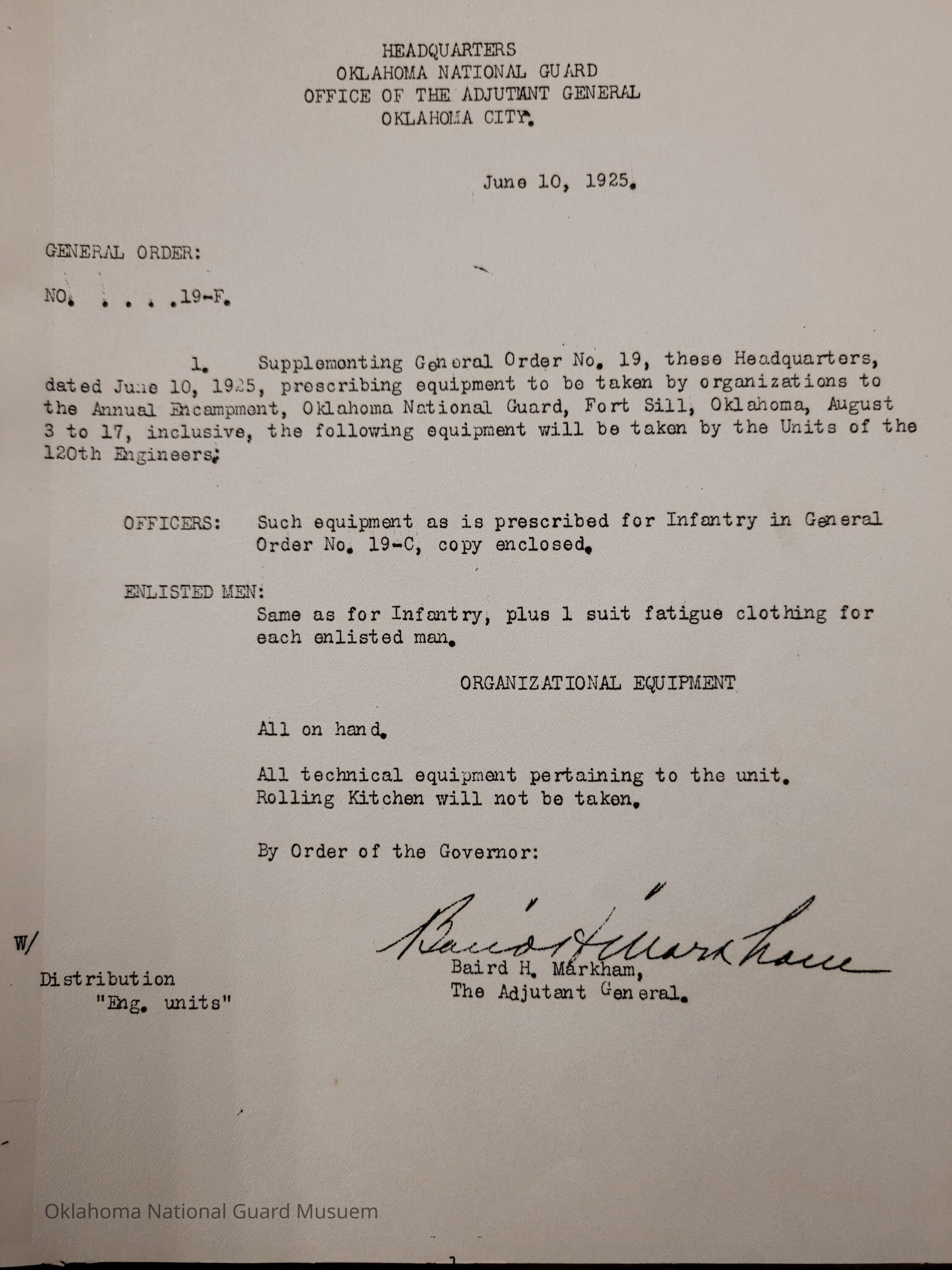 General Order #19-F from Headquarters Adjutant General's Office in Oklahoma City. The order supplements General Order 19 and details what equipment, particular to the 120th Engineers, should be taken to the annual encampmentDate(s) of Creation