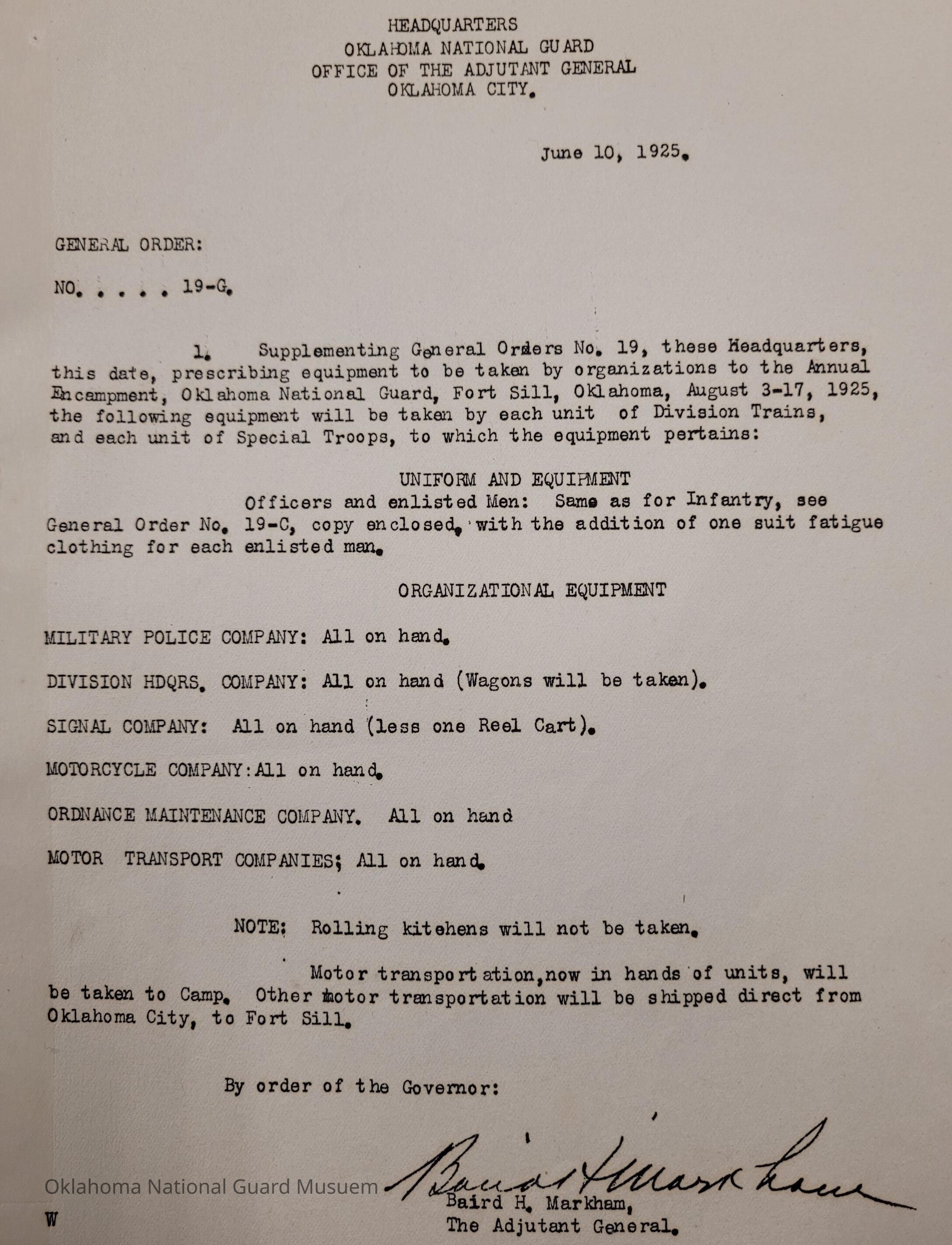 General Order #19-G from Headquarters Adjutant General's Office in Oklahoma City. The order supplements General Order 19 and details what equipment, particular to the Division Trains and other Special Troops, should be taken to the annual encampmentDate(s) of Creation