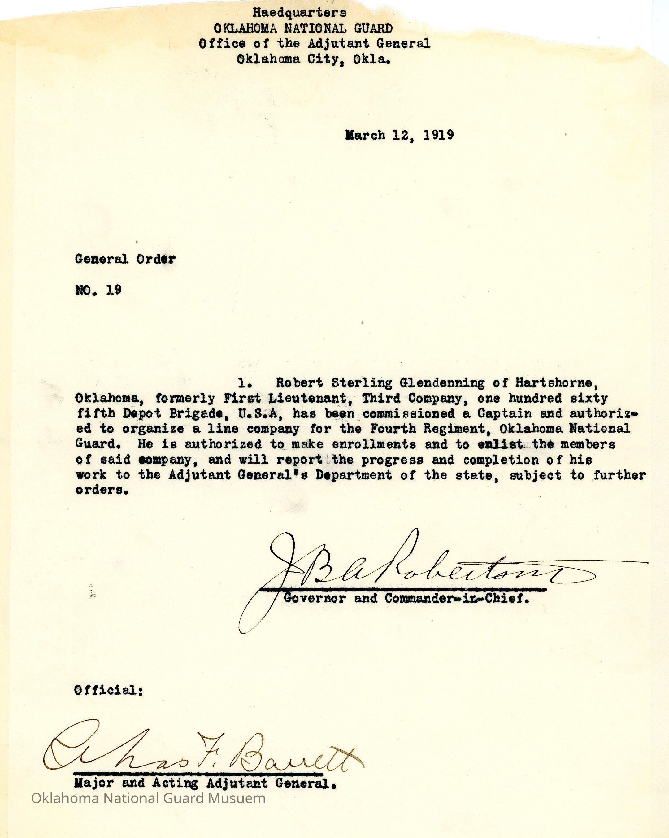 General Order #19 from Headquarters Adjutant General's Office in Oklahoma City. The order promotes Robert Sterling to Captain and authorized to create a line company for the Fourth Regiment of the Oklahoma National Guard.Date(s) of Creation