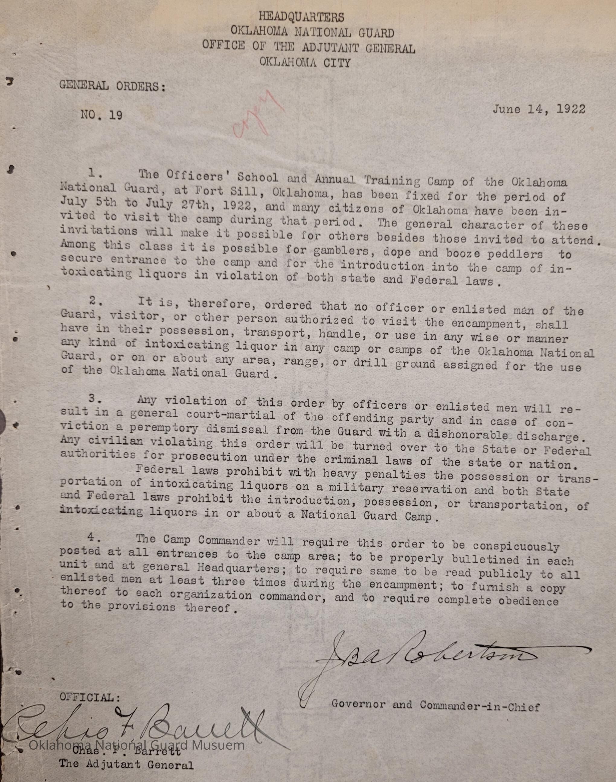 General Order #19 from Headquarters Adjutant General's Office in Oklahoma City. The order opens the Annual Training Camp and Officer's School to the public for viewing. However, it prohibits gambling, alcohol, dope, and booze peddlers.Date(s) of Creation