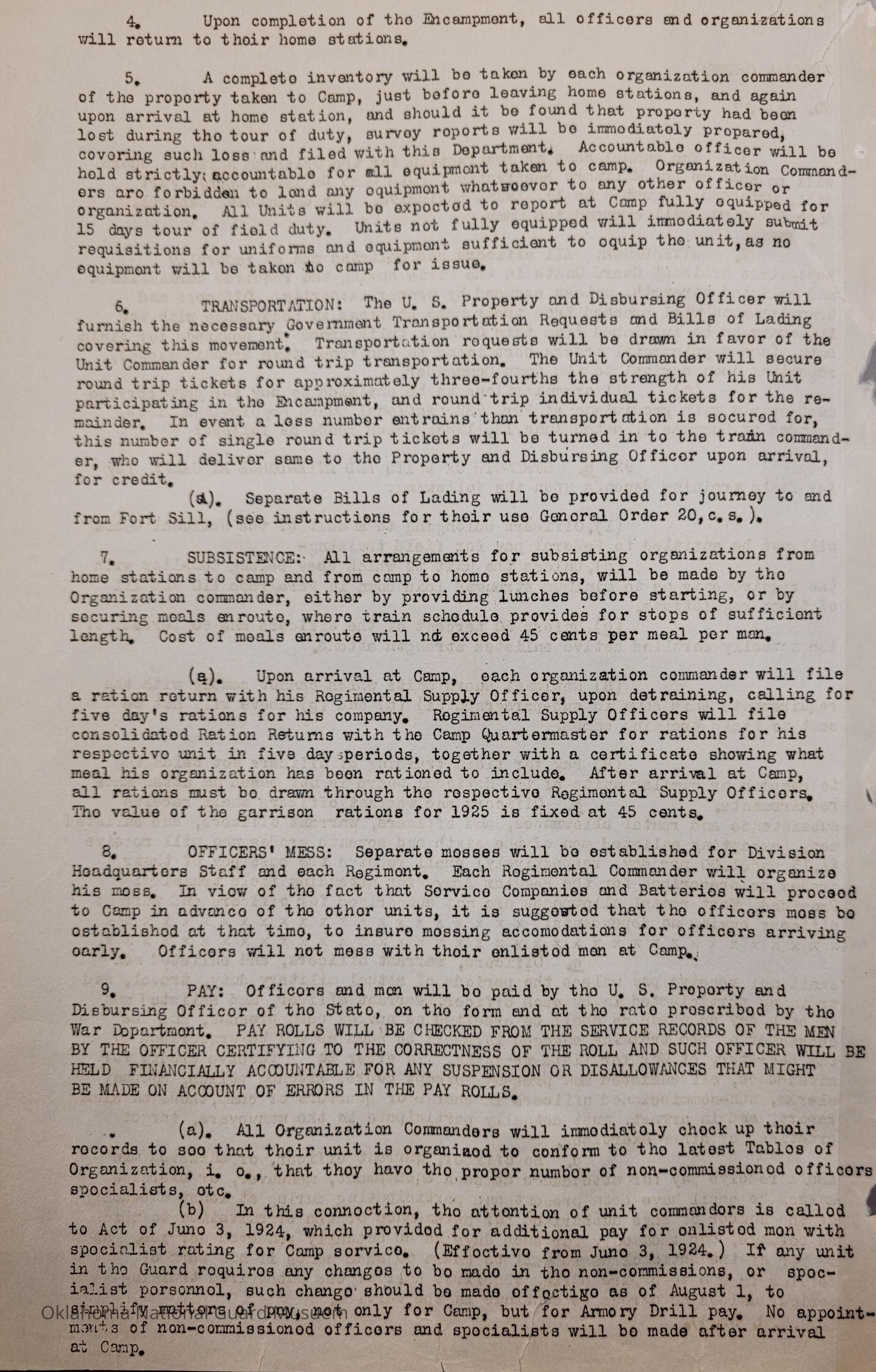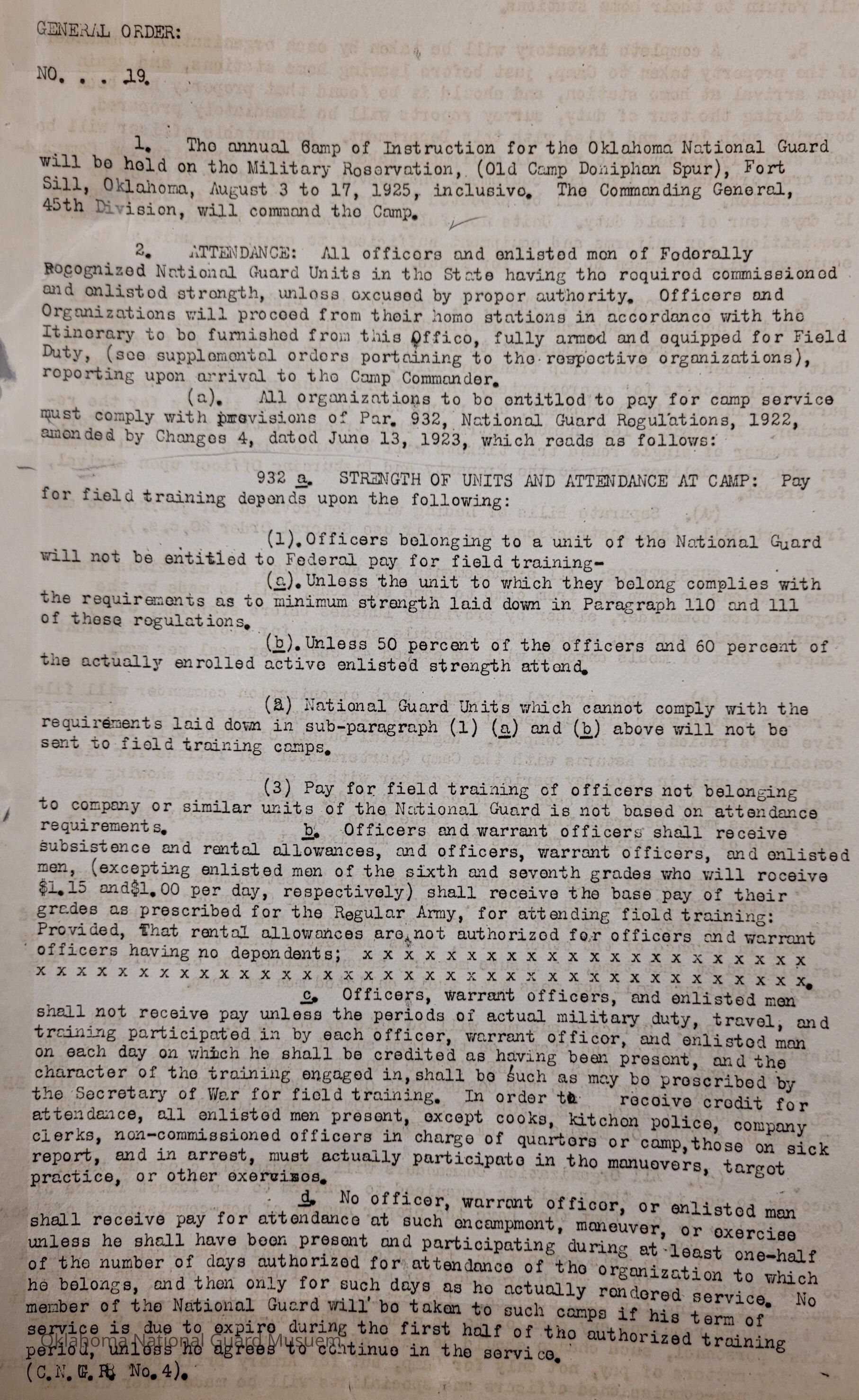 General Order #19 from Headquarters Adjutant General's Office in Oklahoma City. The order details the equipment, attendance, transportation, and pay for the Annual Camp of Instruction at Old Camp Doniphan Spur in Fort SillDate(s) of Creation