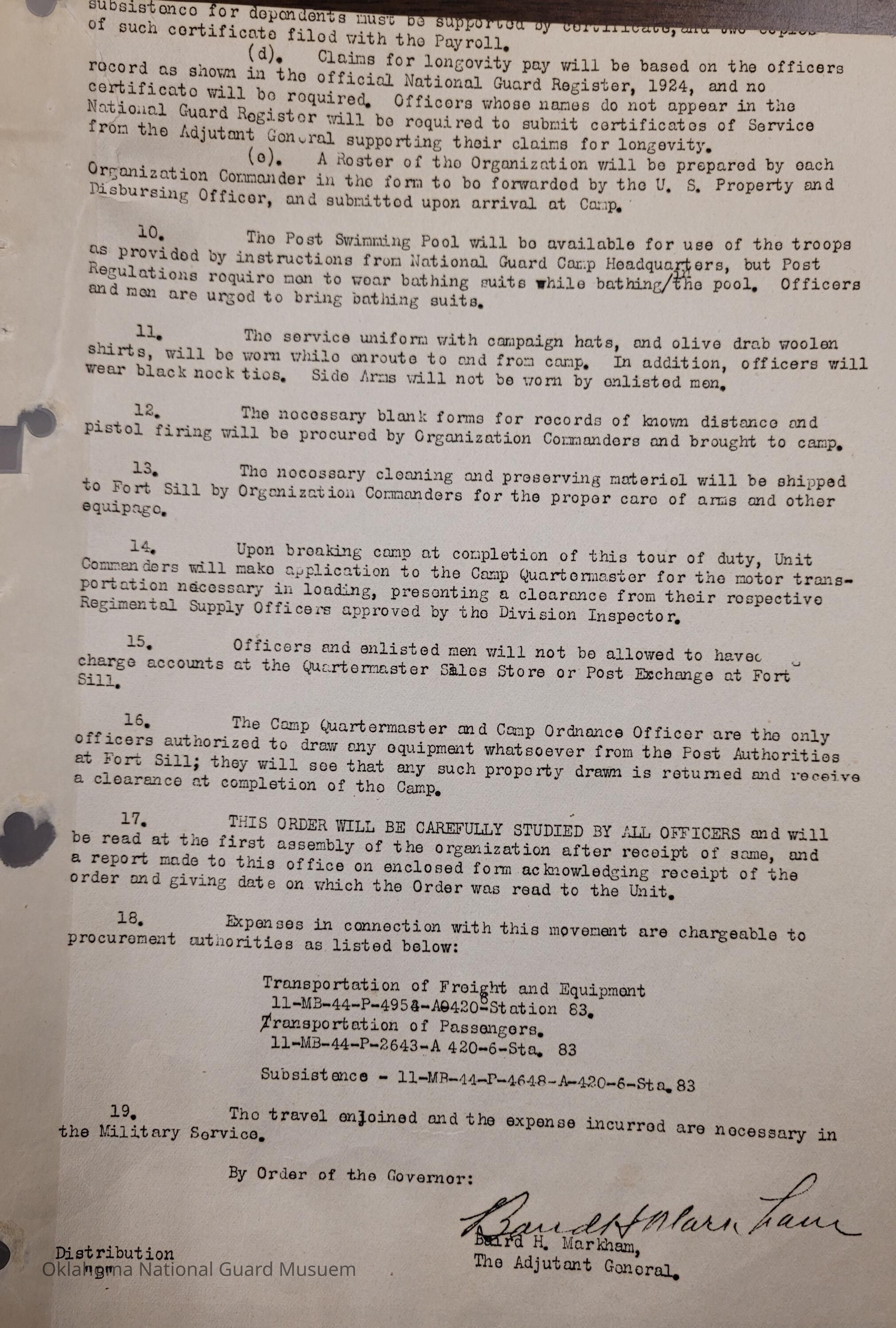 Adjutant General, Oklahoma City, Baird H. Markham, 45th Division, Camp of Instruction, Old Camp Doniphan Spur, Fort Sill, Attendance, Pay, Transportation