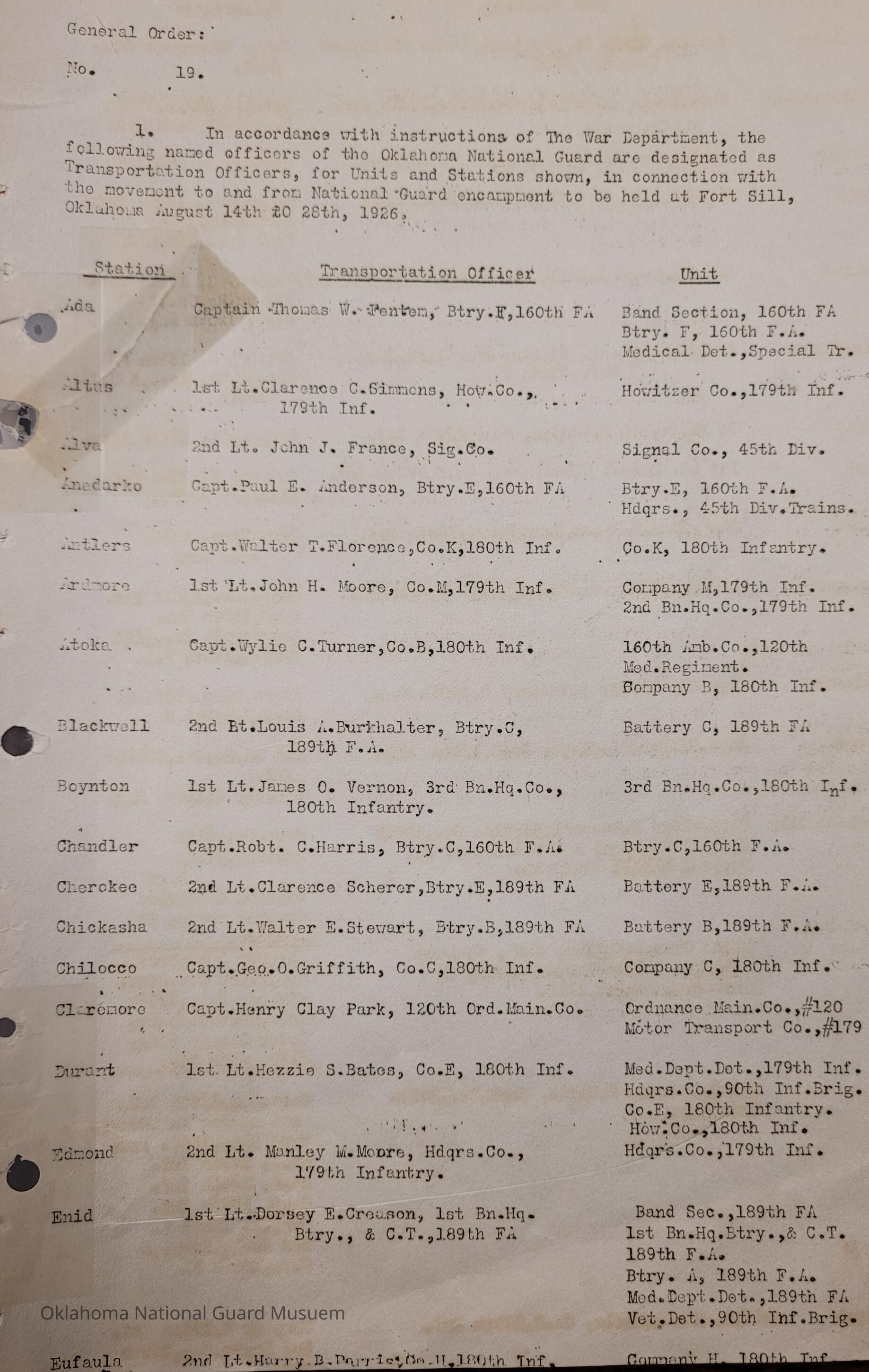 General Order #19 from Headquarters Adjutant General's Office in Oklahoma City. The order designates Transportation Officers for specific stations and units for the transportation to Fort Still for the Annual EncampmentDate(s) of Creation