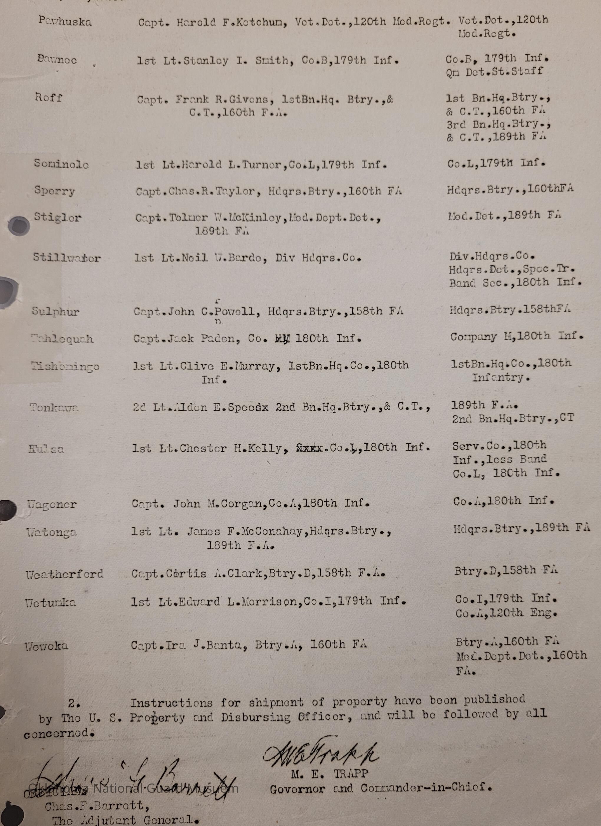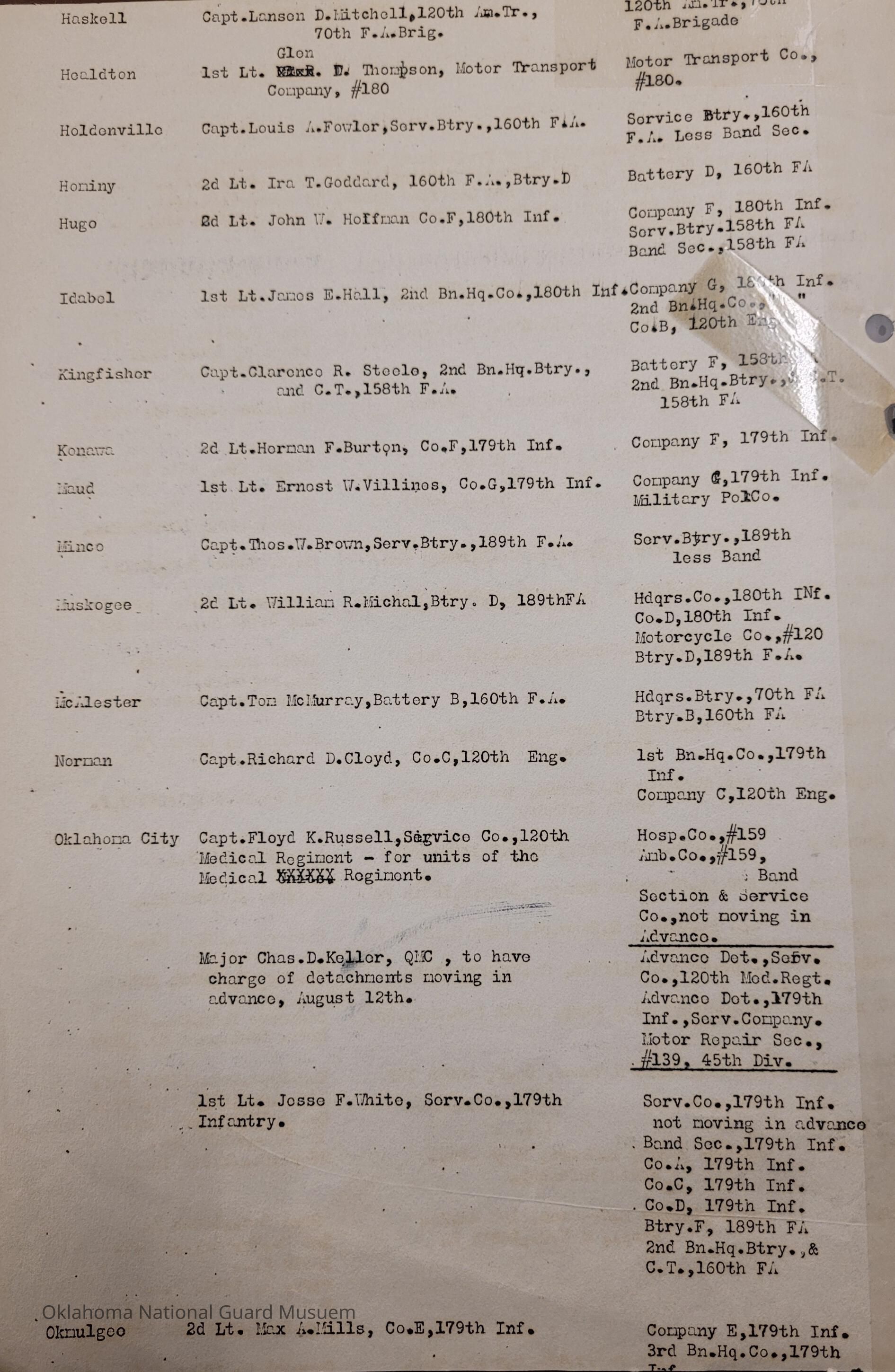 Adjutant General, Oklahoma City, Charles F. Barrett, 45th Division, Camp of Instruction, Old Camp Doniphan Spur, Fort Sill, Martin E. Trapp, Transportation Officers, Ada, Thomas W. Fentem, 160th Field Artillery, Altus, Clarence C. Simmons, 179th Infantry, Alva, John J. France, Signal Company, Anadarko, Paul E. Anderson, 45th Division Trains, Antlers, Walter T. Florence, 180th Infantry, Ardmore, John H. Moore, Atoka, Wylie C. Turner, 120th Medical Regiment, Blackwell, Louis A. Burkhalter, 189th Field Artillery, Boynton, James O. Vernon, Chandler, Robert C. Harris, Cherokee, Clarence Scherer, Chickasha, Walter E. Stewart, Chilocco, George O. Griffith, Claremore, Henry Clay Park, Durant, Hezzie S. Bates, 90th Infantry Brigade, Edmond, Manley M. Moore, Enid, Dorsey E. Creason, Eufaula, Harry B. Barriston, Haskell, Lansen D. Mitchell, 120th Armored Train, 70th Field Artillery Brigade, Healdton, Glen Thompson, Holdenville, Louis A. Fowler, Hominy, Ira T. Goddard, Hugo, John W. Hoffman, Idabel, James E. Hall, Kingfisher, Clarence R. Steele, 158th Field Artillery, Konawa, Herman F. Burton, Ernest W. Villines, Maud, Minco, Thomas W. Brown, Muskogee, William R. Michal, McAlester, Tom McMurray, Norman, Richard D. Cloyd, 120th Engineers, Floyd K. Russell, Charles D. Keller, 120th Medical Regiment, Jesse F. White, Okmulgee, Max A. Mills, Pawhuska, Harold F. Ketchum, Pawnee, Stanley I. Smith, Roff, Frank R. Givens, Seminole, Harold L. Turner, Sperry, Charles R. Taylor, Stigler, Tolmer W. McKinley, Stillwater, Neil W. Barde, Band Section, Sulphur, John C. Powell, Tahlequah, Jack Paden, Tishomingo, Clive E. Murray, Tonkawa, Aiden E. Spees, Tulsa, Chester H. Kelly, Wagoner, John M. Corgan, Watonga, James F. McConahay, Weatherford, Cirtis A. Clark, Wetumka, Edward L. Morrison, Wewoka, Ira J. Banta