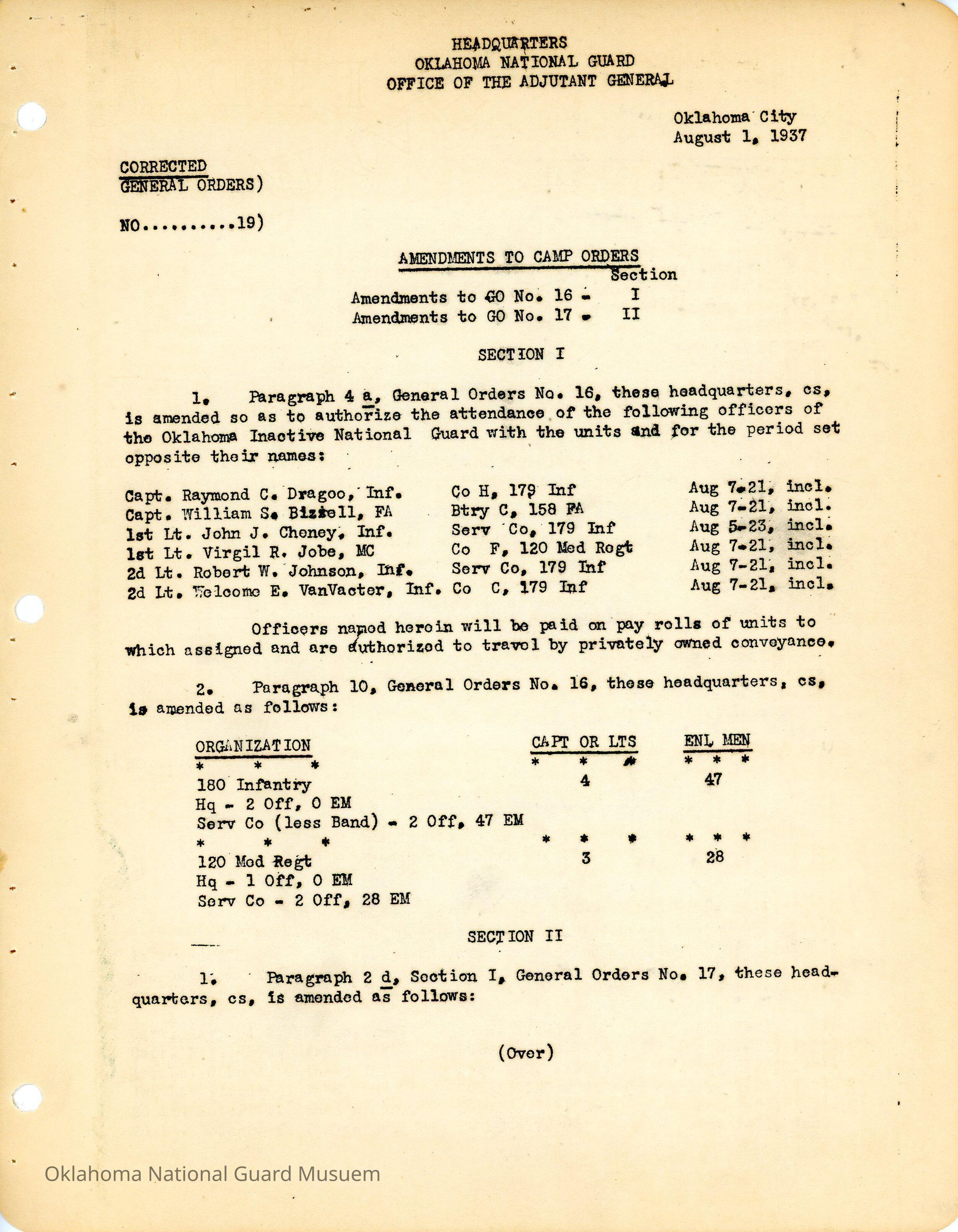General Order #19 from Headquarters Adjutant General's Office in Oklahoma City. The order amends General Order #16 1937 and general Order #17 1937 and details those changesDate(s) of Creation