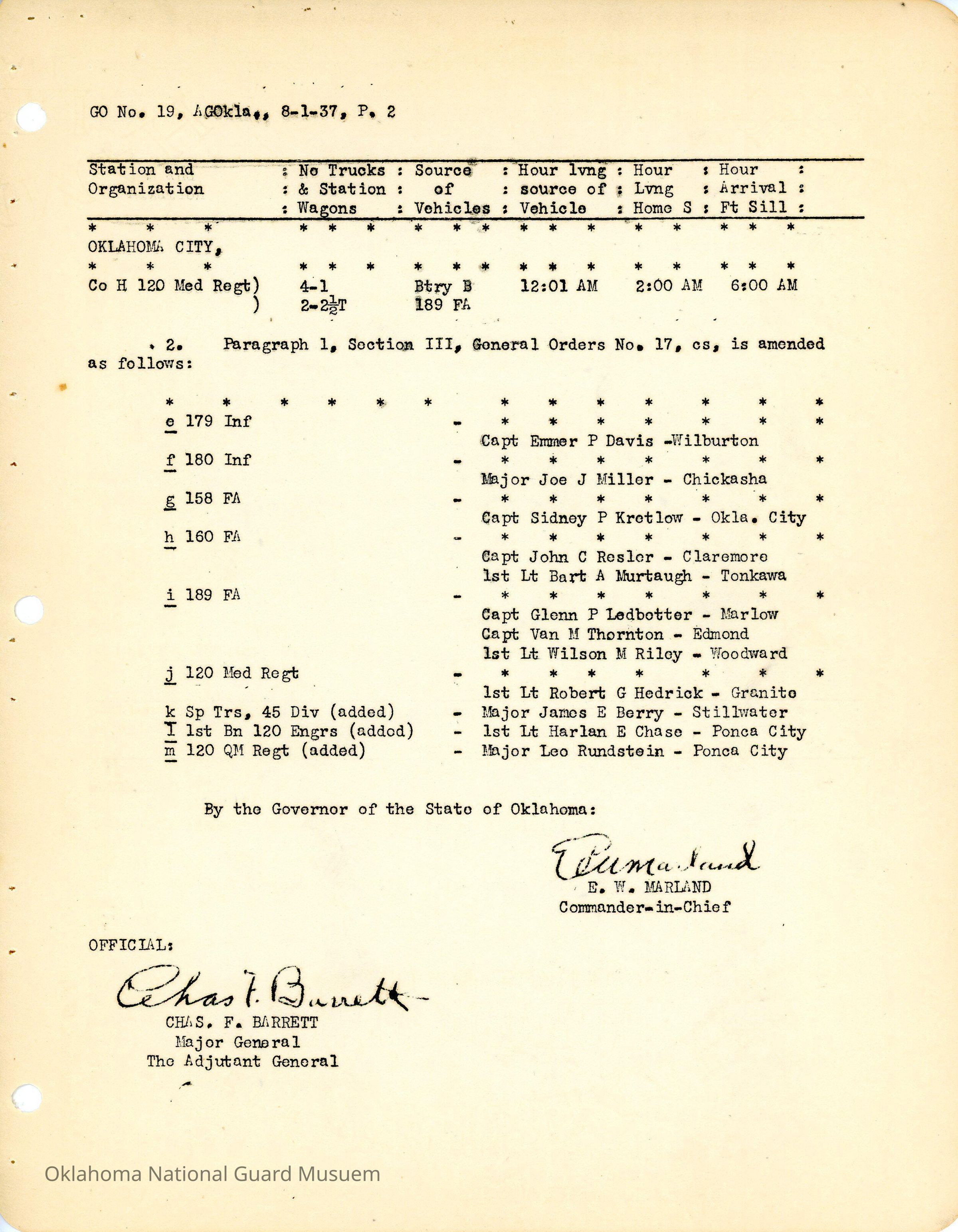 Adjutant General, Oklahoma City, Charles F. Barrett, E.W. Marland, Amend, Raymond C. Dragoo, 179th Infantry, William S. Bizzell, 158th Field Artillery, John J. Cheney, Virgil R. Jobe, Robert W. Johnson, Welcome E. VanVacter, 120th Medical Regiment, 180th Infantry, Emmer P. Davis, Wilburton, Joe J. Miller, Sidney P. Kretlow, Chickasha, John C. Resler, Claremore, Bart A. Murtaugh, Tonkawa, Glenn P. Ledbetter, Marlow, Van M. Thornton, Edmond, Wilson M. Riley, Woodward, Robert G. Hedrick, Granite, James E. Berry, Stillwater, Harlan E. Chase, Ponca City, Leo Rundstein, 120th Quartermaster Regiment, 120th Engineers, 189th Field Artillery, 160th Field Artillery, 180th Infantry