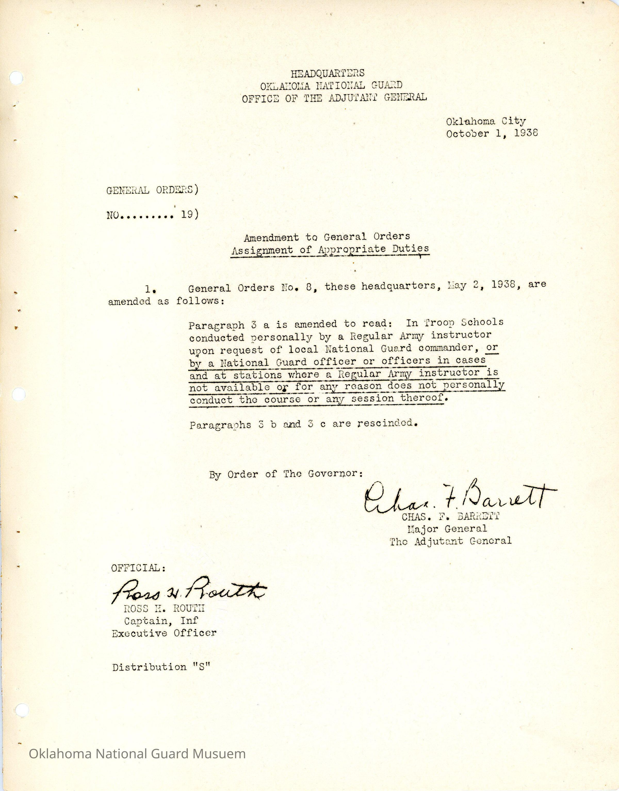 General Order #19 from Headquarters Adjutant General's Office in Oklahoma City. The order amends General Order #8 1938Date(s) of Creation