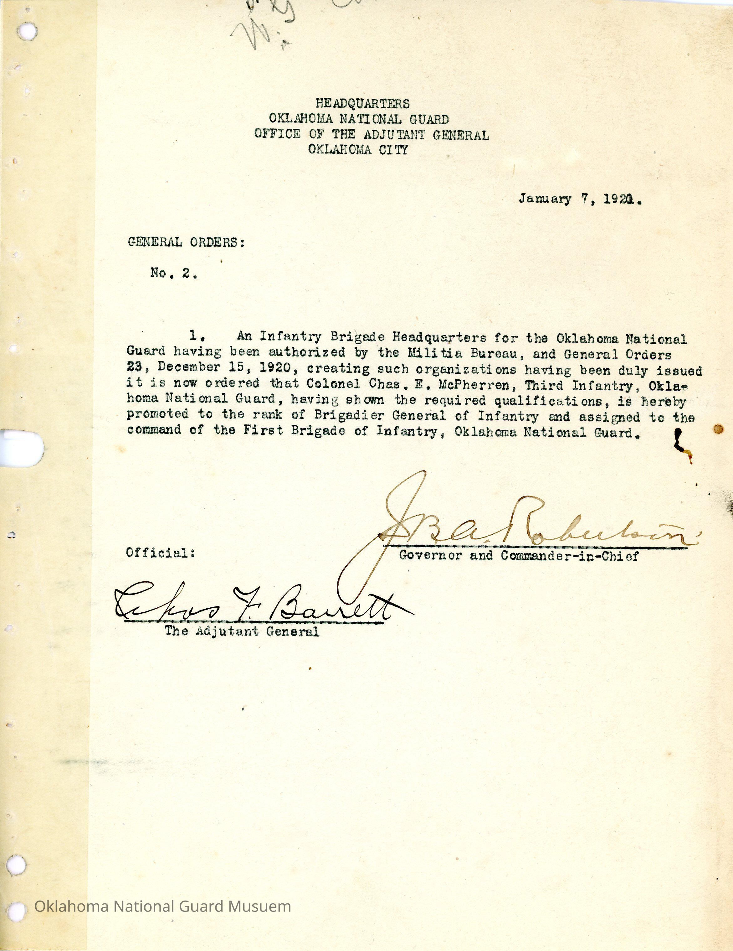 General Order #2 from Headquarters Adjutant General's Office in Oklahoma City. The order authorizes an Infantry Brigade Headquarters for the Oklahoma National Guard. It also promotes Charles E. McPherren to Brigadier General and assigned to the command of the First Brigade InfantryDate(s) of Creation