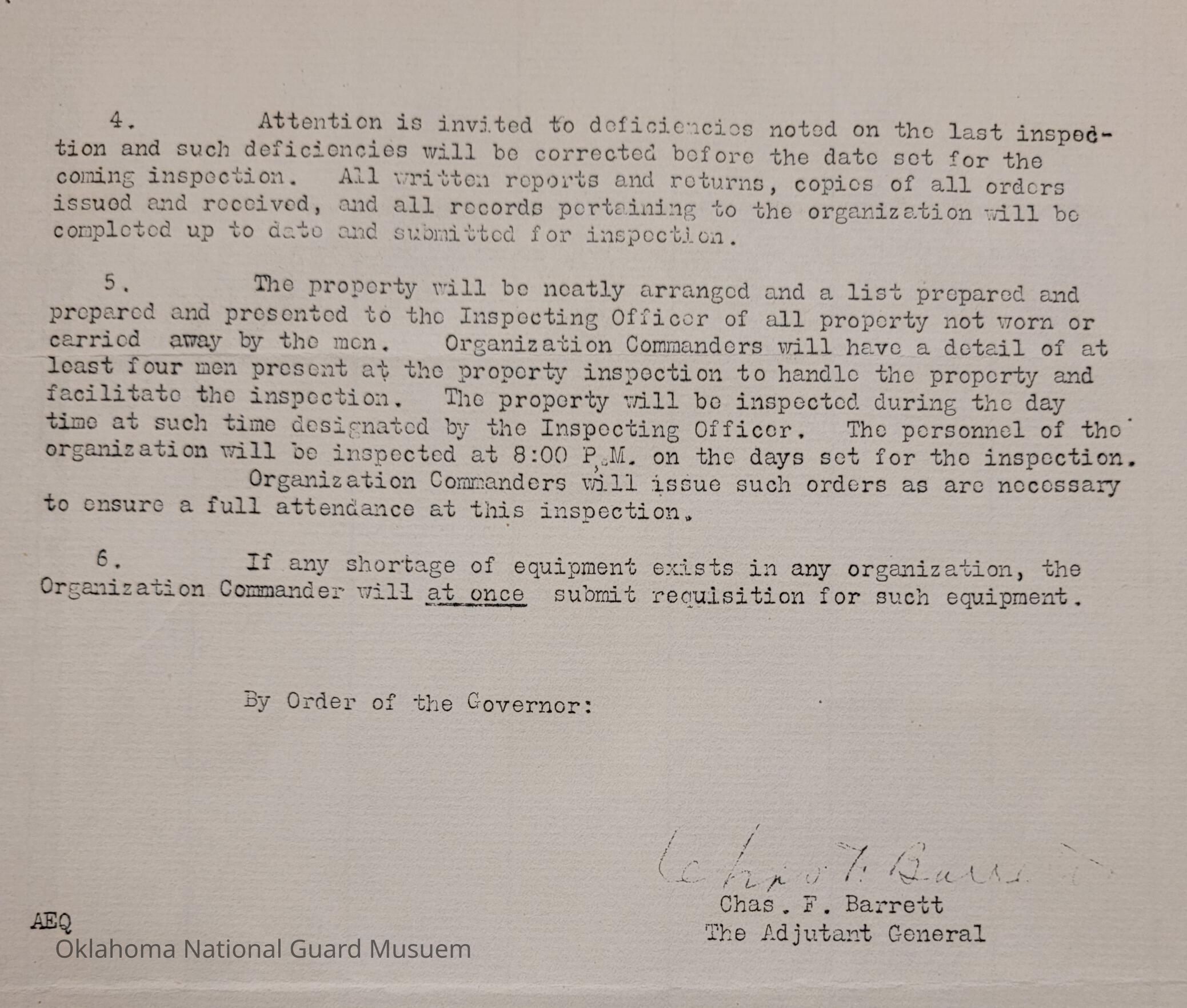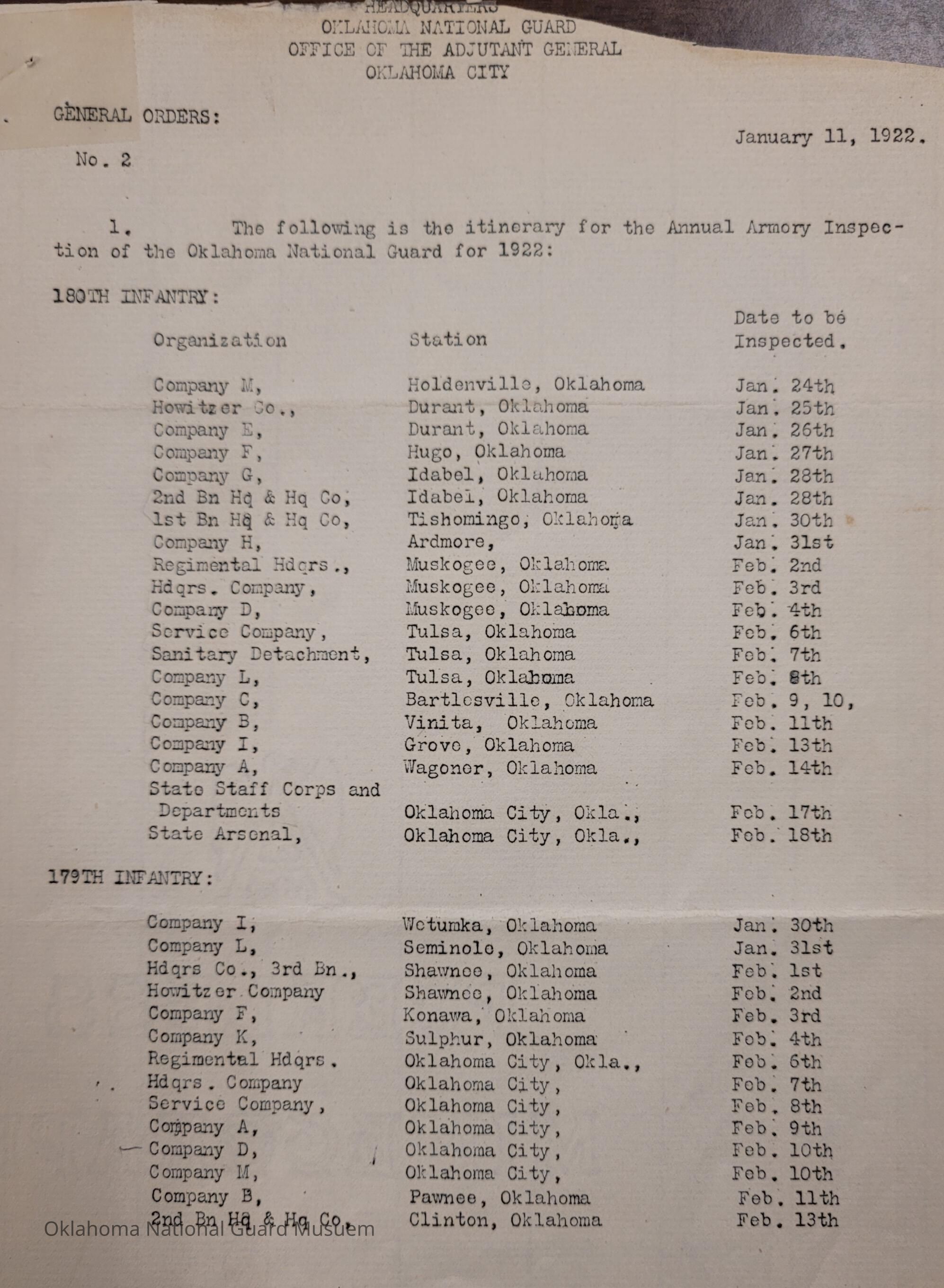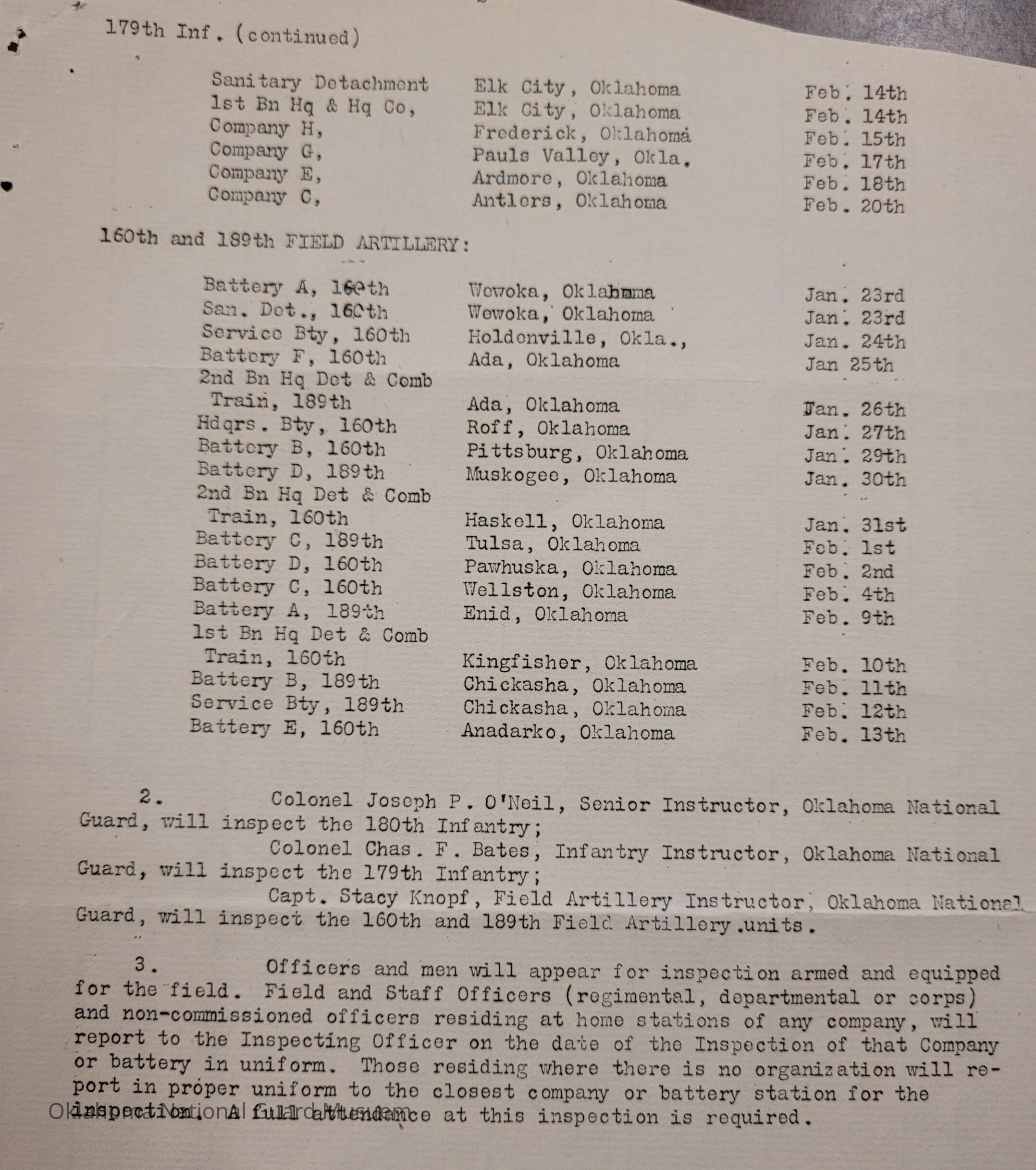Adjutant General, Oklahoma City, Charles F. Barrett, Armory, Armory Inspection, 180th Infantry, 179th Infantry, Holdenville, Durant, Hugo, Idabel, Tishomingo, Ardmore, Muskogee, Tulsa, Bartlesville, Vinita, Wagoner, Wetumka, Seminole, Shawnee, Konawa, Sulphur, Pawnee, Clinton, Elk City, Frederick, Pauls Valley, Wewoka, Ada, Roff, Pittsburg, Haskell, Pawhuska, Wellston, Enid, Kingfisher, Chickasha, Anadarko, Joseph P. O'Neil, Charles F. Bates, Stacy Knopf, 160th Field Artillery, 189th Field Artillery