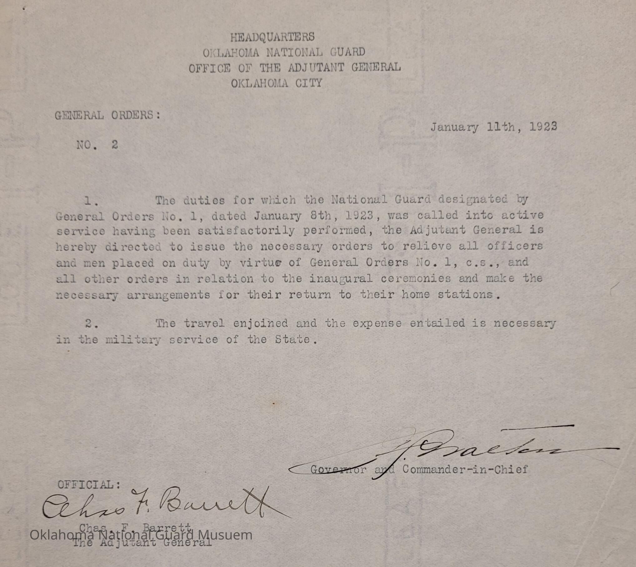 General Order #2 from Headquarters Adjutant General's Office in Oklahoma City. The order relieves all troops called out for inauguration dutiesDate(s) of Creation