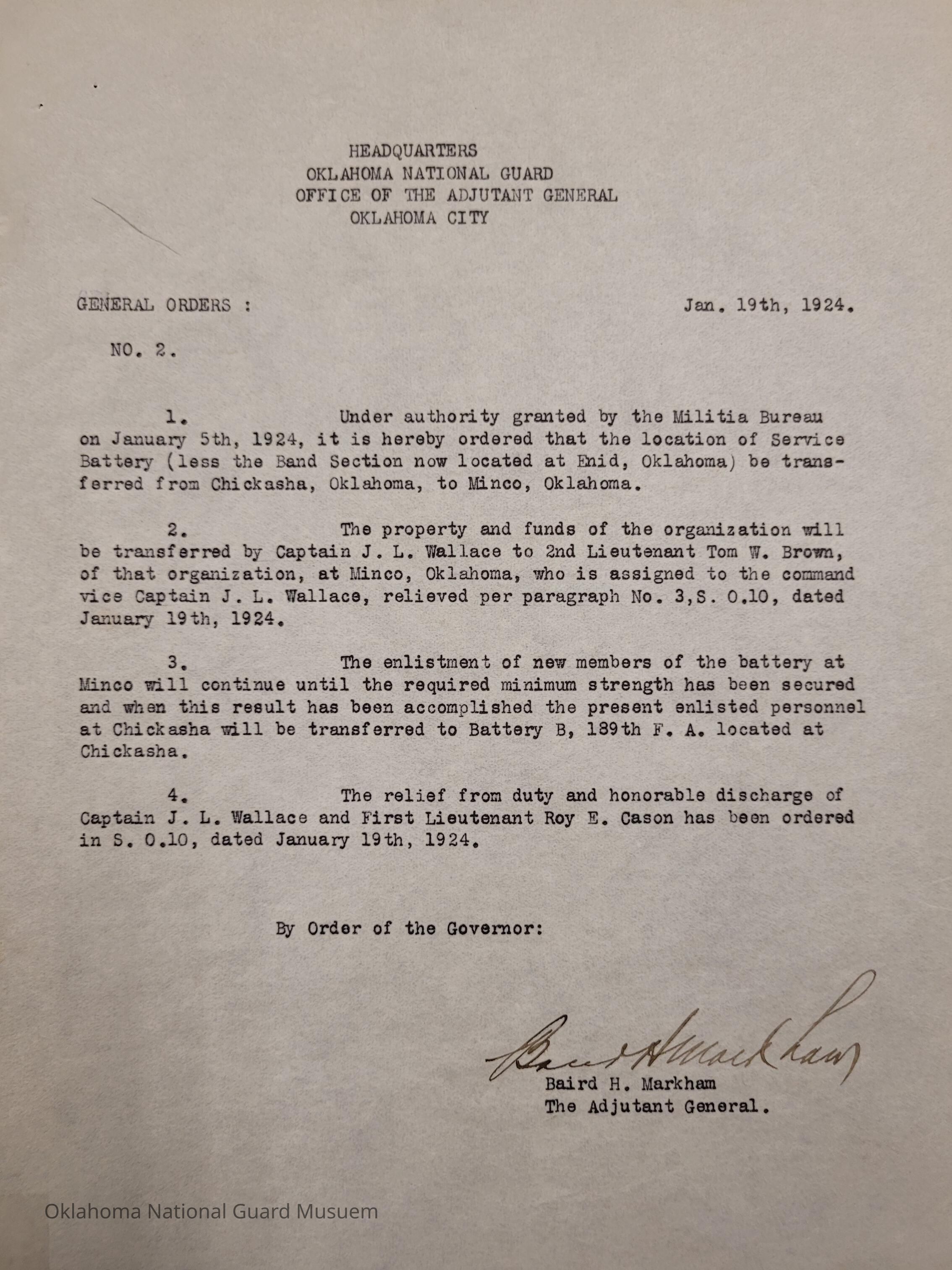 Adjutant General, Oklahoma City, Baird H. Markham, Service Battery, Band Section, Transfer, Chickasha, Minco, J.L. Wallace, Tom W. Brown, 189th Field Artillery, Roy E. Cason