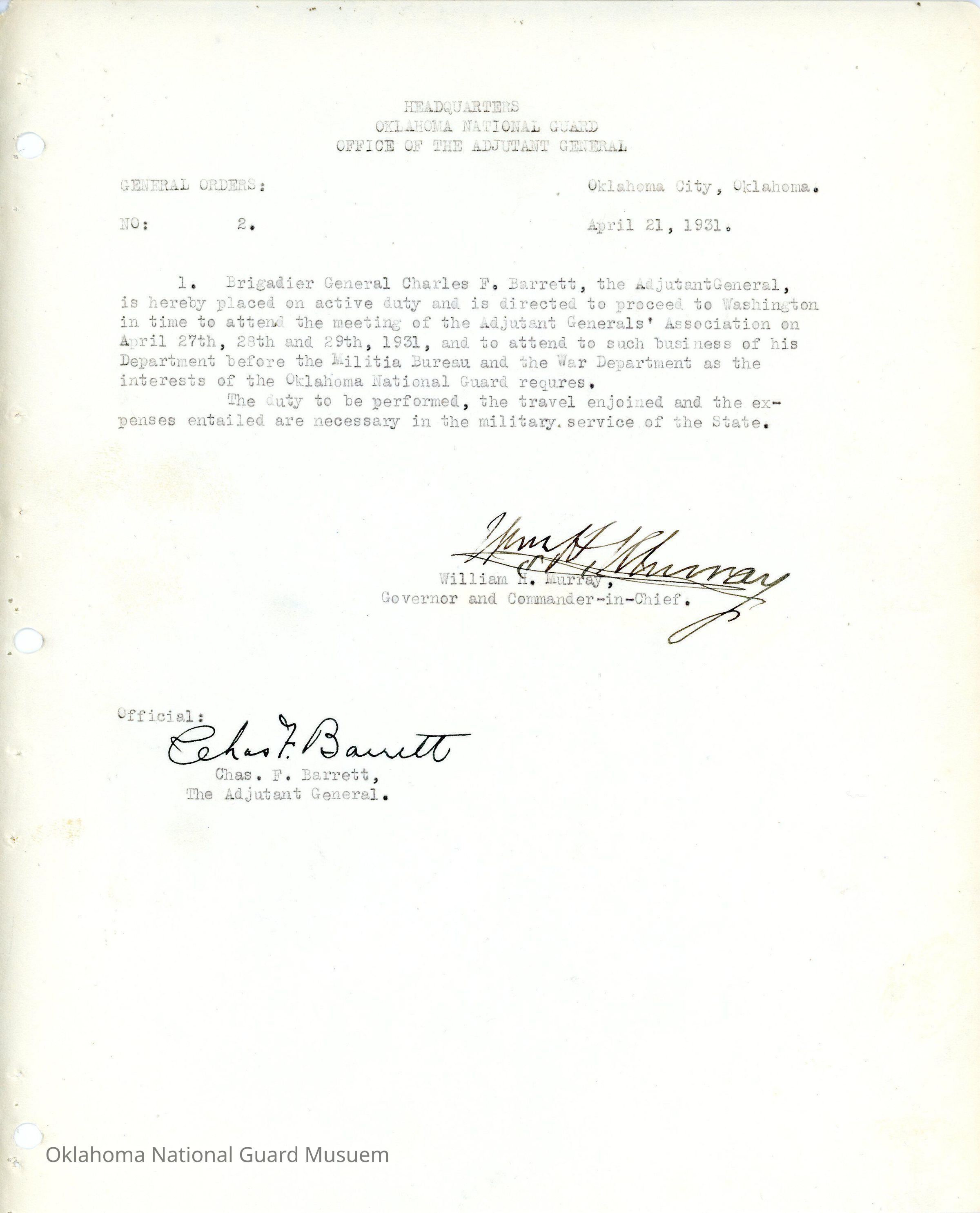 General Order #2 from Headquarters Adjutant General's Office in Oklahoma City. The order orders Charles F. Barrett to travel to Washington D.C. to attend a meeting of the Adjutant Generals AssociationDate(s) of Creation