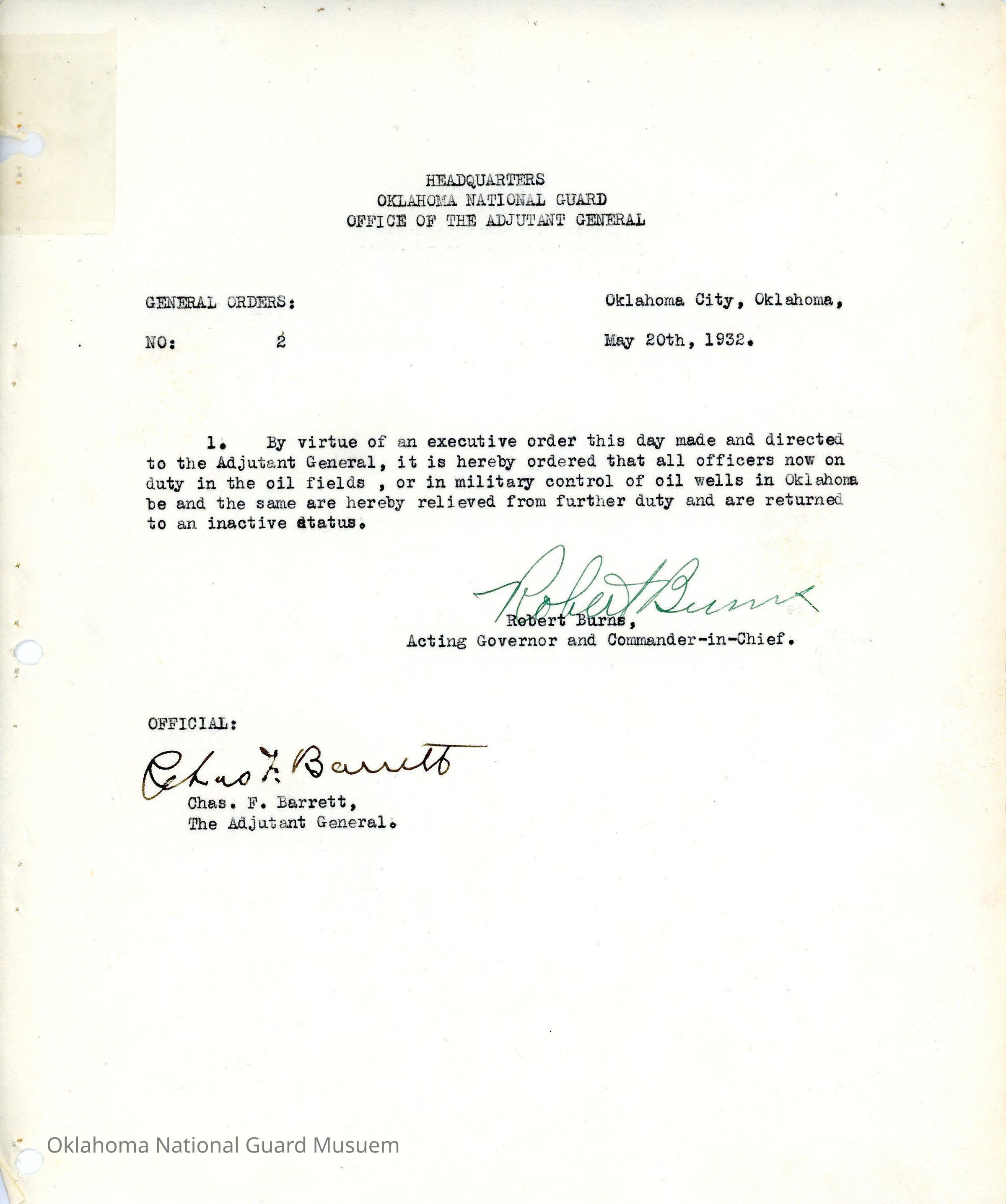 General Order #2 from Headquarters Adjutant General's Office in Oklahoma City. The order orders all officers on duty in the oil fields or in military control of the oil wells to be relieved from further dutyDate(s) of Creation