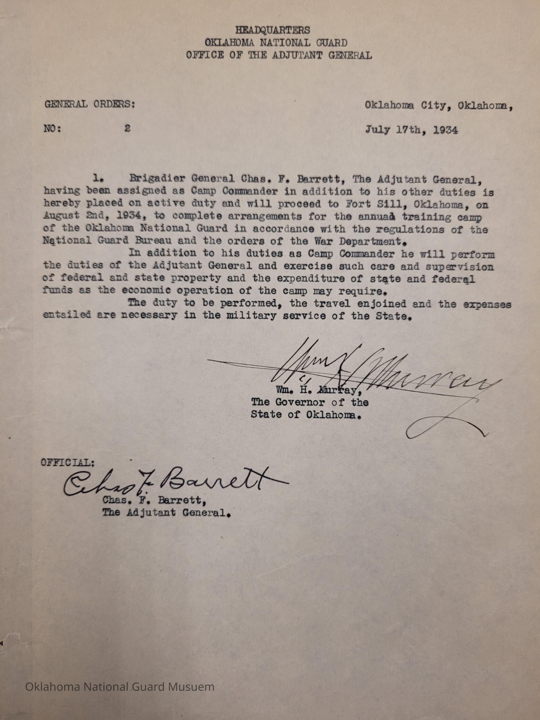 General Order #2 from Headquarters Adjutant General's Office in Oklahoma City. The order places Charles F. Barrett on active duty to complete the arrangements for the annual Camp of InstructionDate(s) of Creation