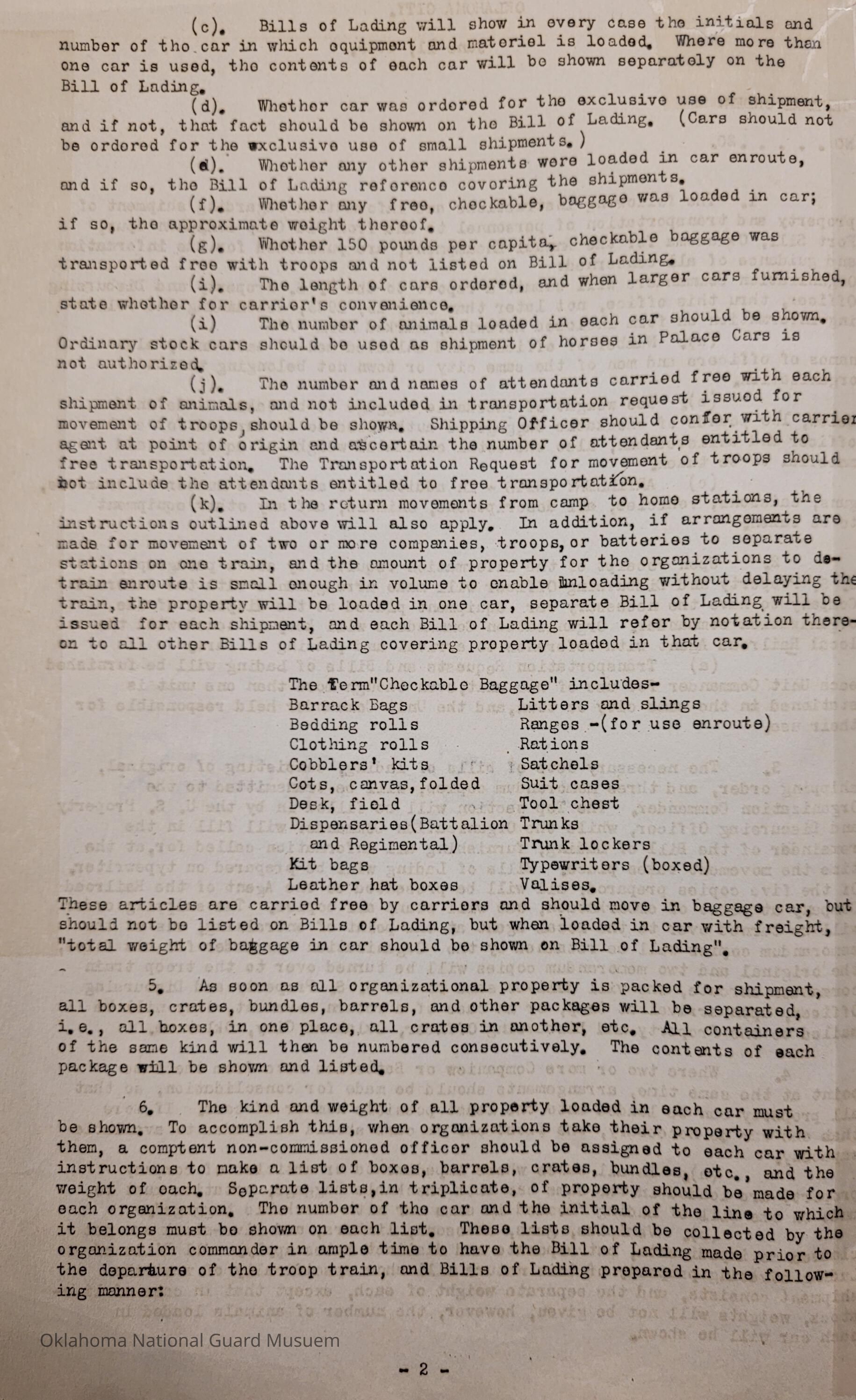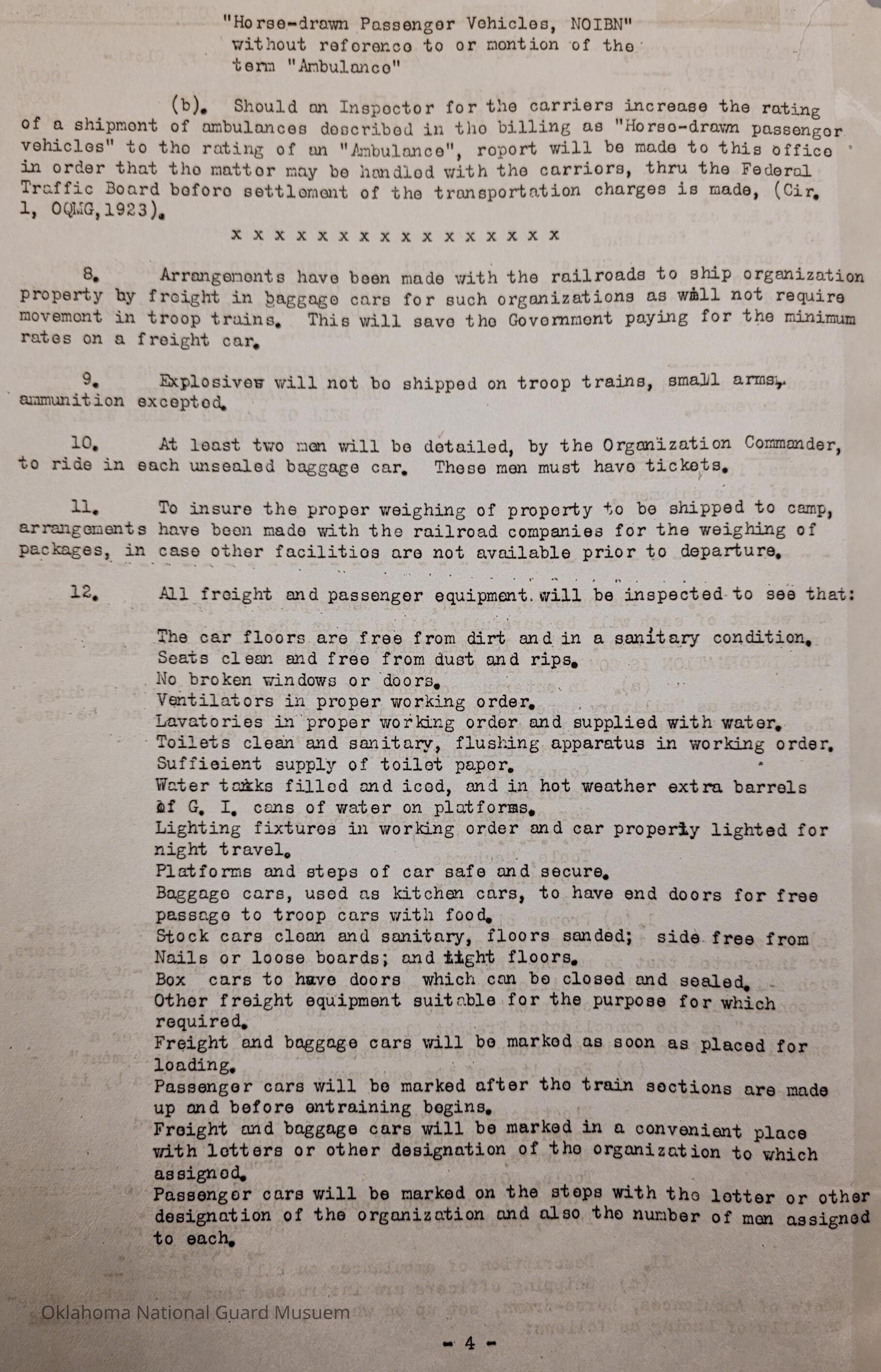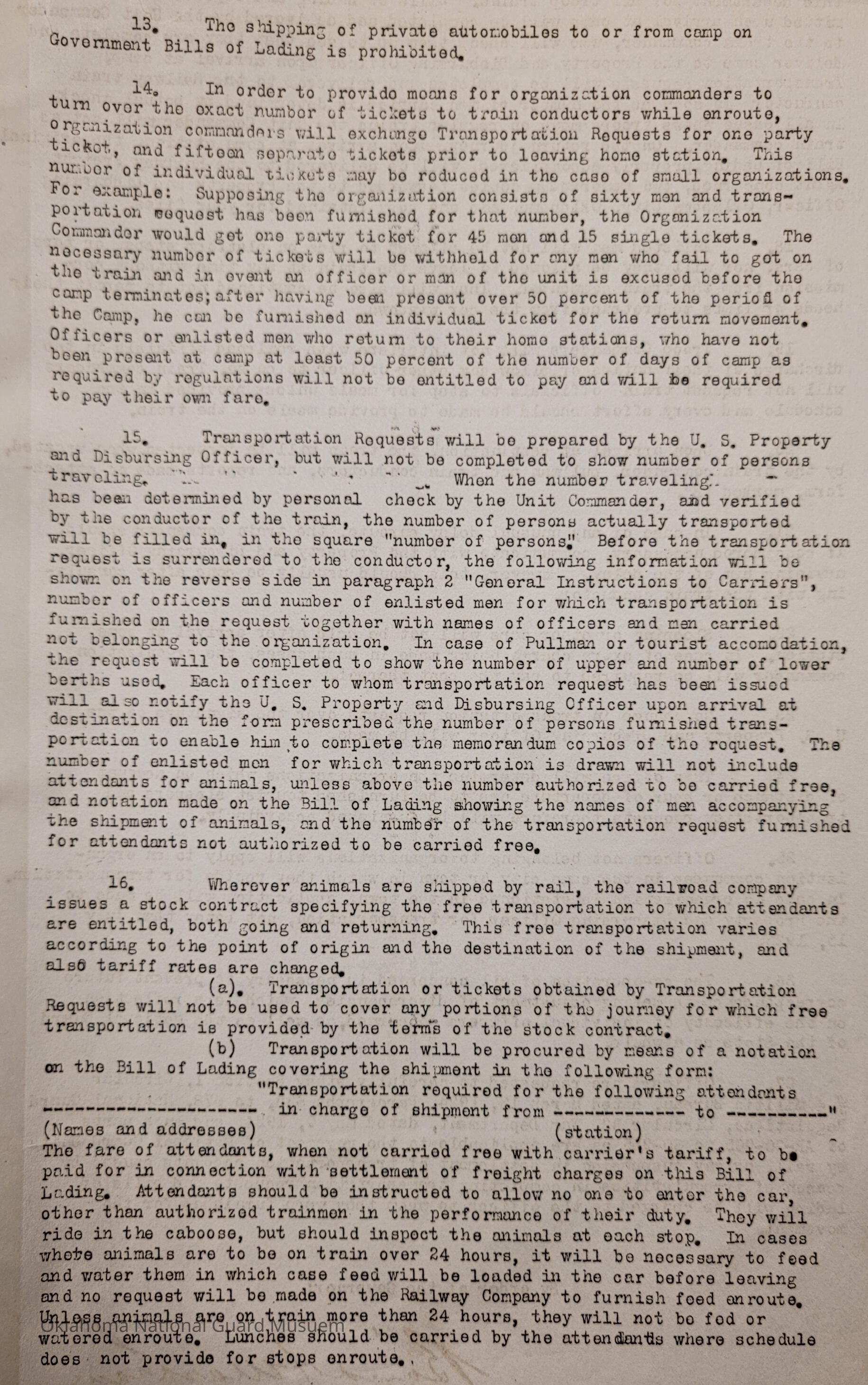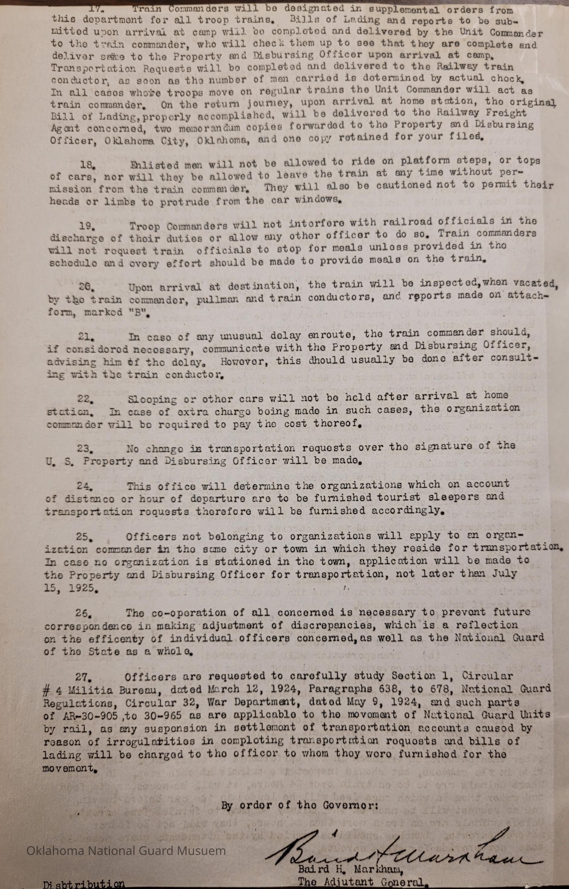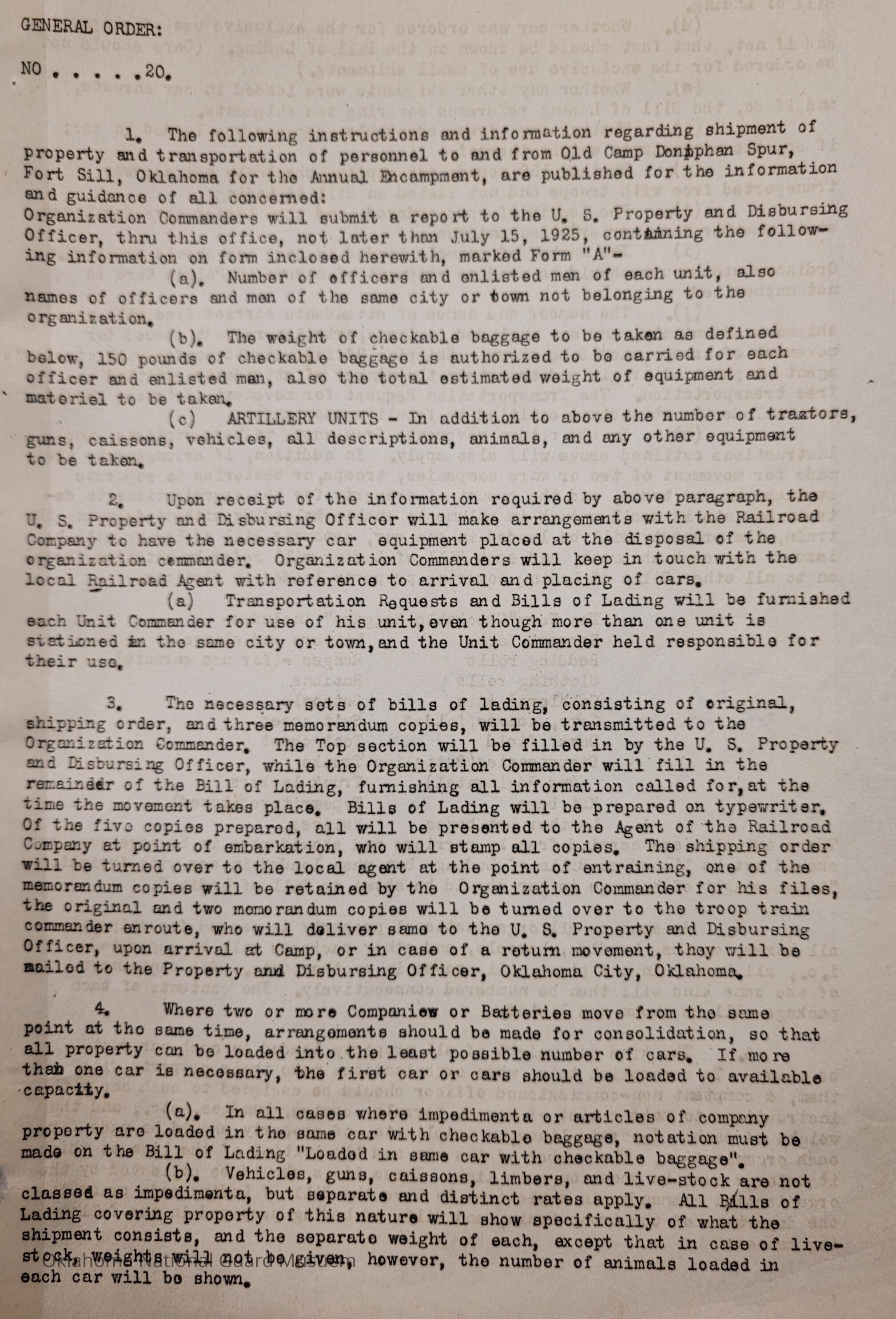 General Order #20 from Headquarters Adjutant General's Office in Oklahoma City. The order details how personnel should ship their property to Old Camp Doniphan for the Annual Encampment at Fort Sill.Date(s) of Creation