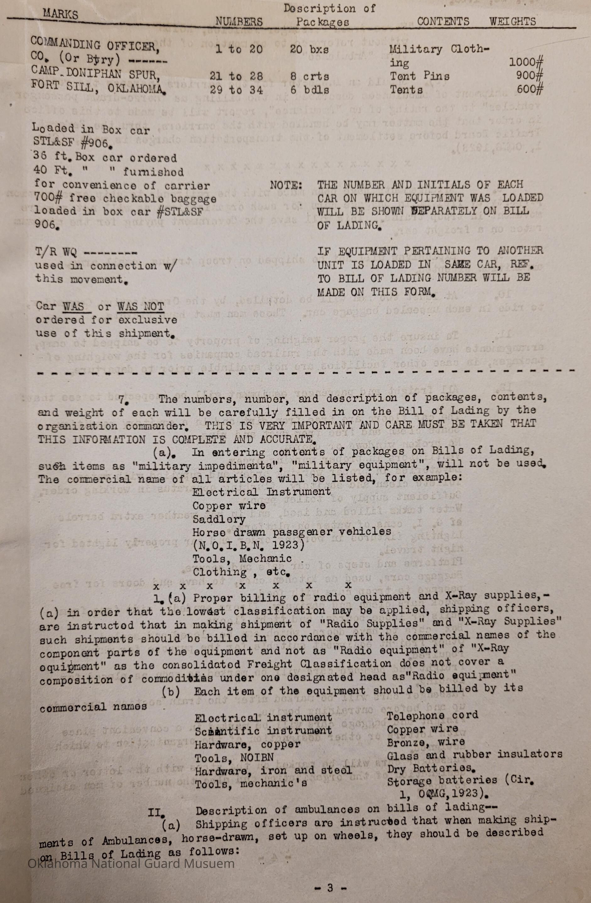 Adjutant General, Oklahoma City, Baird H. Markham, 45th Division, Camp of Instruction, Old Camp Doniphan Spur, Fort Sill, Equipment, Property, Shipping, Transportation