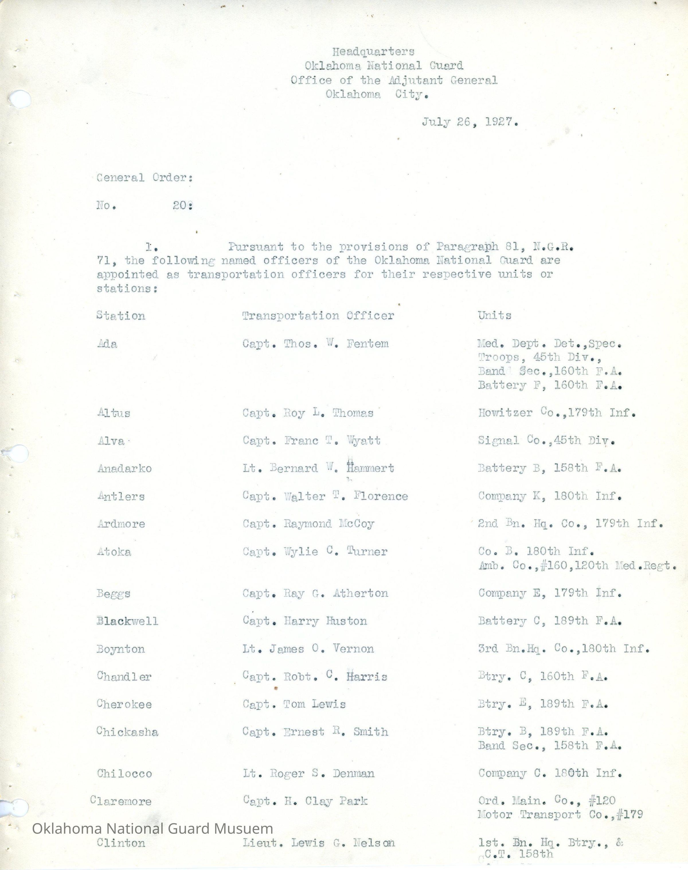 General Order #20 from Headquarters Adjutant General's Office in Oklahoma City. The order designates transportation officers and their respective units and stationsDate(s) of Creation