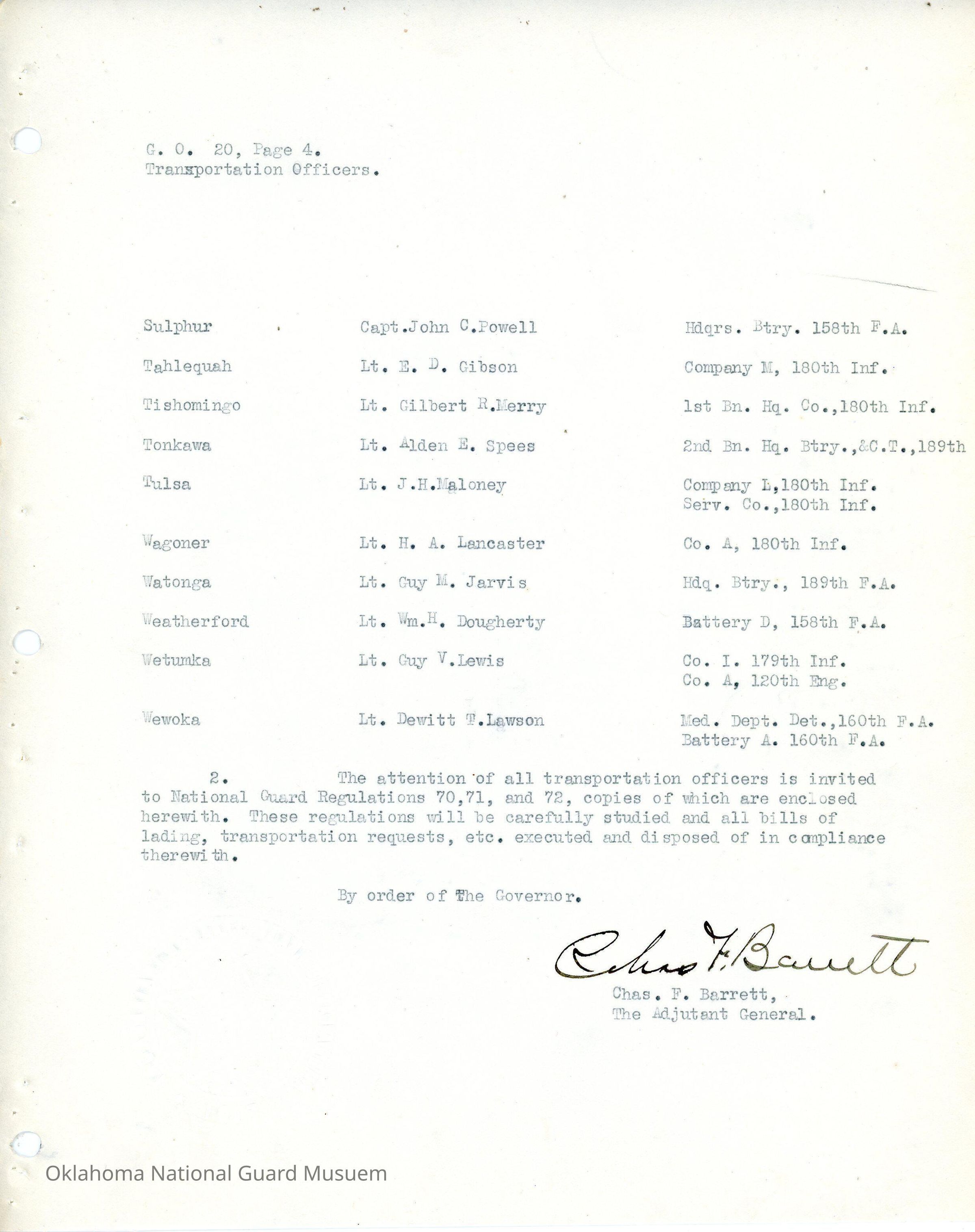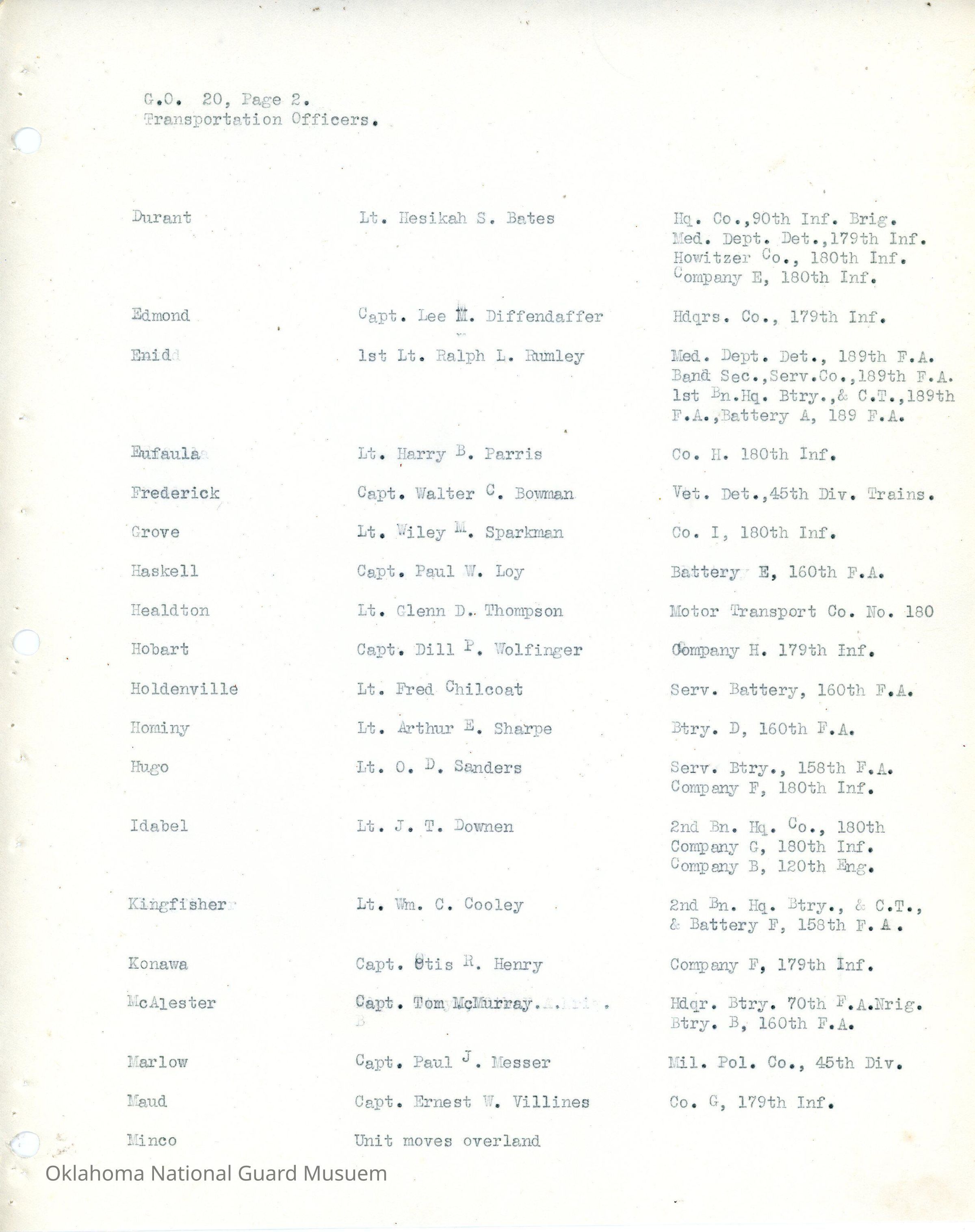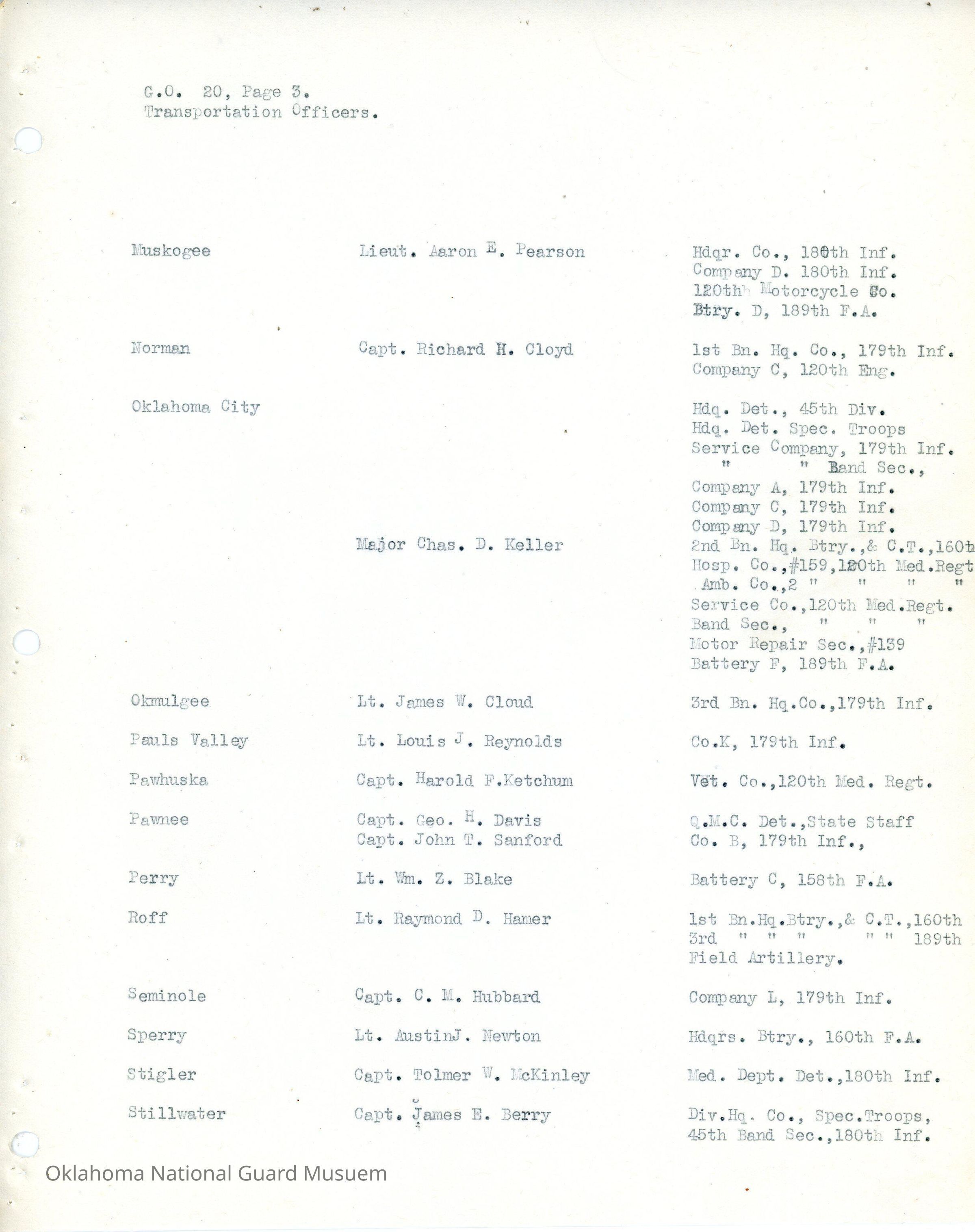 Adjutant General, Oklahoma City, Charles F. Barrett, Transportation officers, Ada, Thomas W. Fentem, 160th Field Artillery, 45th Division, Band, Altus, Roy L. Thomas, 179th Infantry, Alva, Franc T. Wyatt, 45th Signal Company, Anadarko, Bernard W. Hammert, 158th Field Artillery, Antlers, Walter T. Florence, 180th Infantry, Ardmore, Raymond McCoy, Atoka, Wylie C. Turner, 120th Medical Regiment, Beggs, Ray G. Atherton, Blackwell, Harry Huston, 189th Field Artillery, Boynton, James O. Vernon, Chandler, Robert C. Harris, Cherokee, Tom Lewis, Chichasha, Ernest R. Smith, Chilocco, Roger S. Denman, Claremore, H. Clay Park, 120th Motor Transport Company, Clinton, Lewis G. Nelson, Durant, Hesikah S. Bates, 90th Infantry Brigade, Edmond, Lee M. Diffendaffer, Enid, Ralph L. Rumley, Eufaula, Harry B. Parris, Frederick, Walter C. Bowman, 45th Division Trains, Grove, Wiley M. Sparkman, Haskell, Paul W. Loy, Healdton, Glenn D. Thompson, Hobart, Dill P. Wolfinger, Holdenville, Fred Chilcoat, Hominy, Arthur E. Sharpe, Hugo, O.D. Sanders, Idabel, J.T. Downen, 120th Engineers, Kingfisher, William C. Cooley, Konawa, Otis R. Henry, McAlester, Tom McMurray, 70th Field Artillery Brigade, Marlow, Paul J. Messer, Military Police Company, Maud, Ernest W. Villines, Minco, Muskogee, Aaron E. Pearson, Norman, Richard H. Cloyd, Charles D. Keller, Okmulgee, James W. Cloud, Pauls Valley, Louis J. Reynolds, Pawhuska, Harold F. Ketchum, Pawnee, George H. Davis, John T. Sanford, Perry, William Z. Blake, Roff, Raymond D. Hamer, Seminole, C.M. Hubbard, Sperry, Austin J. Newton, Stigler, Tolmer W. McKinley, Stillwater, James E. Berry, 45th Band Section, Sulphur, John C. Powell, Tahlequah, E.D. Gibson, Tishomingo, Gilbert R. Merry, Tonkawa, Alden E. Spees, Tulsa, J.H. Maloney, Wagoner, H.A. Lancaster, Watonga, Guy M. Jarvis, Weatherford, William H. Dougherty, Wetumka, Guy V. Lewis, Wewoka, Dewitt T. Lawson