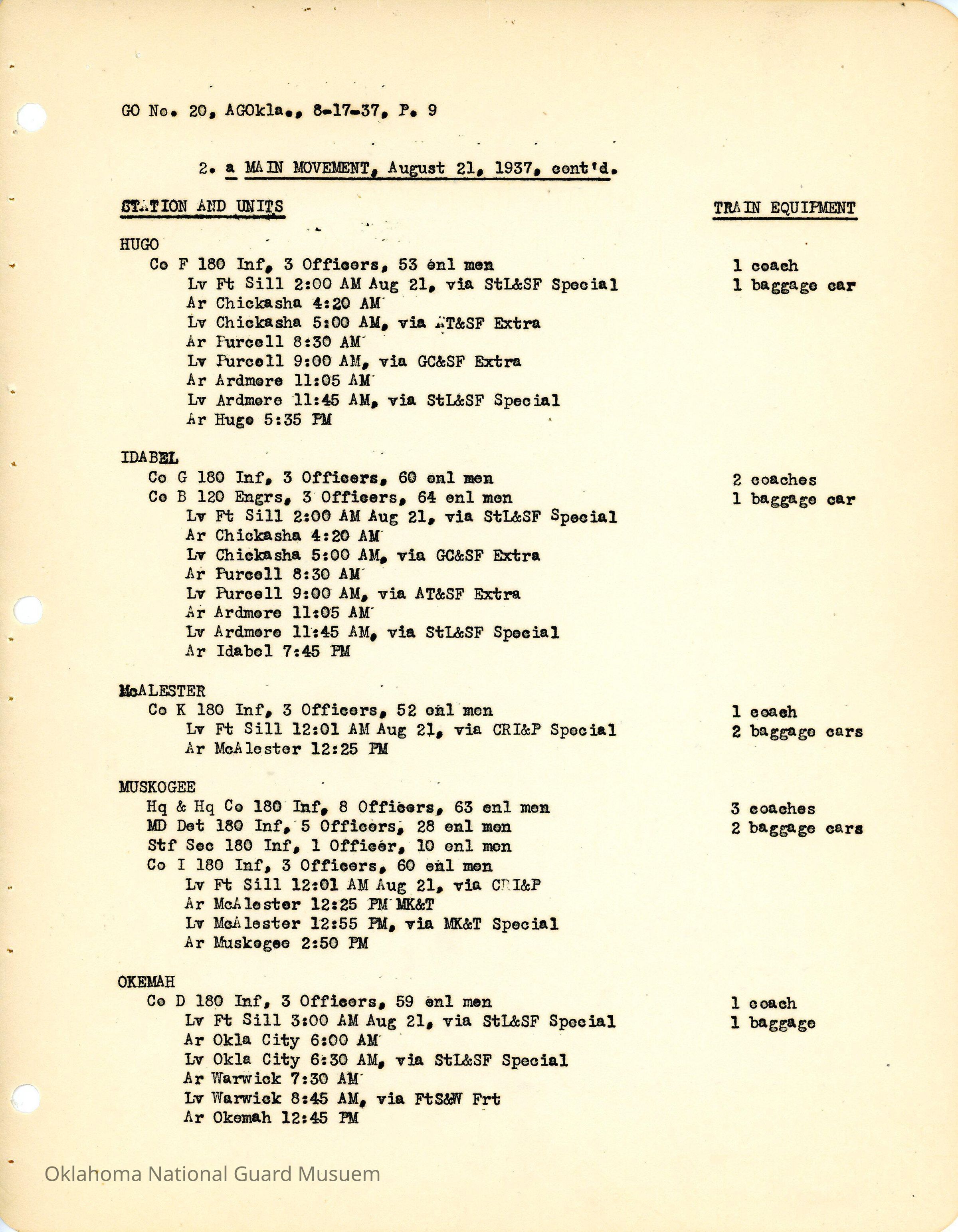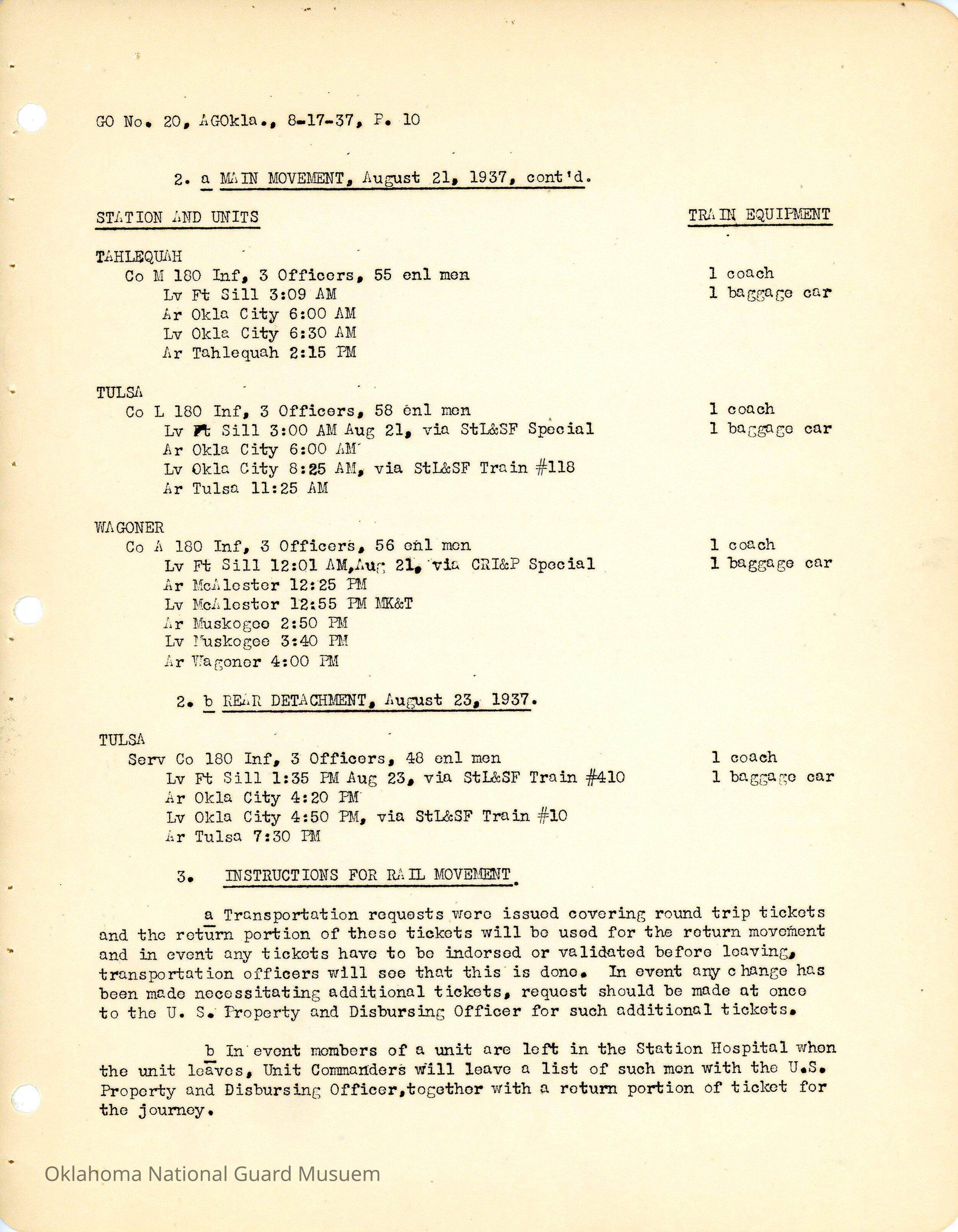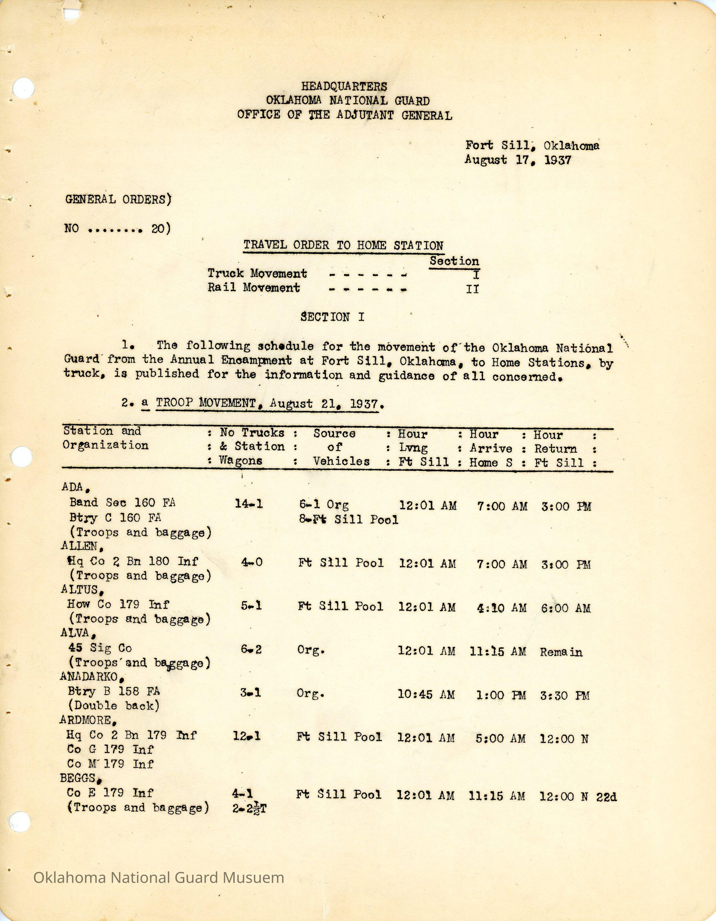 General Order #20 from Headquarters Adjutant General's Office in Oklahoma City. The order details the travel schedule by rail and train to home stations from Fort SillDate(s) of Creation