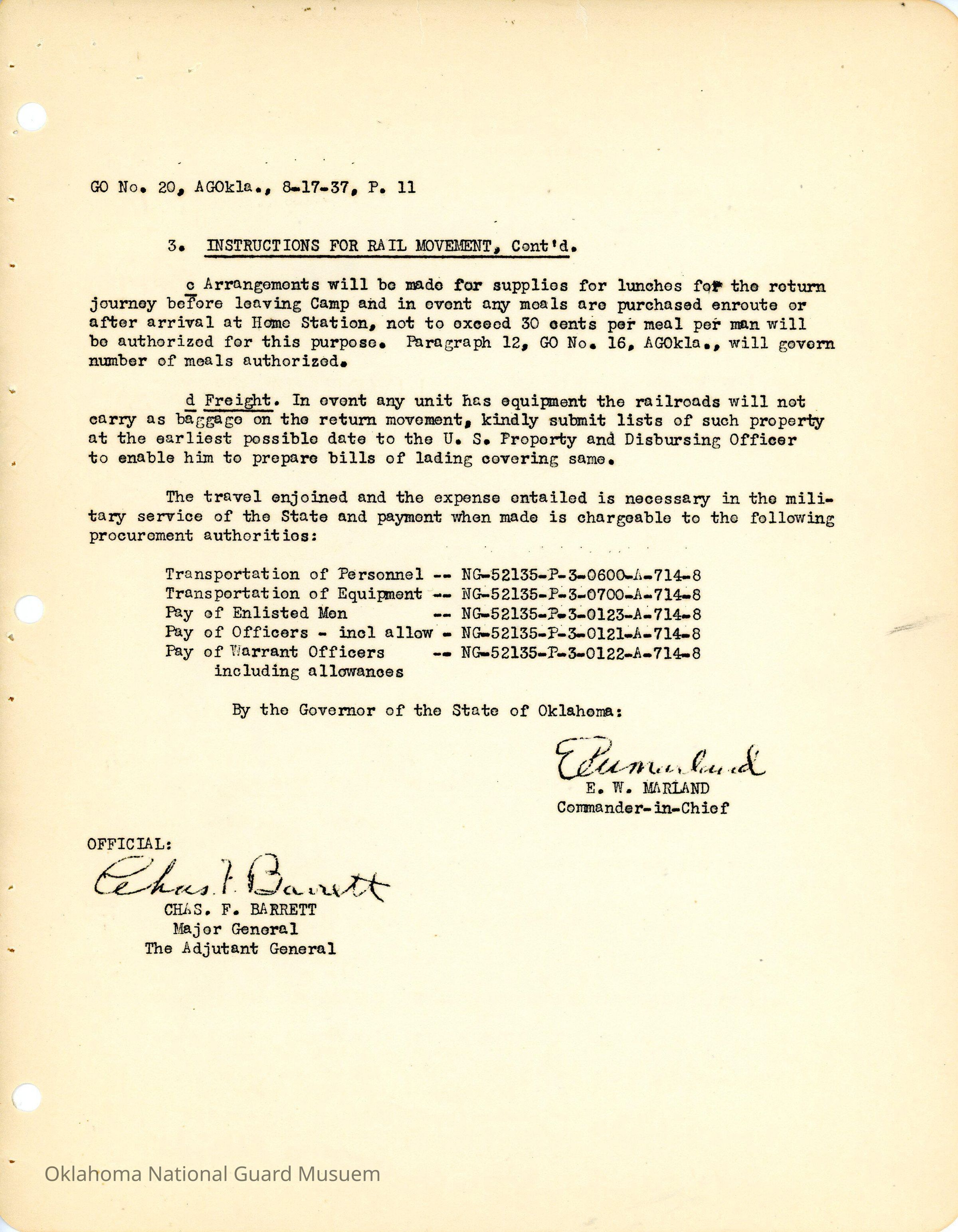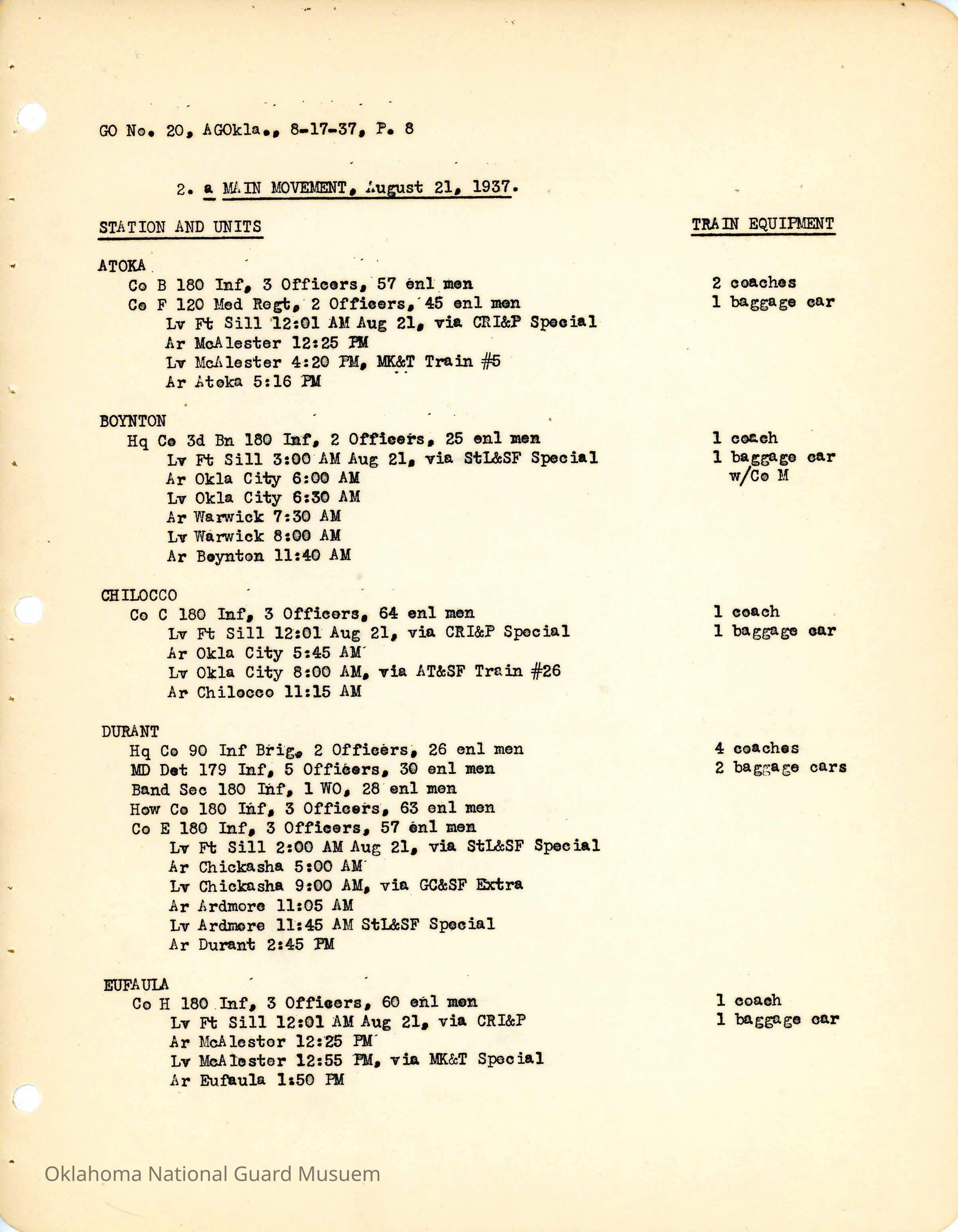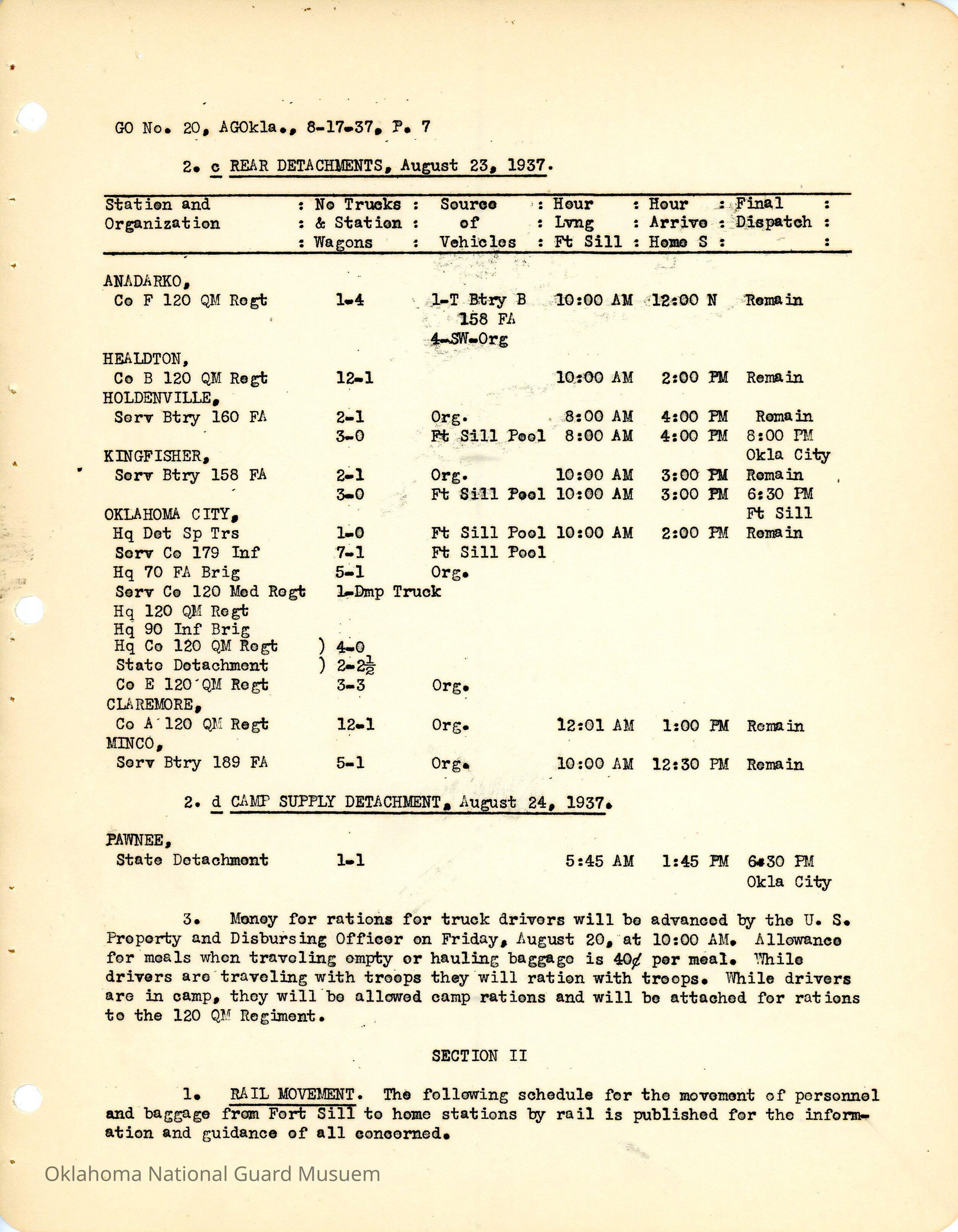 General Order #20 from Headquarters Adjutant General's Office in Oklahoma City. The order details the travel schedule by rail and train to home stations from Fort SillDate(s) of Creation