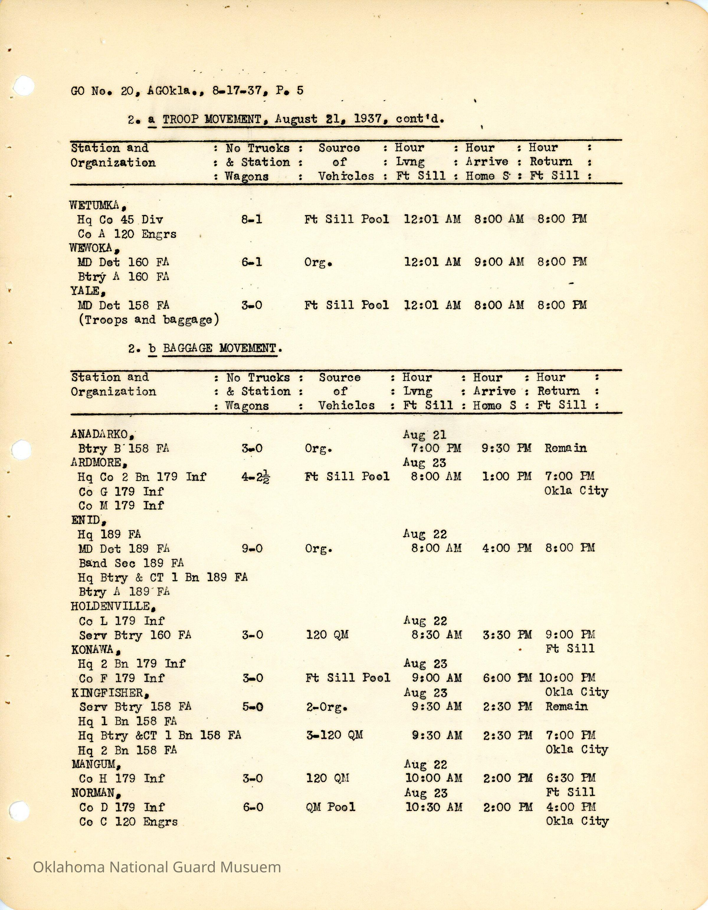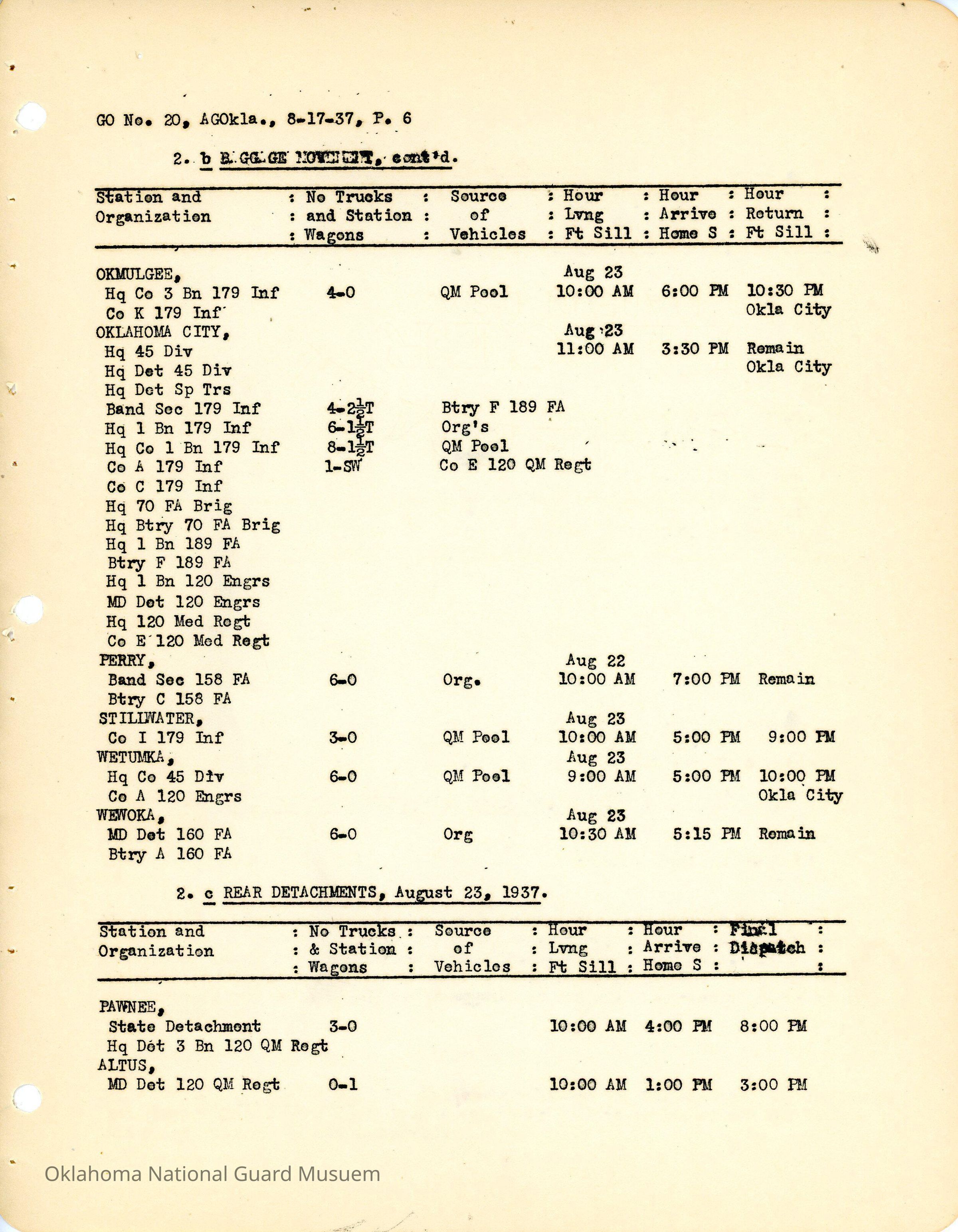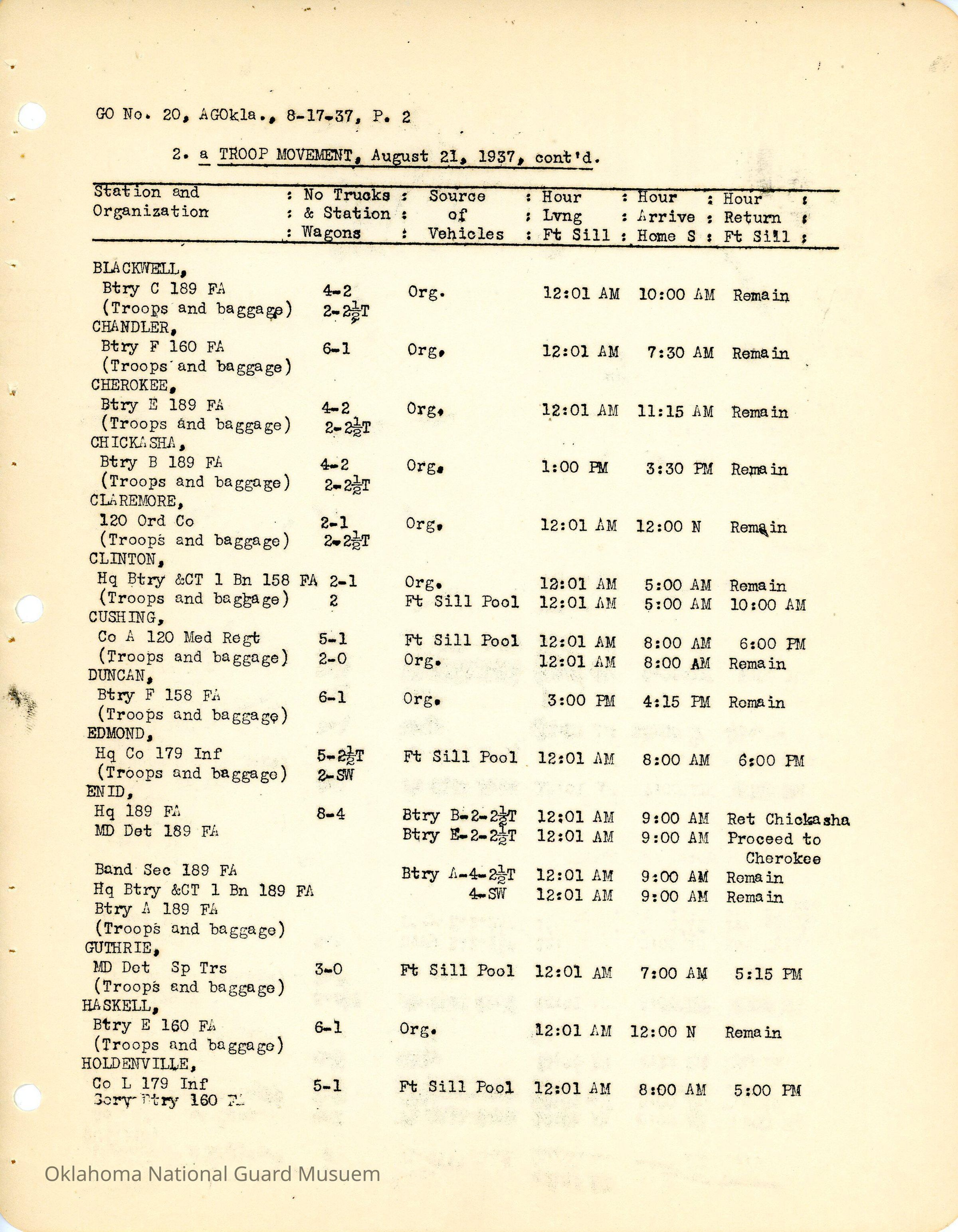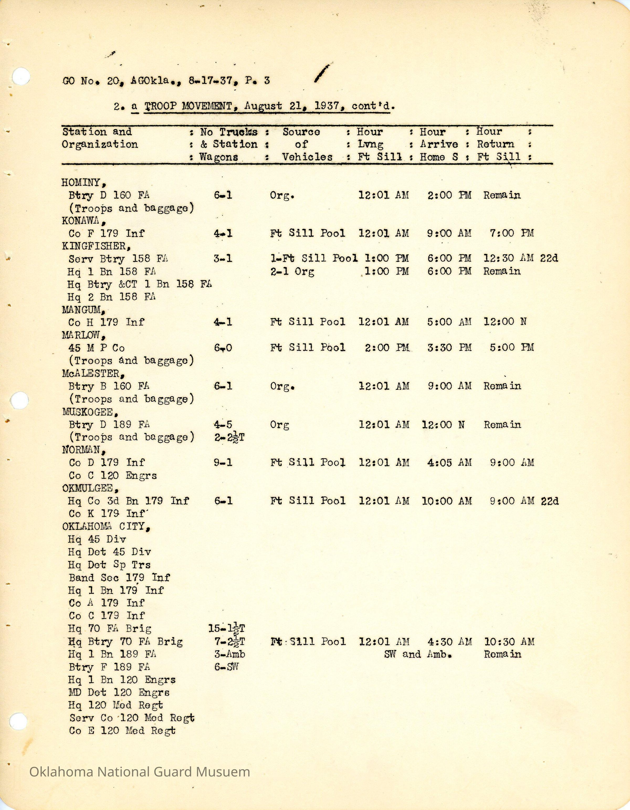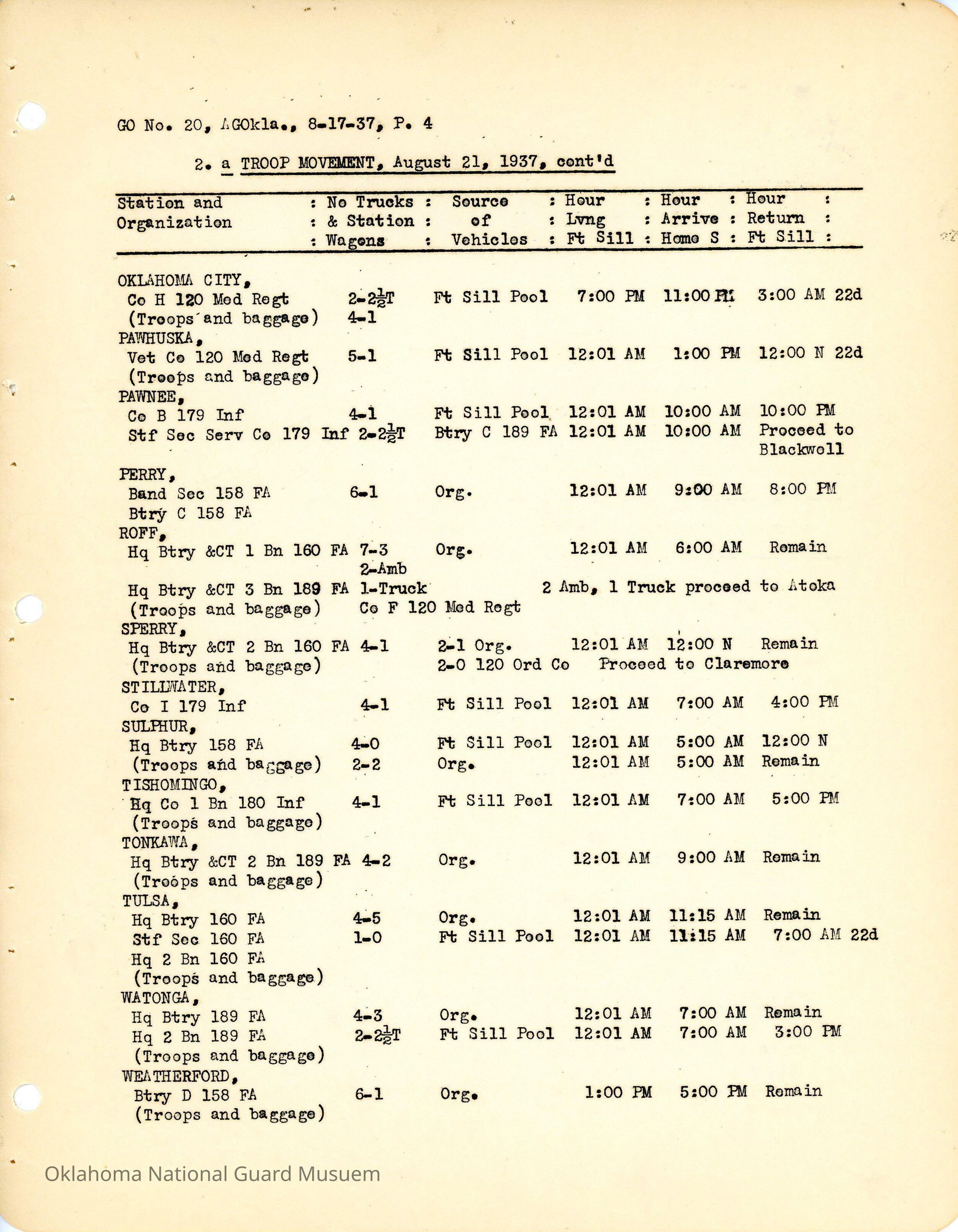 Adjutant General, Oklahoma City, Charles F. Barrett, E.W. Marland, Fort Sill, Camp General Henry W. Butner, Henry W. Butner, Annual Encampment, 120th Medical Regiment, 120th Quartermaster Regiment, 45th Signal Company, Transportation, 90th Infantry Brigade, 70th Field Artillery Brigade, 179th Infantry, 180th Infantry, 158th Field Artillery, 160th Field Artillery, 189th Field Artillery, 120th Medical Regiment, 120th Engineers, Travel, Altus, Anadarko, Healdton, Holdenville, Kingfisher, Pawnee, Claremore, Minco, Ada, Ardmore, Beggs, Clinton, Cushing, Edmond, Enid, Guthrie, Holdenville, Konawa, Mangum, Marlow, Norman, Okmulgee, Pawhuska, Perry, Sperry, Stillwater, Tishomingo, Tulsa, Wetumka, Wewoka, Yale, Allen, Blackwell, Chandler, Cherokee, Chickasha, Alva, Duncan, Haskell, Hominy, McAlester, Muskogee, Roff, Sulphur, Tonkawa, Weatherford, Boynton, Chilocco, Durant, Eufaula, Hugo, Idabel, Okemah, Tahlequah, Wagoner