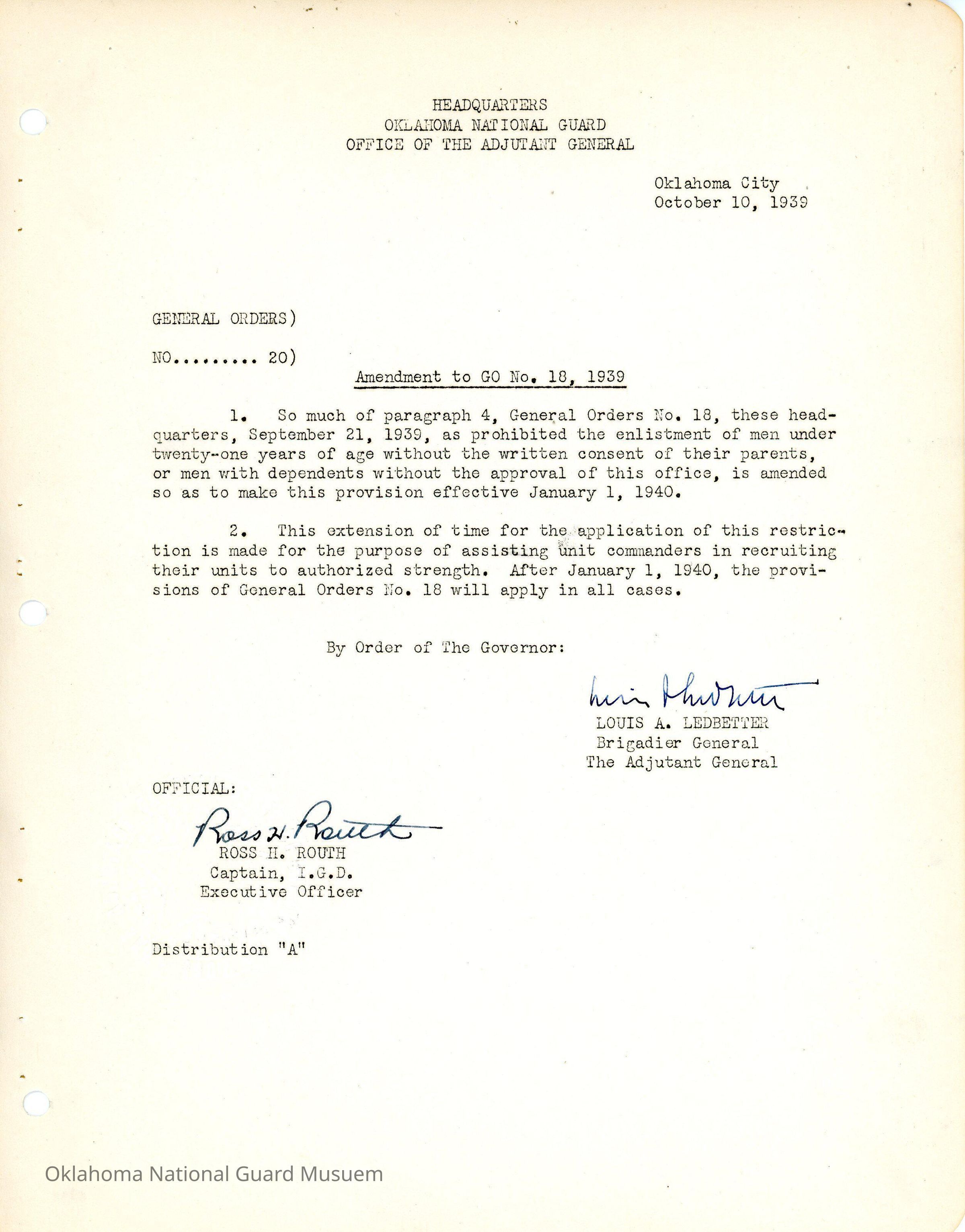General Order #20 from Headquarters Adjutant General's Office in Oklahoma City. The order amends paragraph four of General Order #18 1939. It prohibits the enlistment of anyone under the age of twenty-one from enlisting without the consent of their parents and makes that effective 1/1/1940Date(s) of Creation