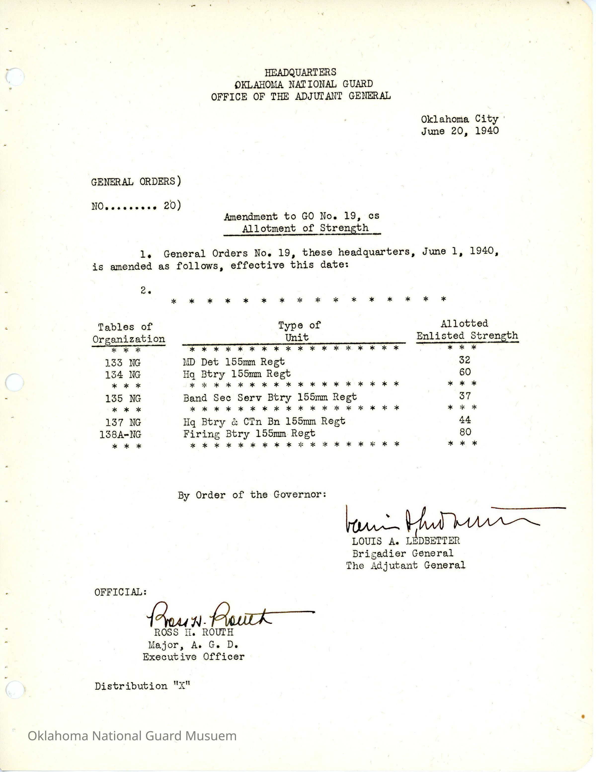 General Order #20 from Headquarters Adjutant General's Office in Oklahoma City. The order amends General Order #19 1940 and establishes new strength allotment numbers for the Oklahoma GuardDate(s) of Creation