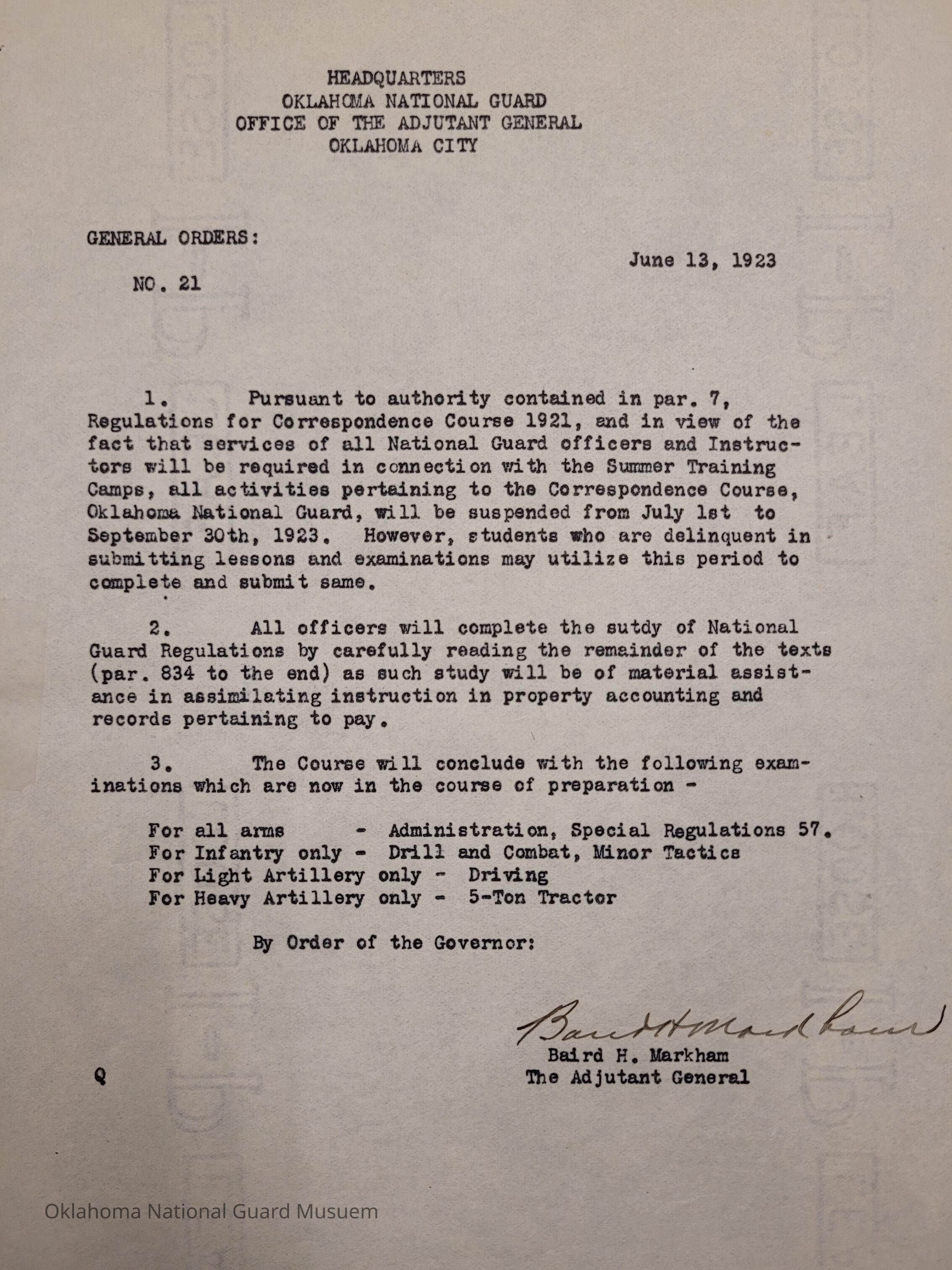 General Order #21 from Headquarters Adjutant General's Office in Oklahoma City. The order suspends the Correspondence Course from July to September 1923 because of Summer Training.Date(s) of Creation