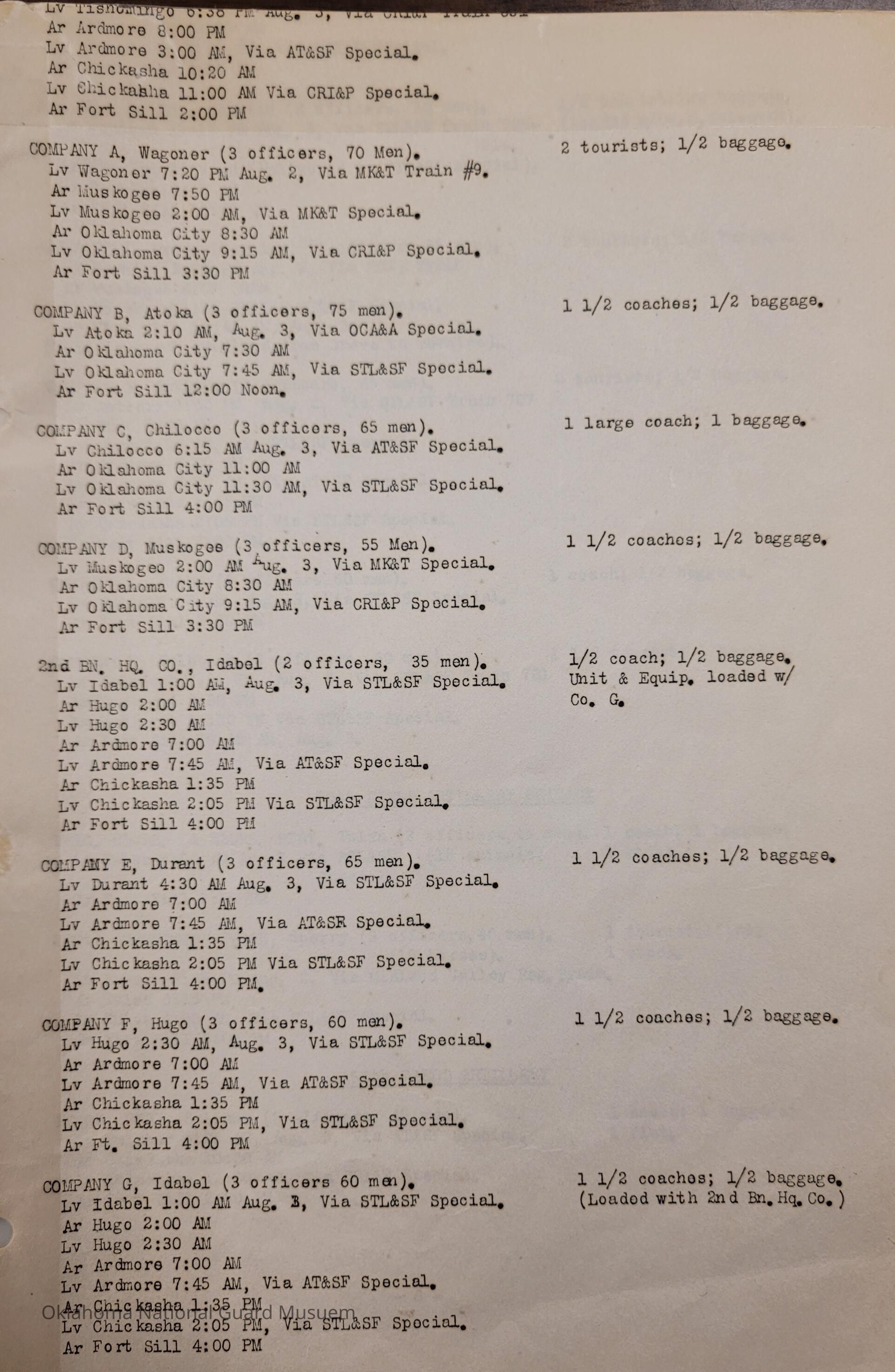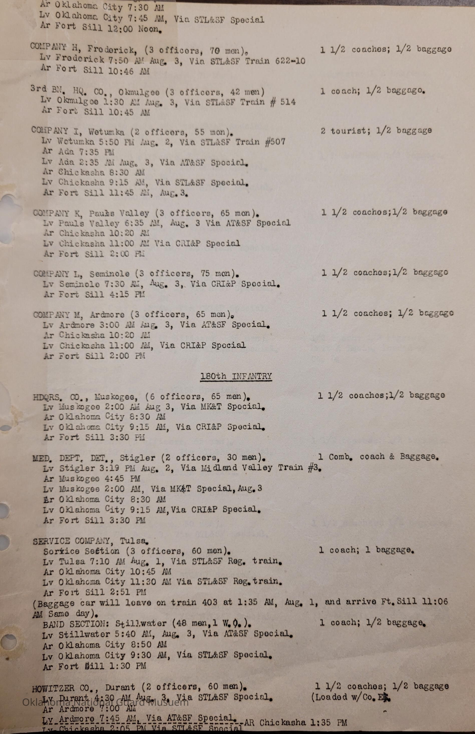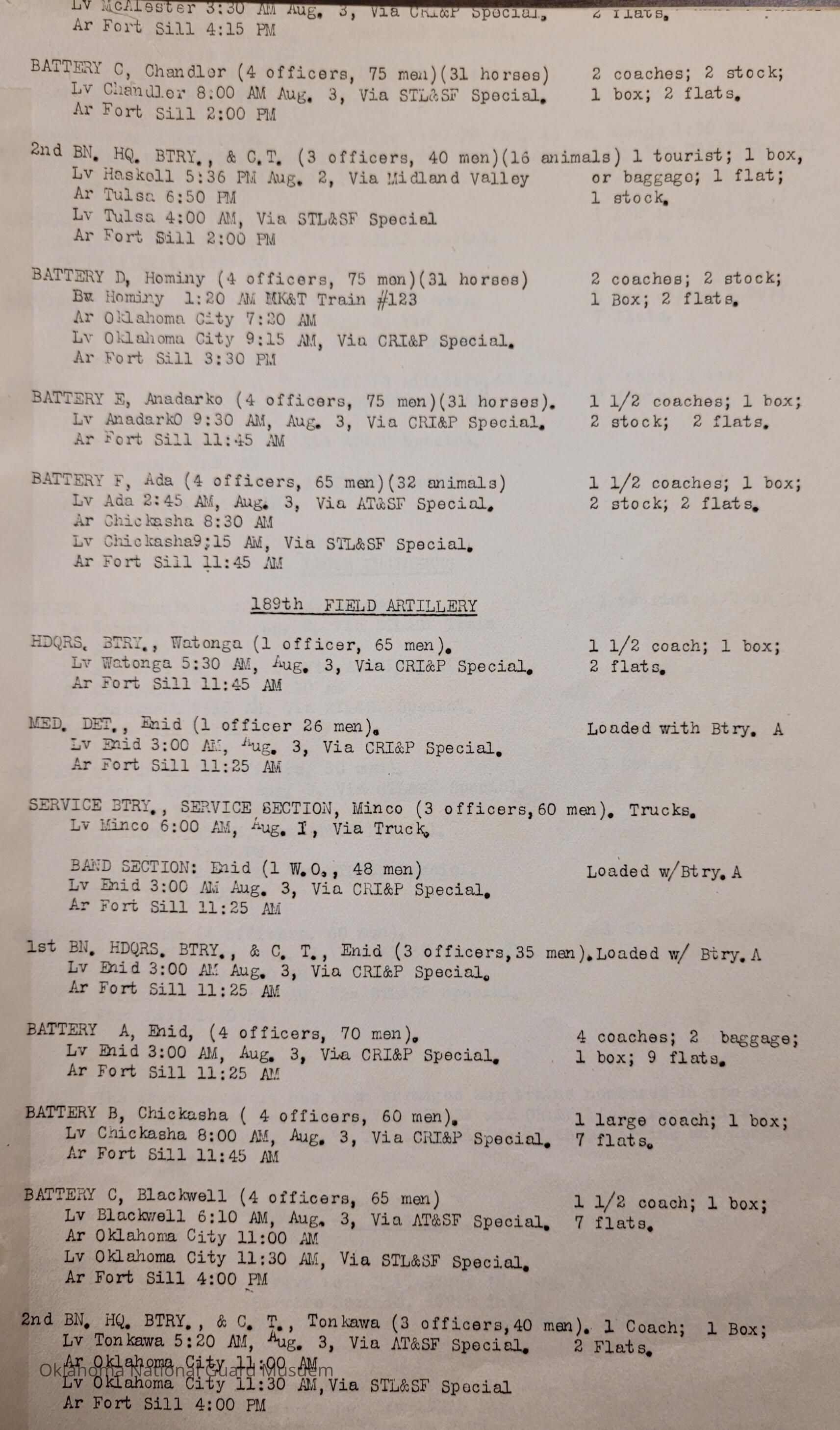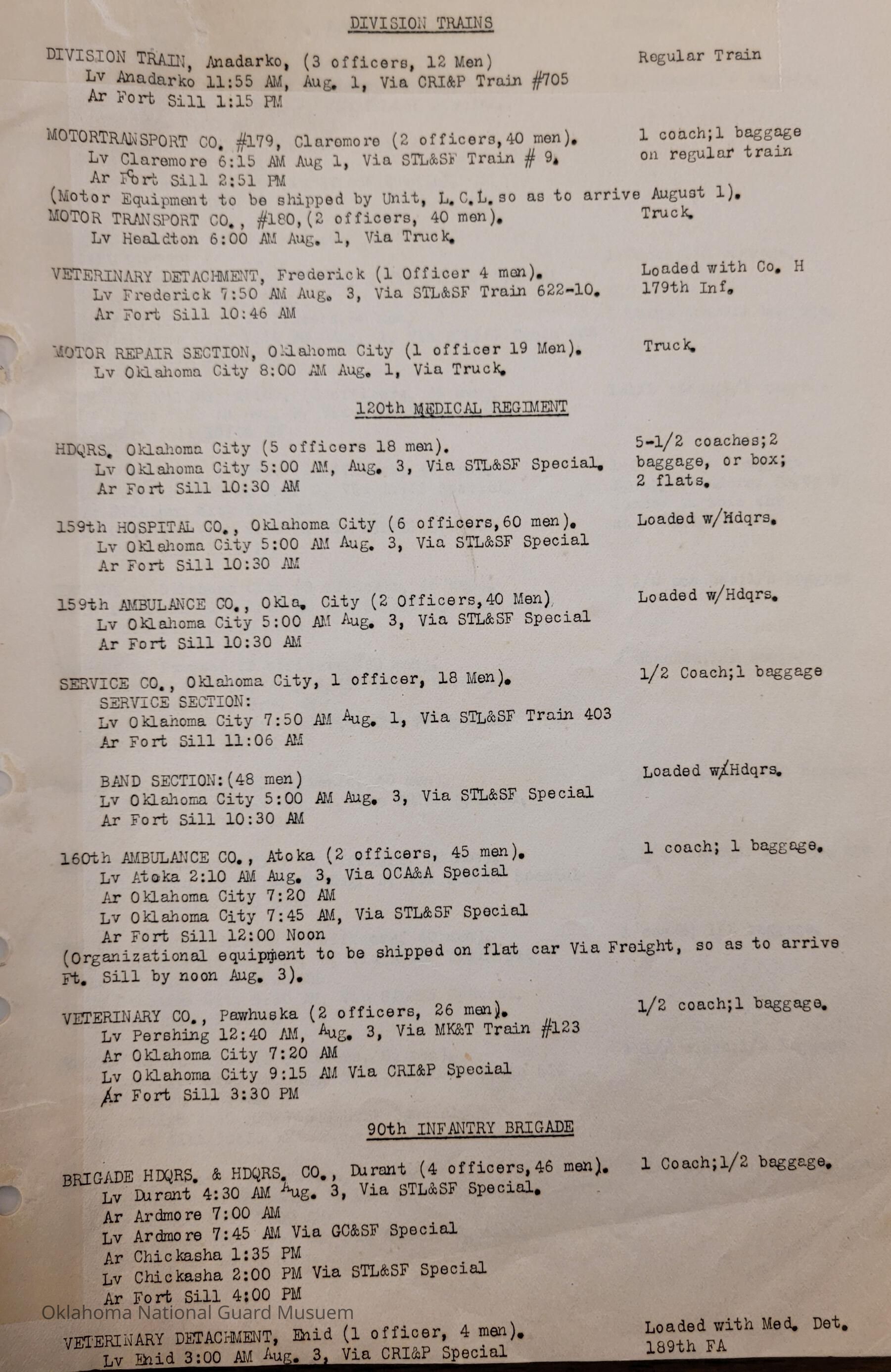 Adjutant General, Oklahoma City, Baird H. Markham, Camp of Instruction, Fort Sill, Train, Schedule, Railway, Transportation, Pawnee, Alva, Special Troops, Muskogee, Motorcycle Company, Claremore, Maud, Anadarko, Division Train, Healdton, Frederick, 120th Medical Regiment, Atoka, Band Section, Pawhuska, Pershing, 90th Infantry Brigade, Durant, Ardmore, Chickasha, Enid, Edmond, Altus, Guthrie, Elk City, Norman, Okmulgee, Konawa, Wetumka, Ada, Pauls Valley, Seminole, 180th Infantry, Stigler, Tulsa, Stillwater, Tishomingo, Wagoner, Chilocco, Idabel, Hugo, McAlester, Boynton, Sapulpa, Grove, Bernice, Antlers, Talequah, Sperry, Sulphur, 70th Field Artillery Brigade, 158th Field Artillery, Kingfisher, Weatherford, 160th Field Artillery, Holdenville, Wewoka, Roff, Chandler, Haskell, Hominy, Minco, Blackwell, Tonkawa, Cherokee, 179th Infantry