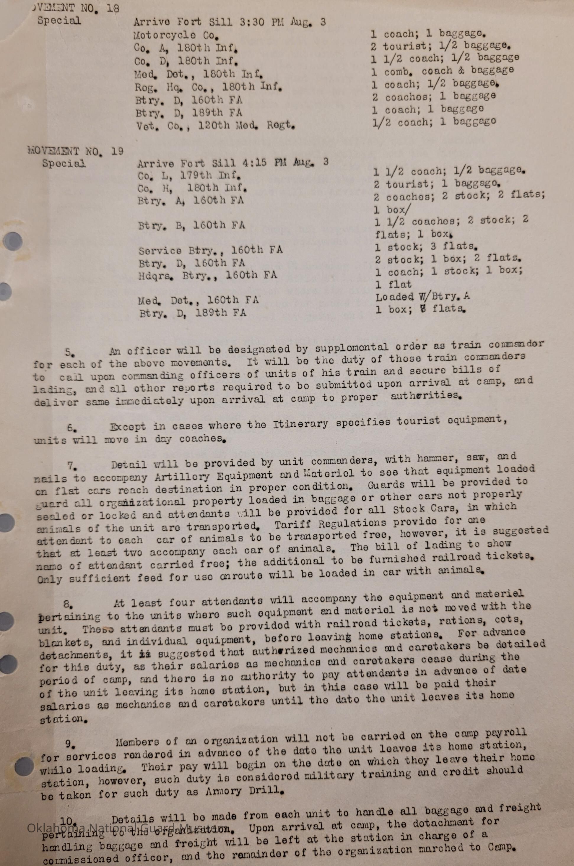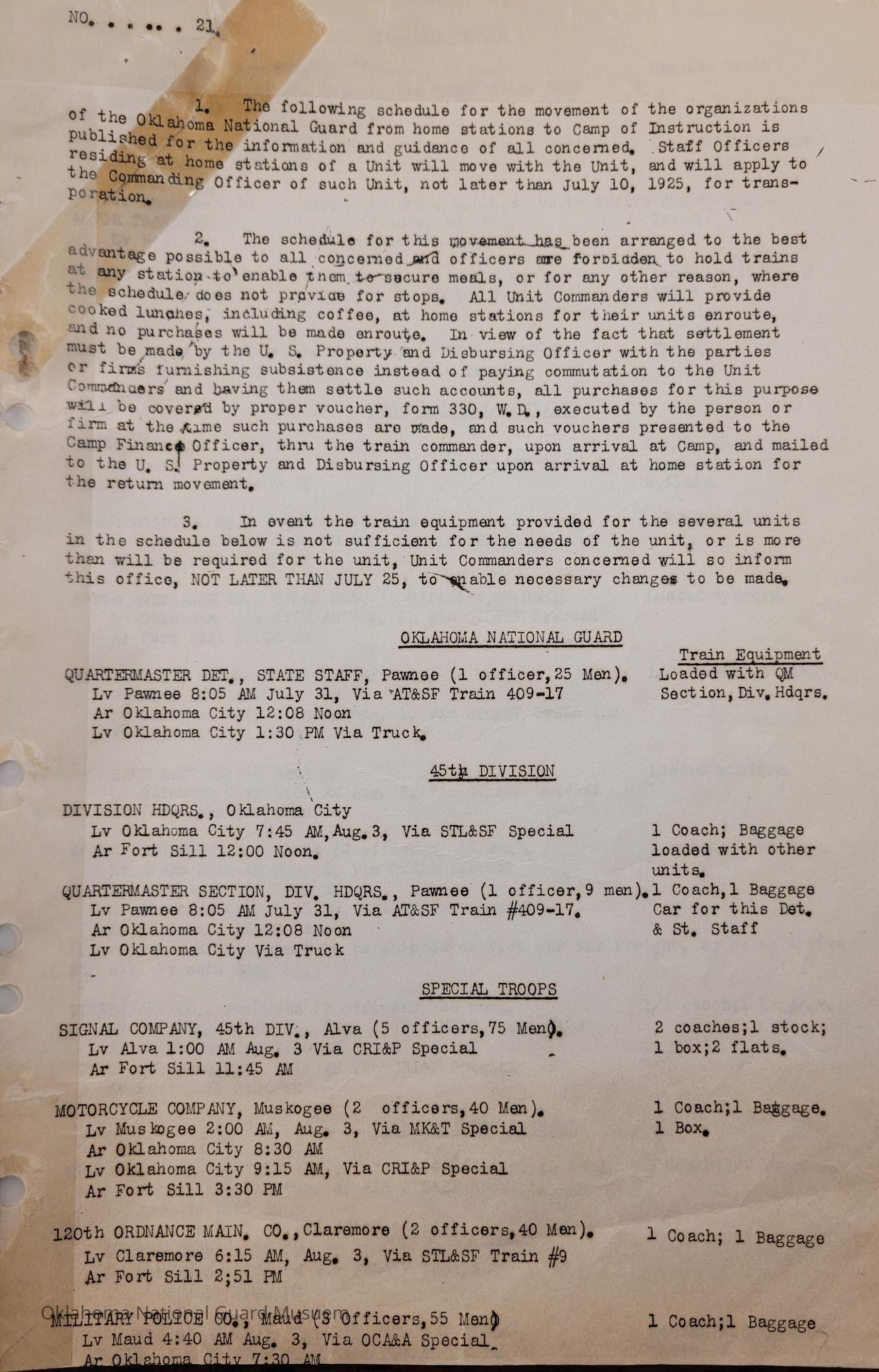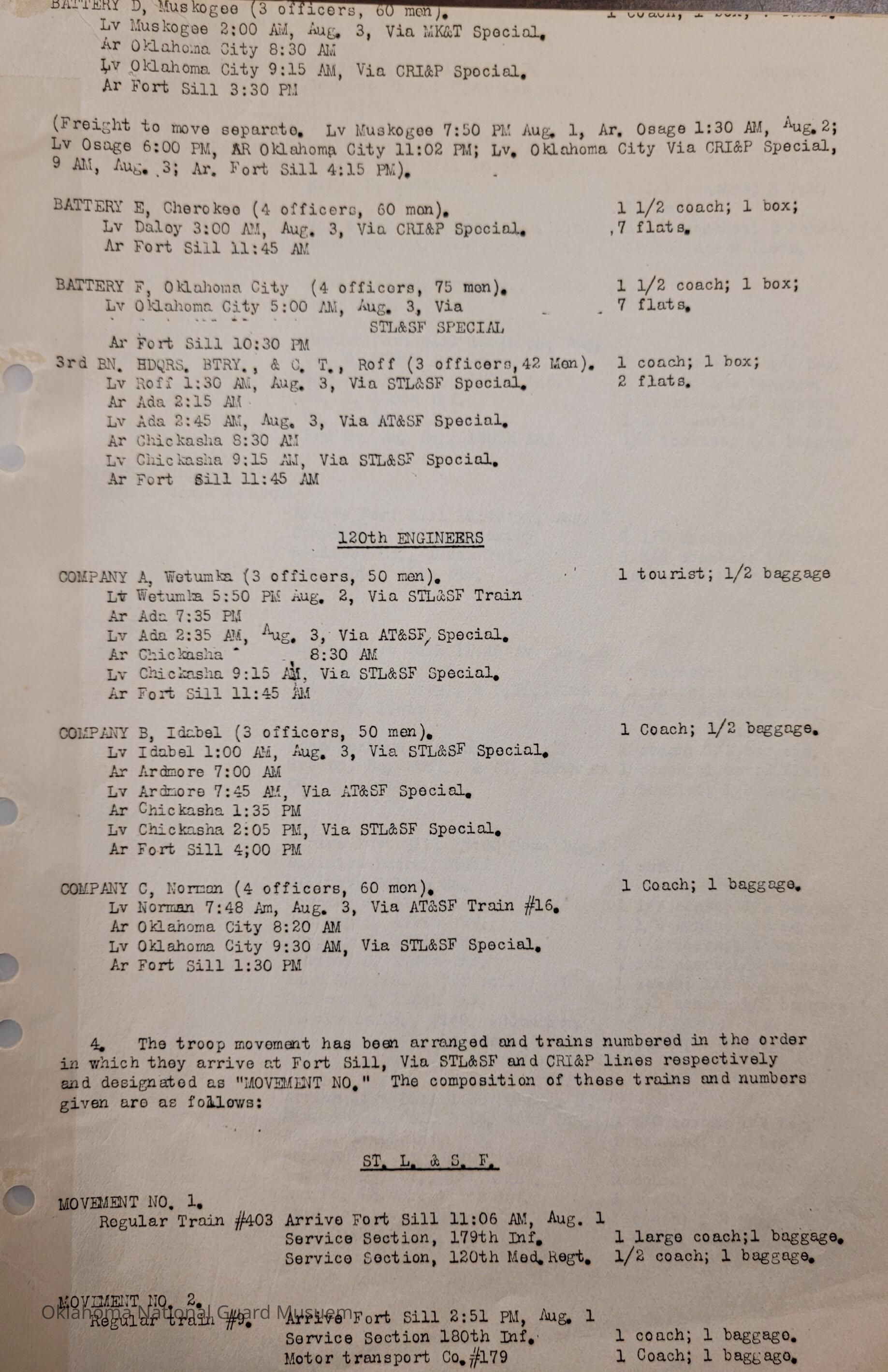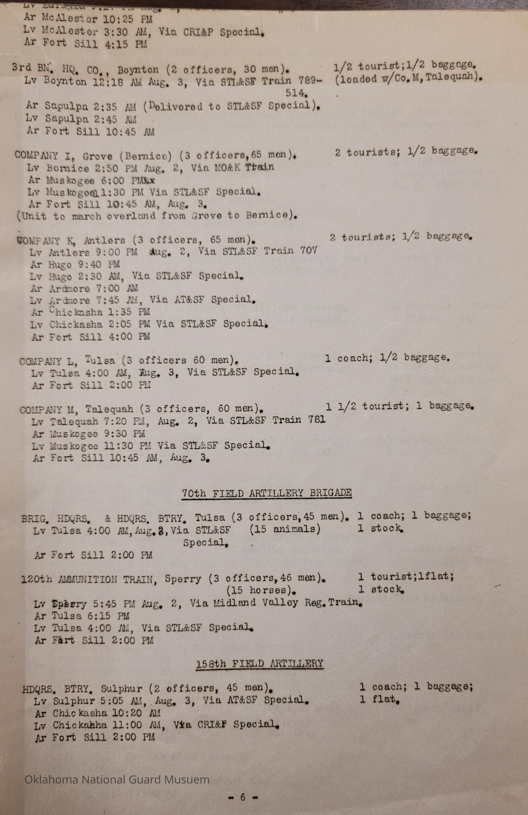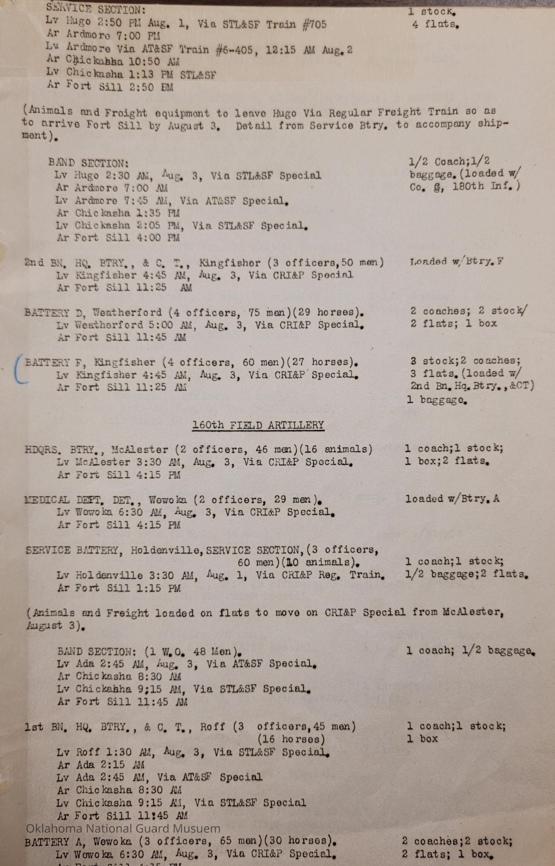Adjutant General, Oklahoma City, Baird H. Markham, Camp of Instruction, Fort Sill, Train, Schedule, Railway, Transportation, Pawnee, Alva, Special Troops, Muskogee, Motorcycle Company, Claremore, Maud, Anadarko, Division Train, Healdton, Frederick, 120th Medical Regiment, Atoka, Band Section, Pawhuska, Pershing, 90th Infantry Brigade, Durant, Ardmore, Chickasha, Enid, Edmond, Altus, Guthrie, Elk City, Norman, Okmulgee, Konawa, Wetumka, Ada, Pauls Valley, Seminole, 180th Infantry, Stigler, Tulsa, Stillwater, Tishomingo, Wagoner, Chilocco, Idabel, Hugo, McAlester, Boynton, Sapulpa, Grove, Bernice, Antlers, Talequah, Sperry, Sulphur, 70th Field Artillery Brigade, 158th Field Artillery, Kingfisher, Weatherford, 160th Field Artillery, Holdenville, Wewoka, Roff, Chandler, Haskell, Hominy, Minco, Blackwell, Tonkawa, Cherokee, 179th Infantry