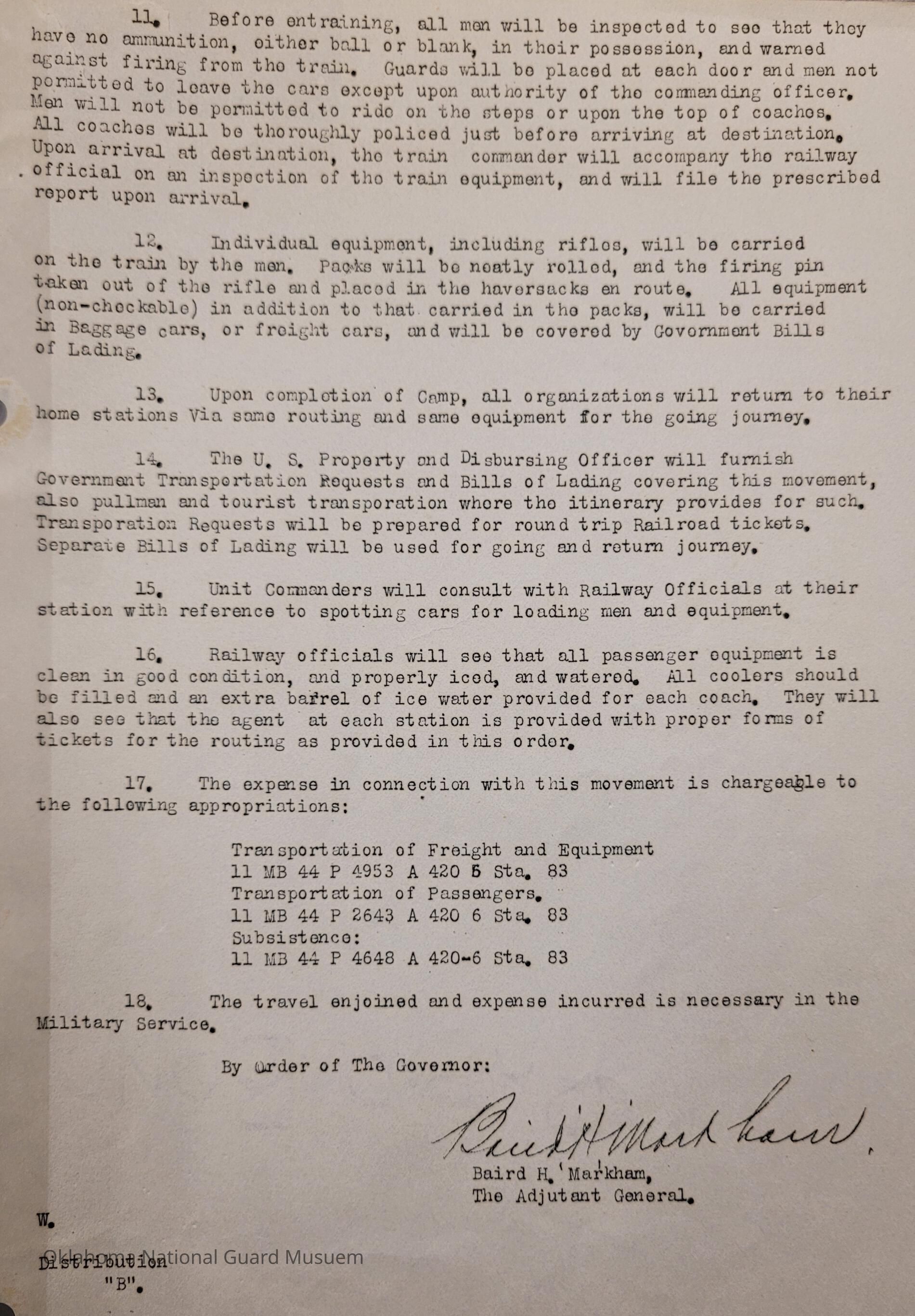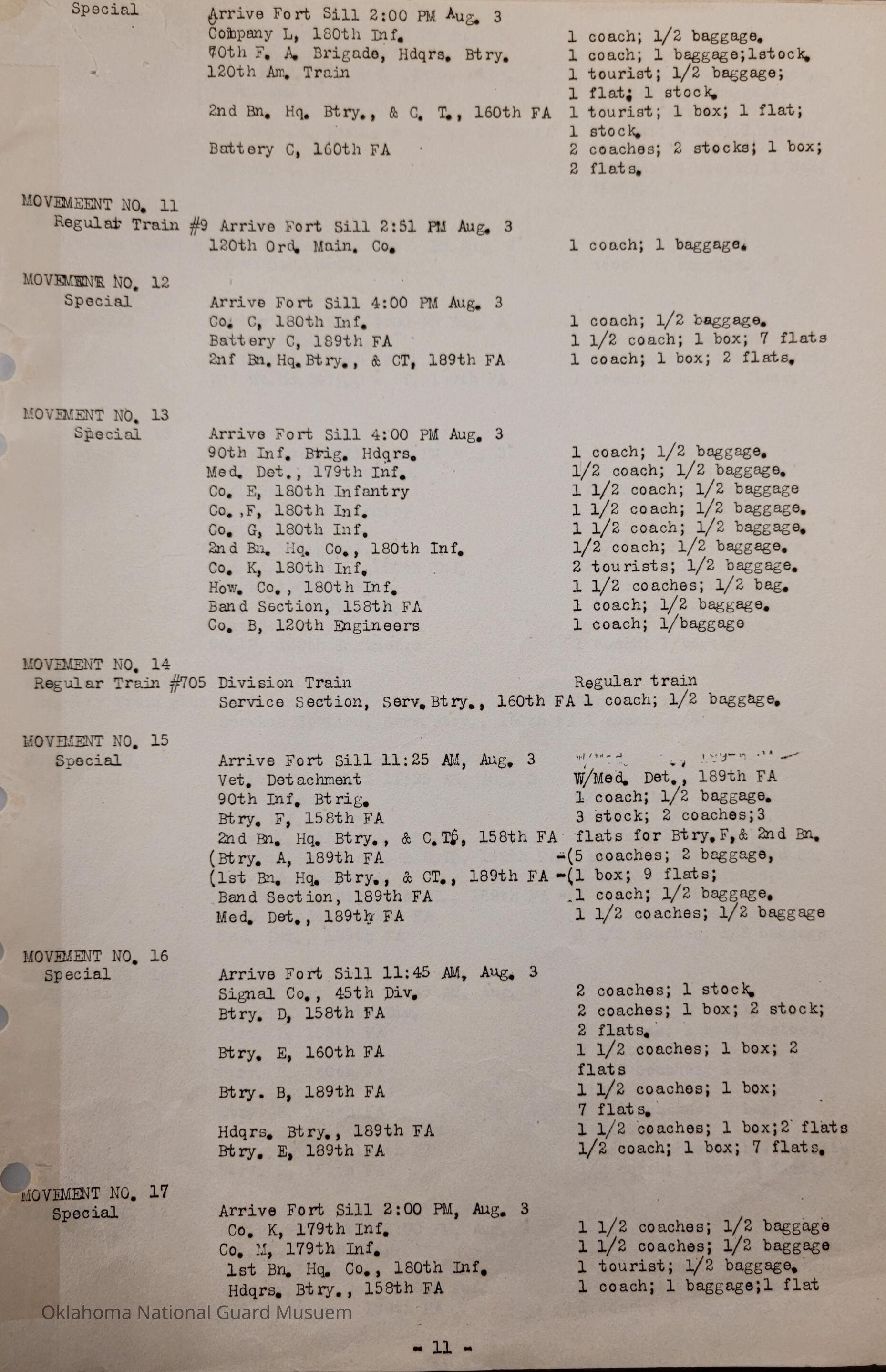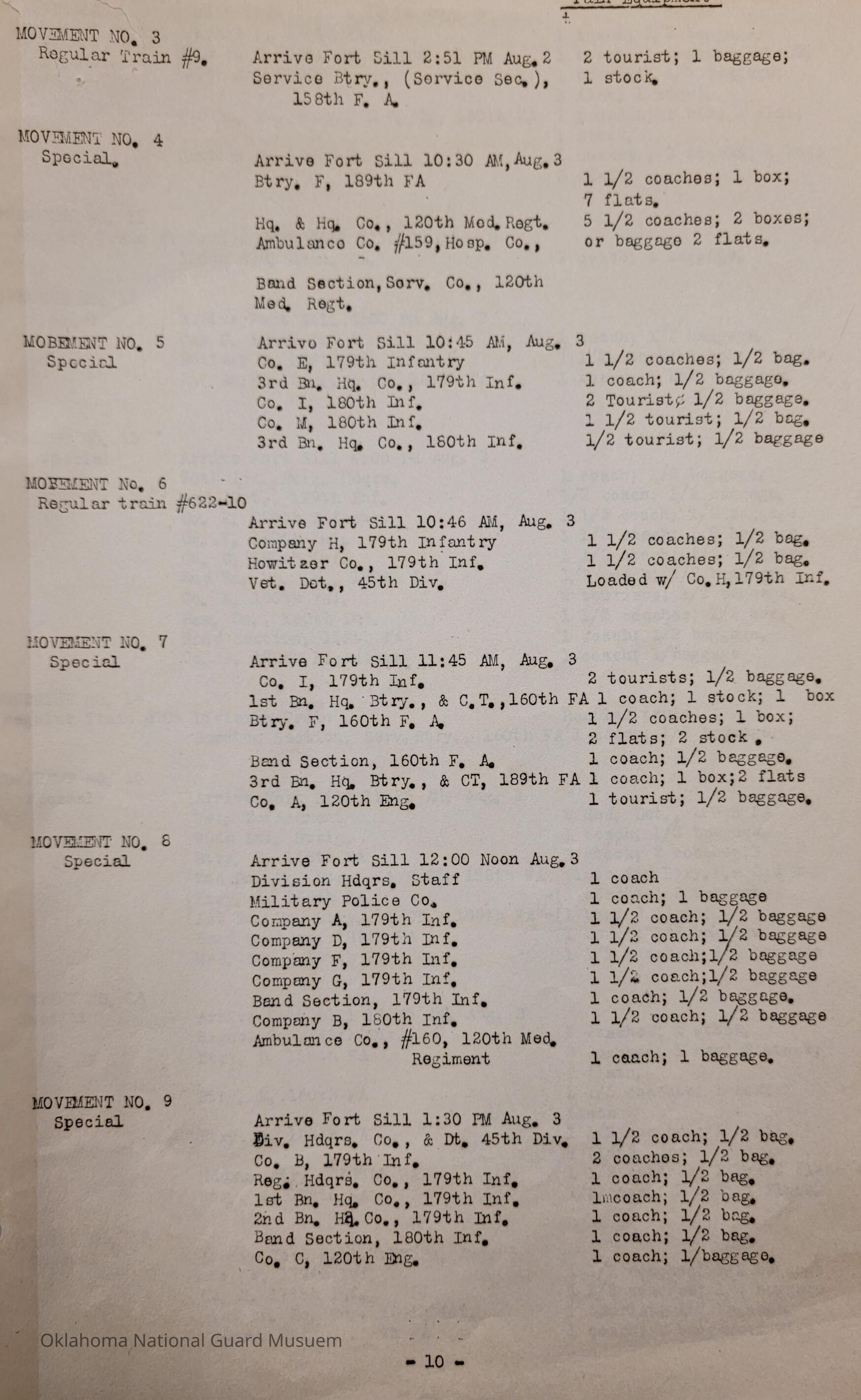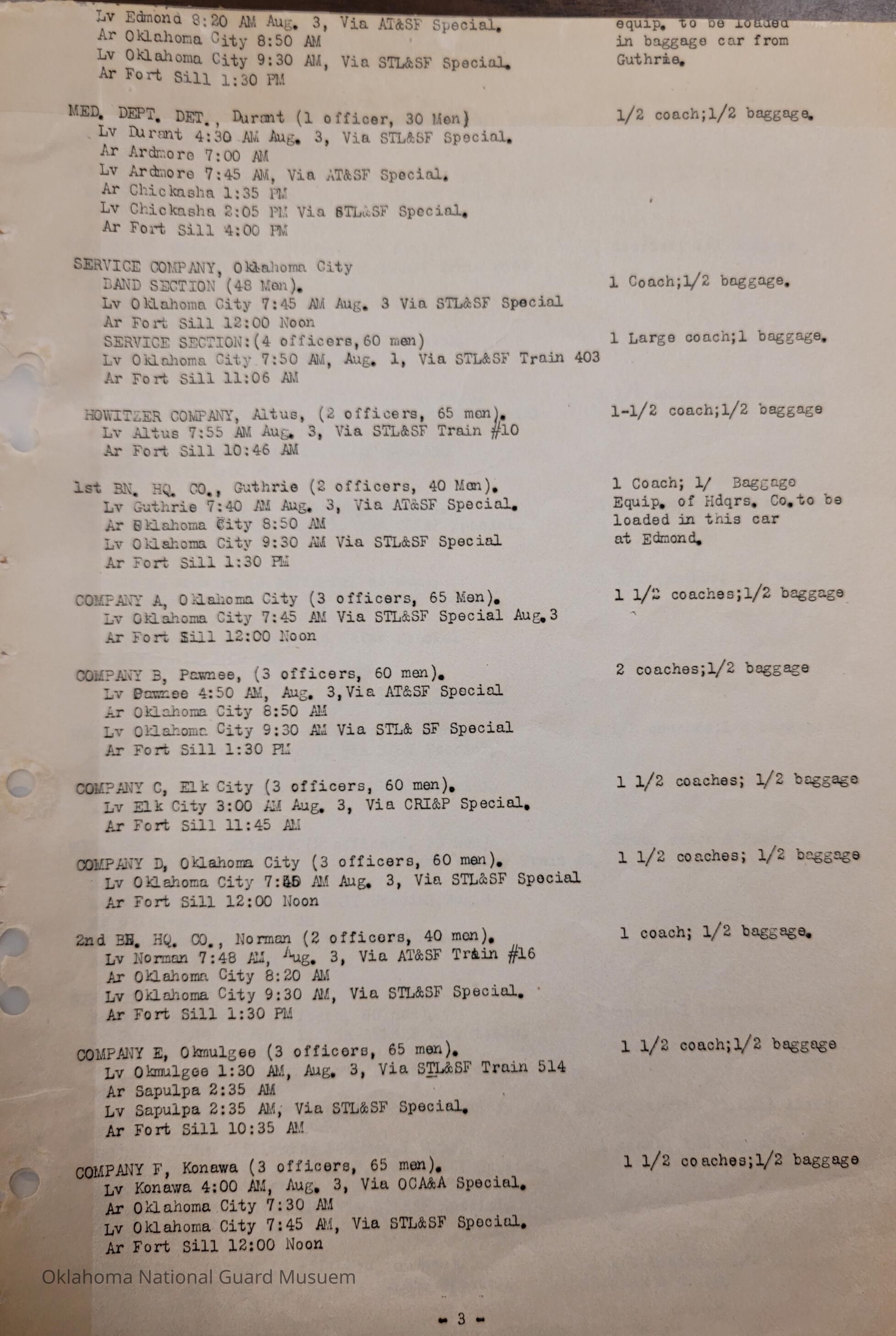 Adjutant General, Oklahoma City, Baird H. Markham, Camp of Instruction, Fort Sill, Train, Schedule, Railway, Transportation, Pawnee, Alva, Special Troops, Muskogee, Motorcycle Company, Claremore, Maud, Anadarko, Division Train, Healdton, Frederick, 120th Medical Regiment, Atoka, Band Section, Pawhuska, Pershing, 90th Infantry Brigade, Durant, Ardmore, Chickasha, Enid, Edmond, Altus, Guthrie, Elk City, Norman, Okmulgee, Konawa, Wetumka, Ada, Pauls Valley, Seminole, 180th Infantry, Stigler, Tulsa, Stillwater, Tishomingo, Wagoner, Chilocco, Idabel, Hugo, McAlester, Boynton, Sapulpa, Grove, Bernice, Antlers, Talequah, Sperry, Sulphur, 70th Field Artillery Brigade, 158th Field Artillery, Kingfisher, Weatherford, 160th Field Artillery, Holdenville, Wewoka, Roff, Chandler, Haskell, Hominy, Minco, Blackwell, Tonkawa, Cherokee, 179th Infantry