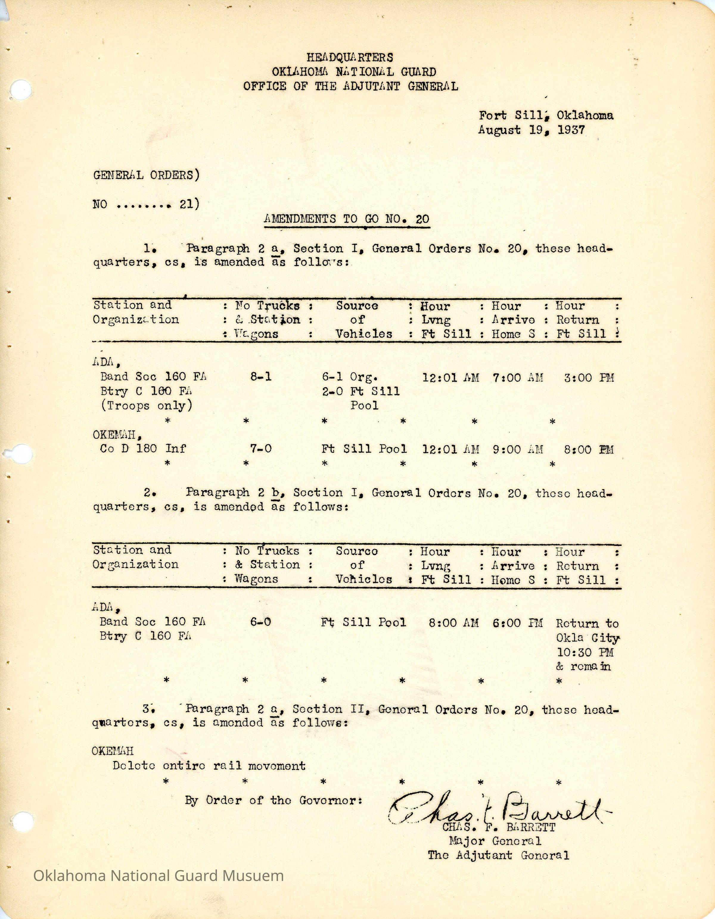 General Order #21 from Headquarters Adjutant General's Office in Oklahoma City. The order amends General Order #20 1937 and corrects the number of vehicles required and new times of departure for Ada and Okemah for the trip to Fort SillDate(s) of Creation