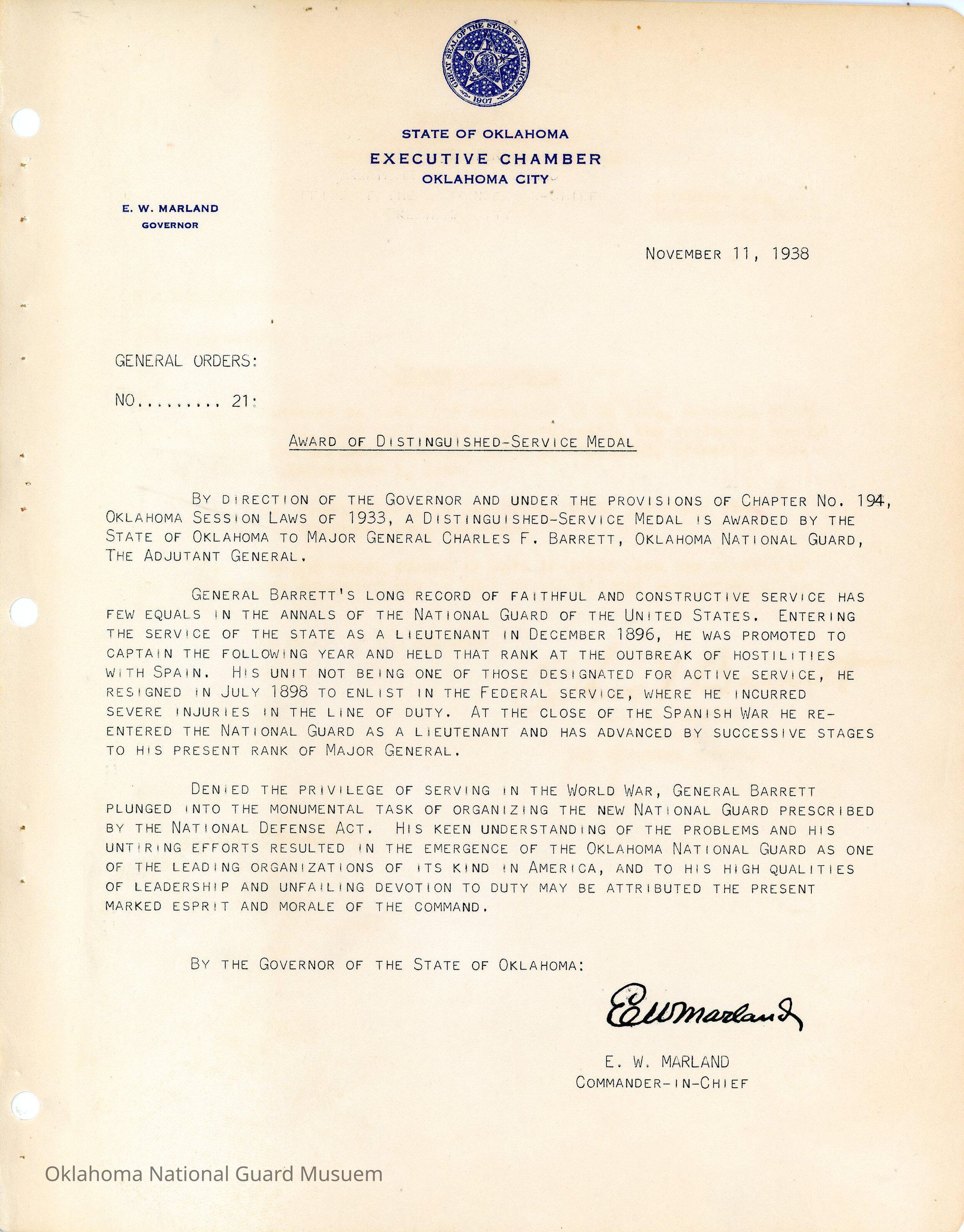 General Order #21 from Headquarters Adjutant General's Office in Oklahoma City. The order awards the Distinguished Service Medal to Charles F. BarrettDate(s) of Creation