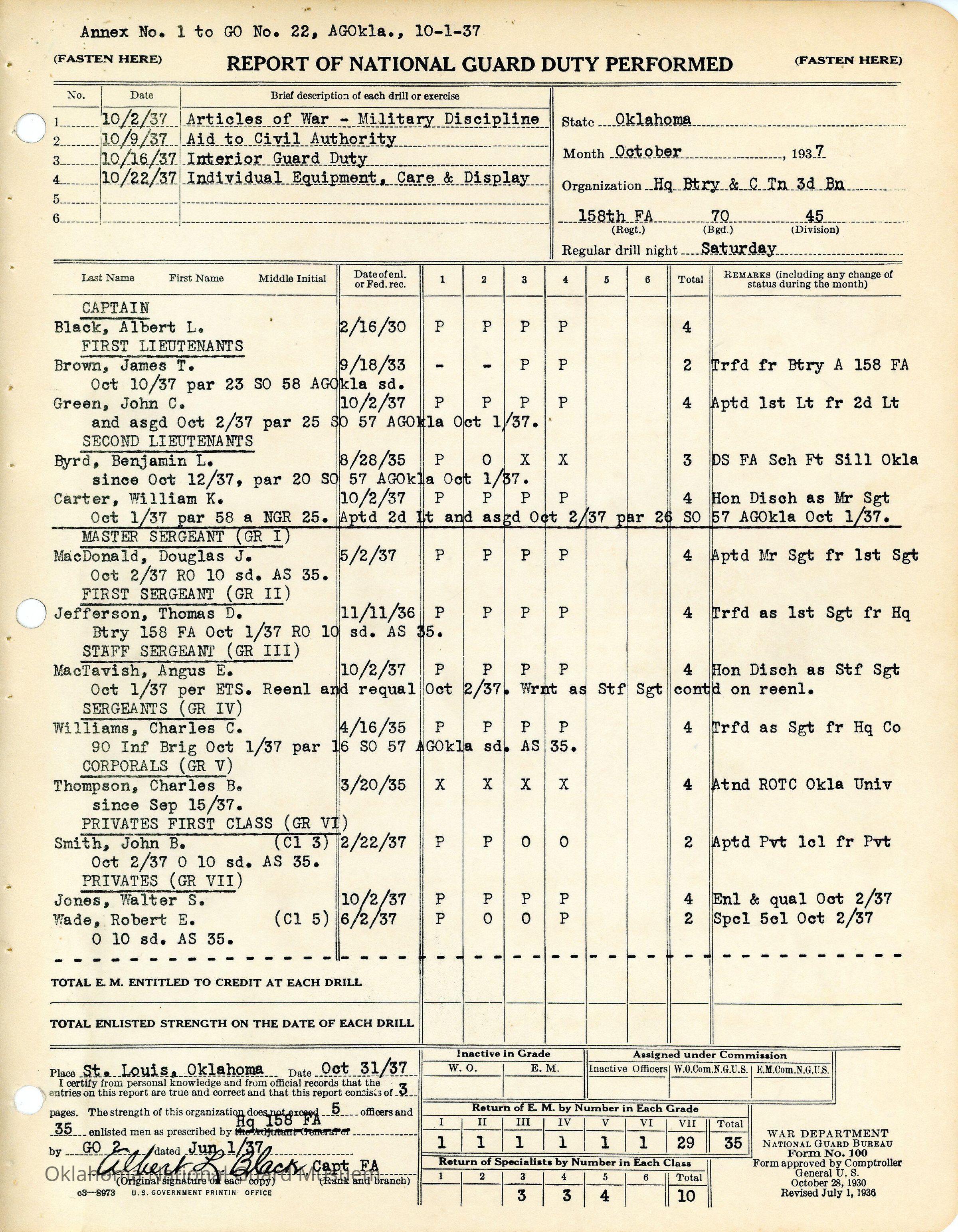 Example form, Duty Performed, 158th Field Artillery, Albert L. Black, James T. Brown, John C. Green, Benjamin L. Byrd, William K. Carter, Douglas J. MacDonald, Thomas D. Jefferson, Angus E. MacTavish, Charles C. WIlliams, Charles B. Thompson, John B. Smith, Walter S. Jones, Robert E. Wade, St. Louis