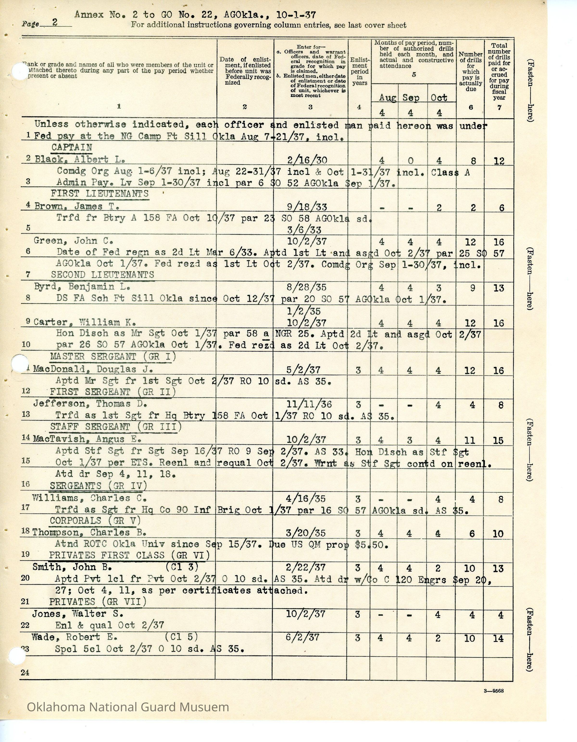 General Order #22 Annex 2 from Headquarters Adjutant General's Office in Oklahoma City. The order is an example form of a pay sheet and how it should be filled outDate(s) of Creation