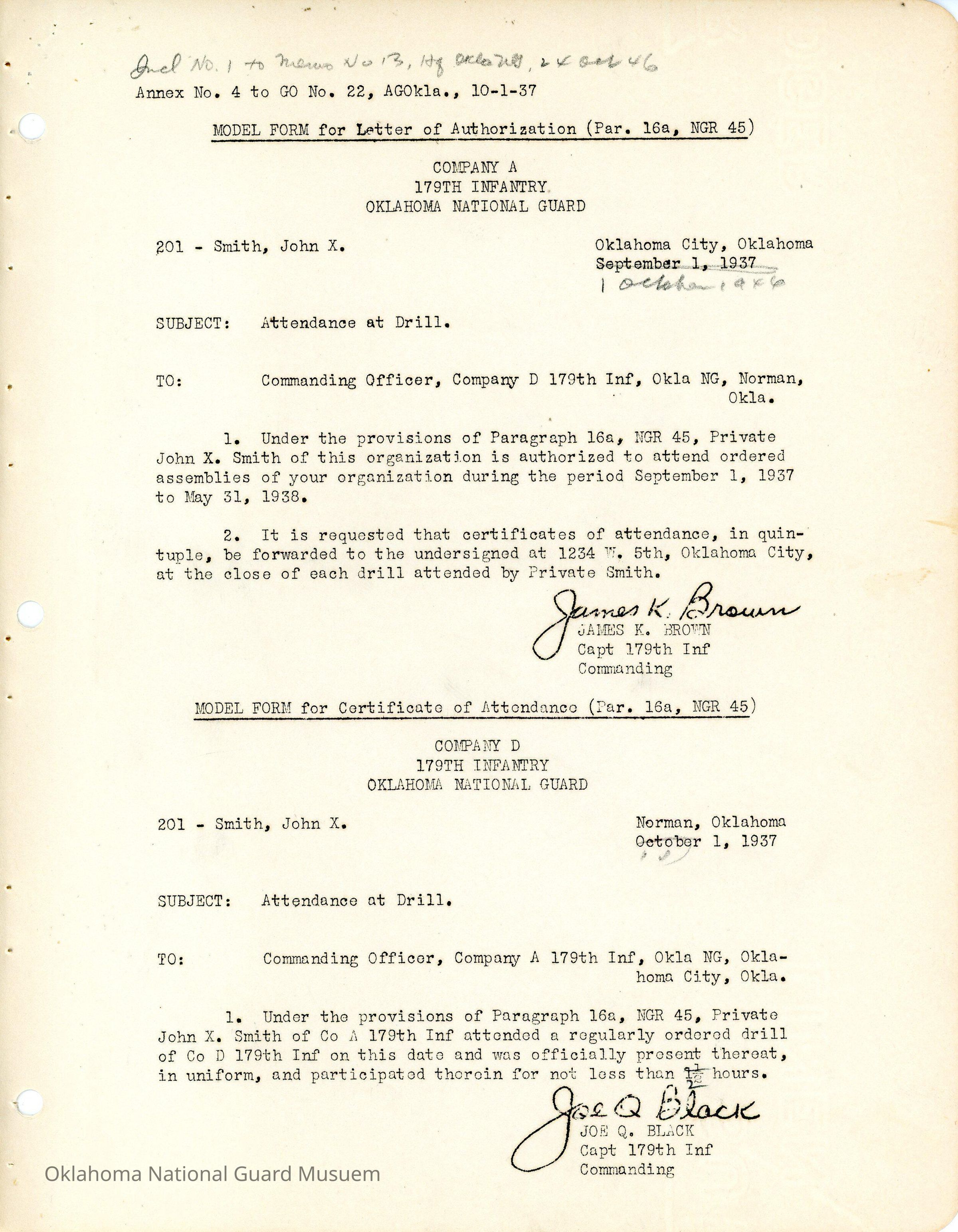 Letter of Authorization, 179th Infantry, Oklahoma City, Attendance, James K. Brown, Joe Q. Black