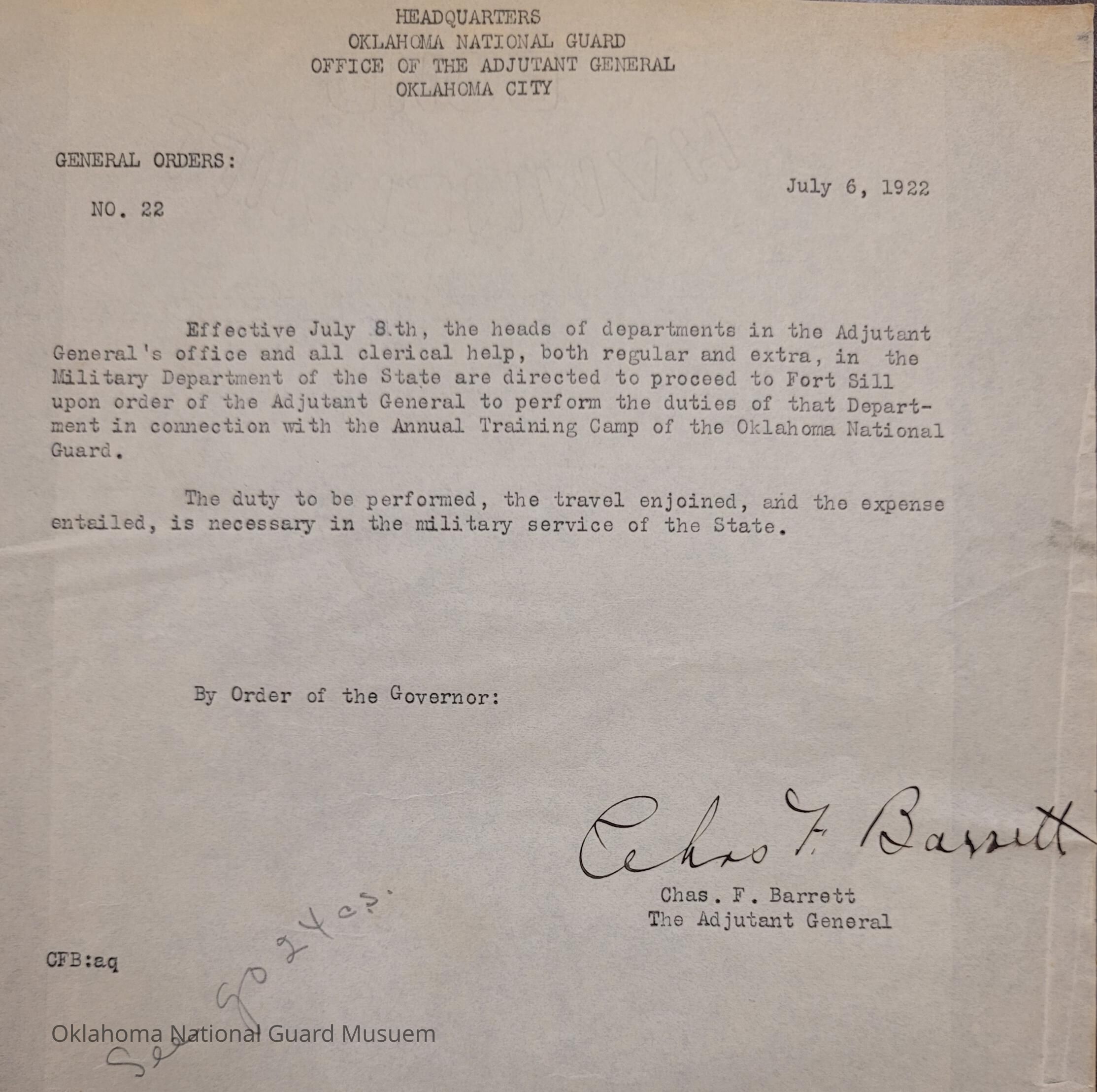 General Order #22 from Headquarters Adjutant General's Office in Oklahoma City. The order orders all heads of departments in the Adjutant General's office and all clerical help in the Military Department to Fort Sill to assist the Annual Training CampDate(s) of Creation