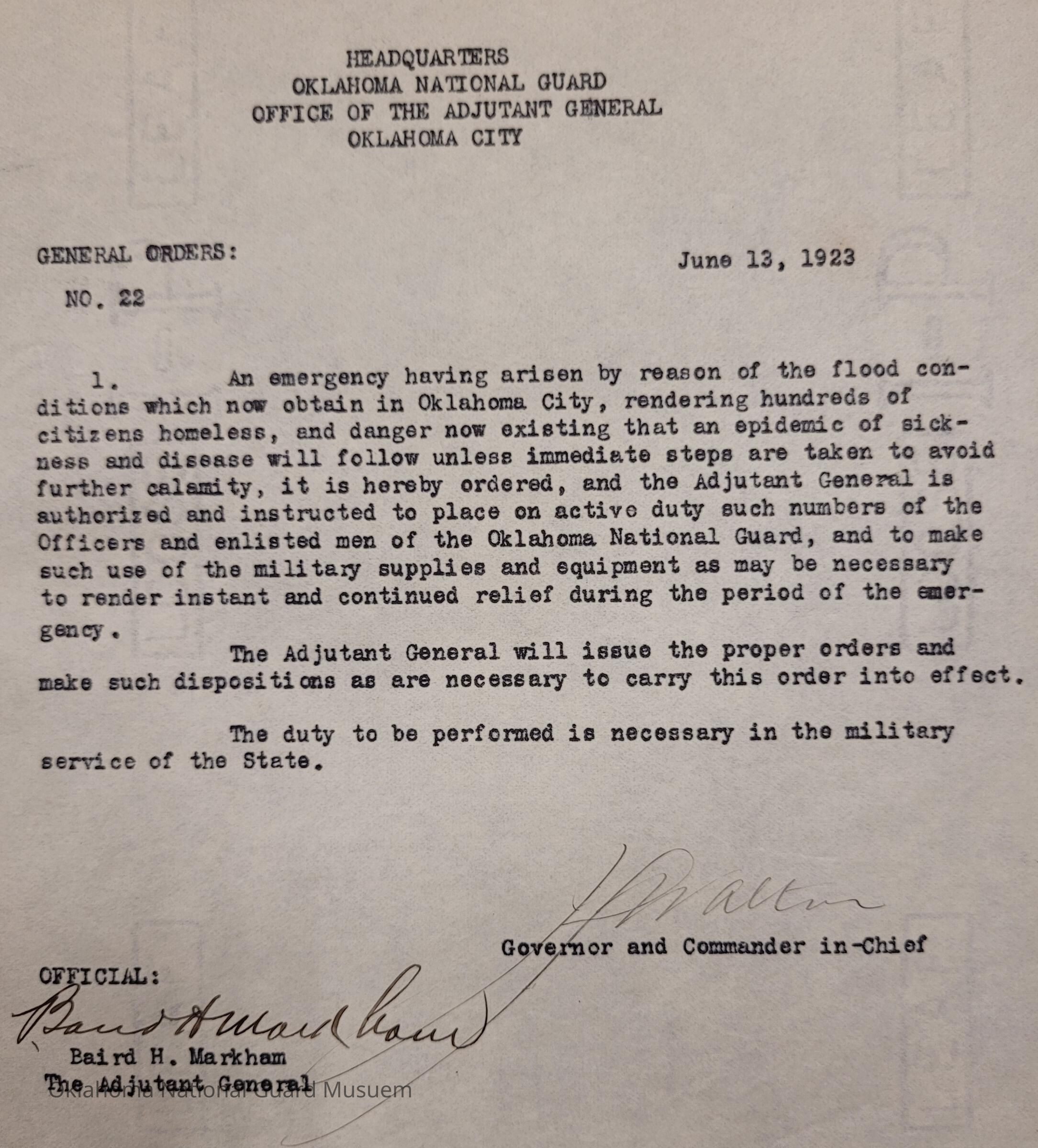 General Order #22 from Headquarters Adjutant General's Office in Oklahoma City. The order calls out the Oklahoma National Guard to provide aid and relief from a flood in Oklahoma CityDate(s) of Creation