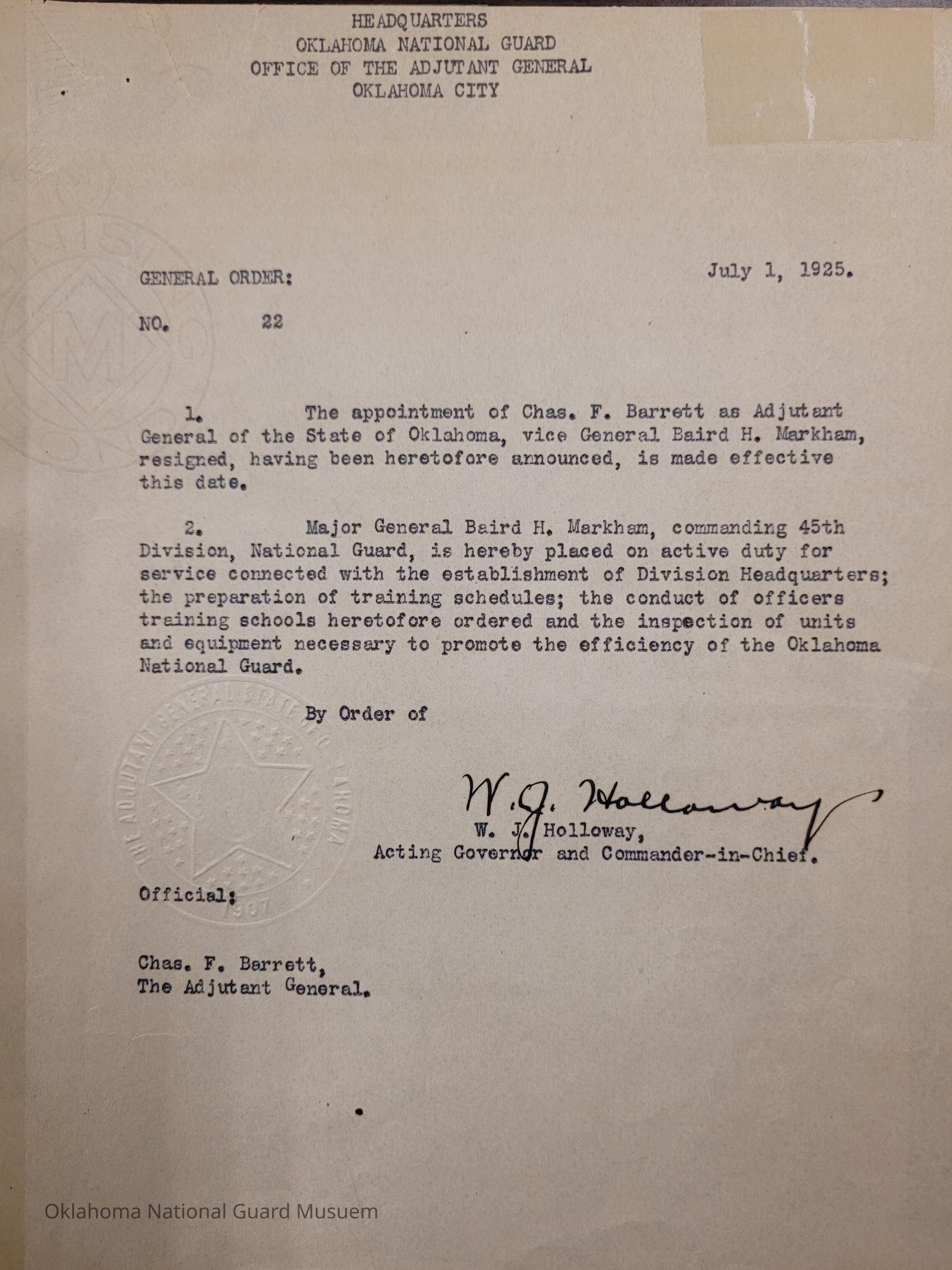 General Order #22 from Headquarters Adjutant General's Office in Oklahoma City. The order appoints Charles F. Barrett Adjutant General while Baird H. Markham is placed on active duty to establish a Division Headquarters, the preparation of training schedules, and the inspection of units and equipmentDate(s) of Creation