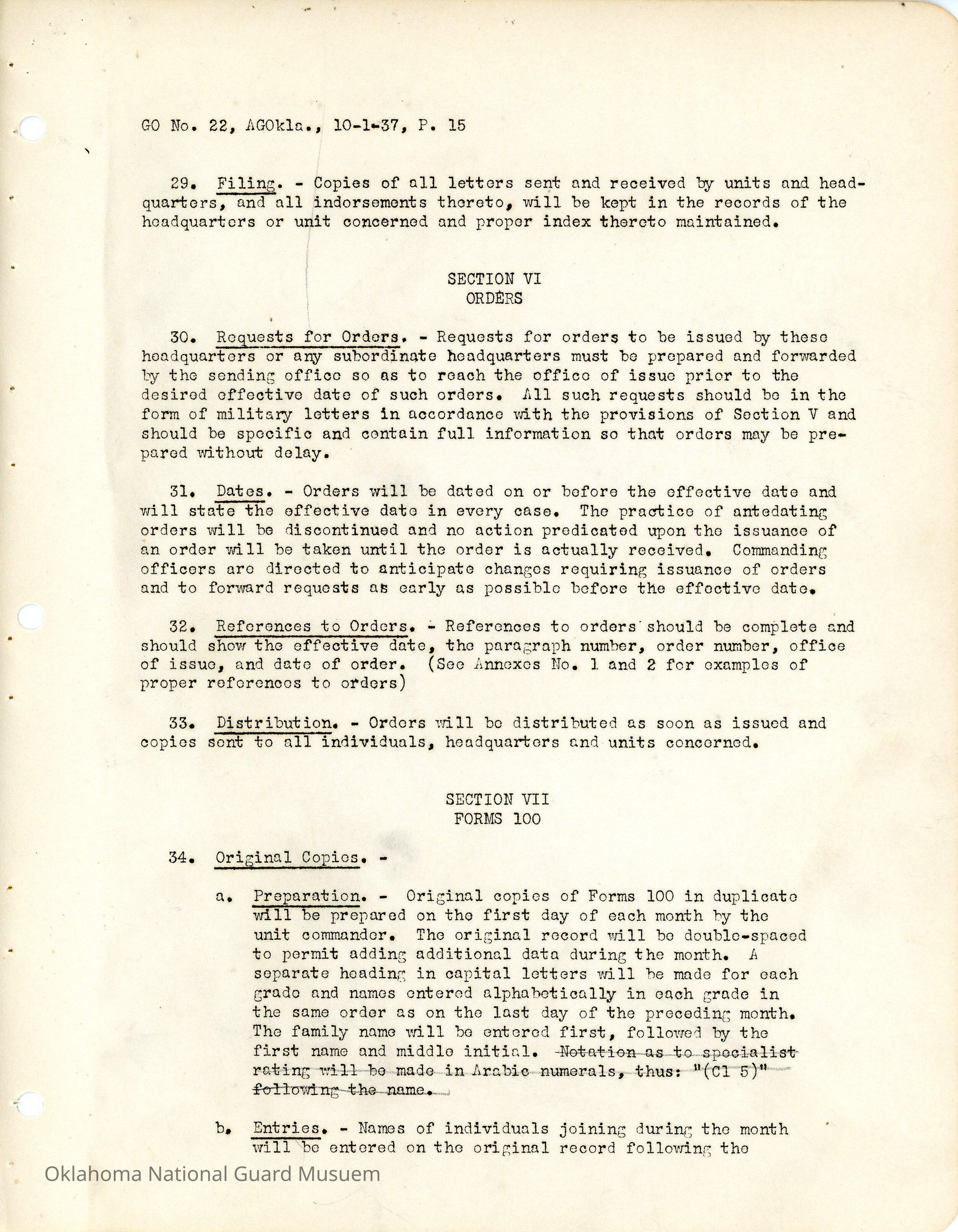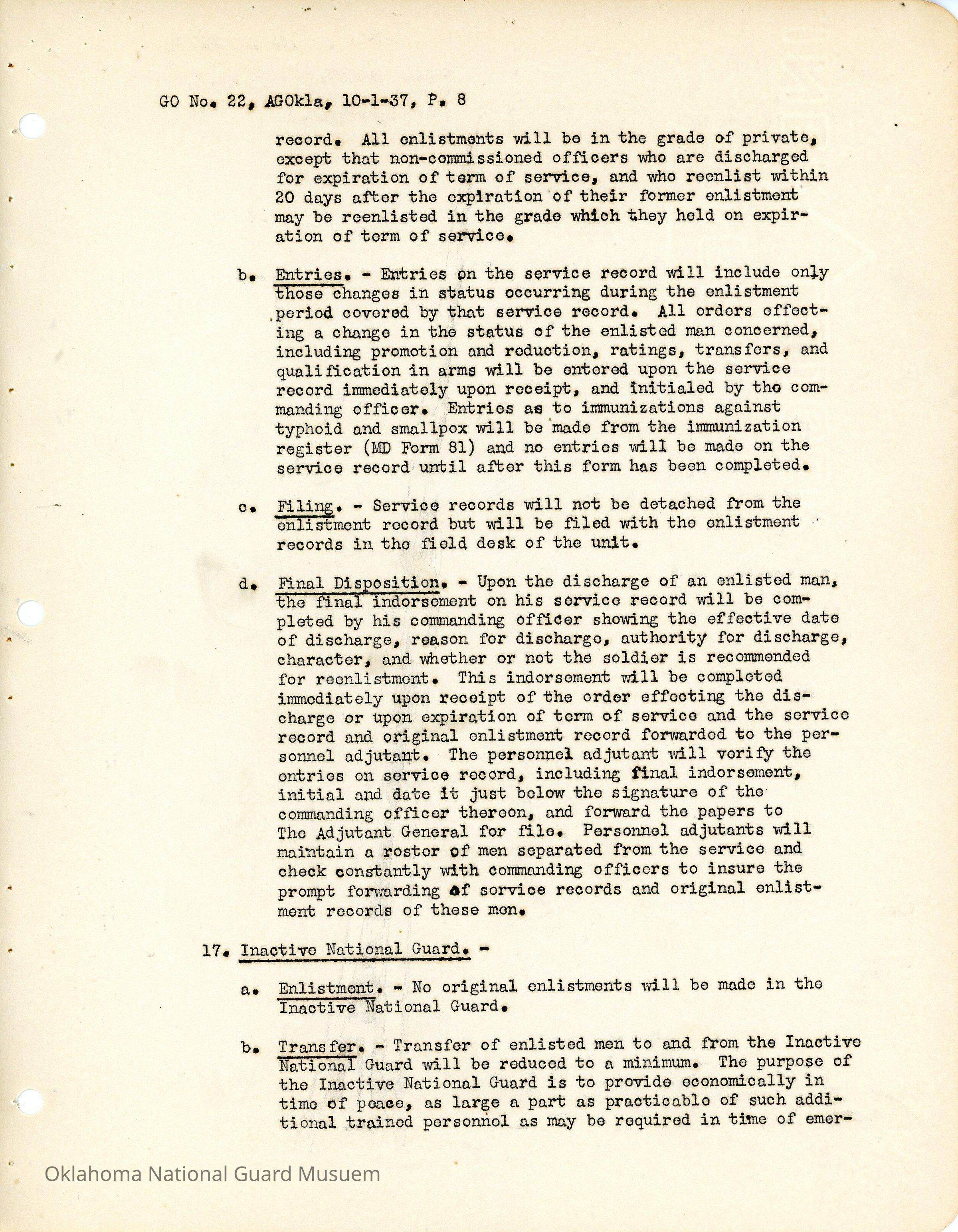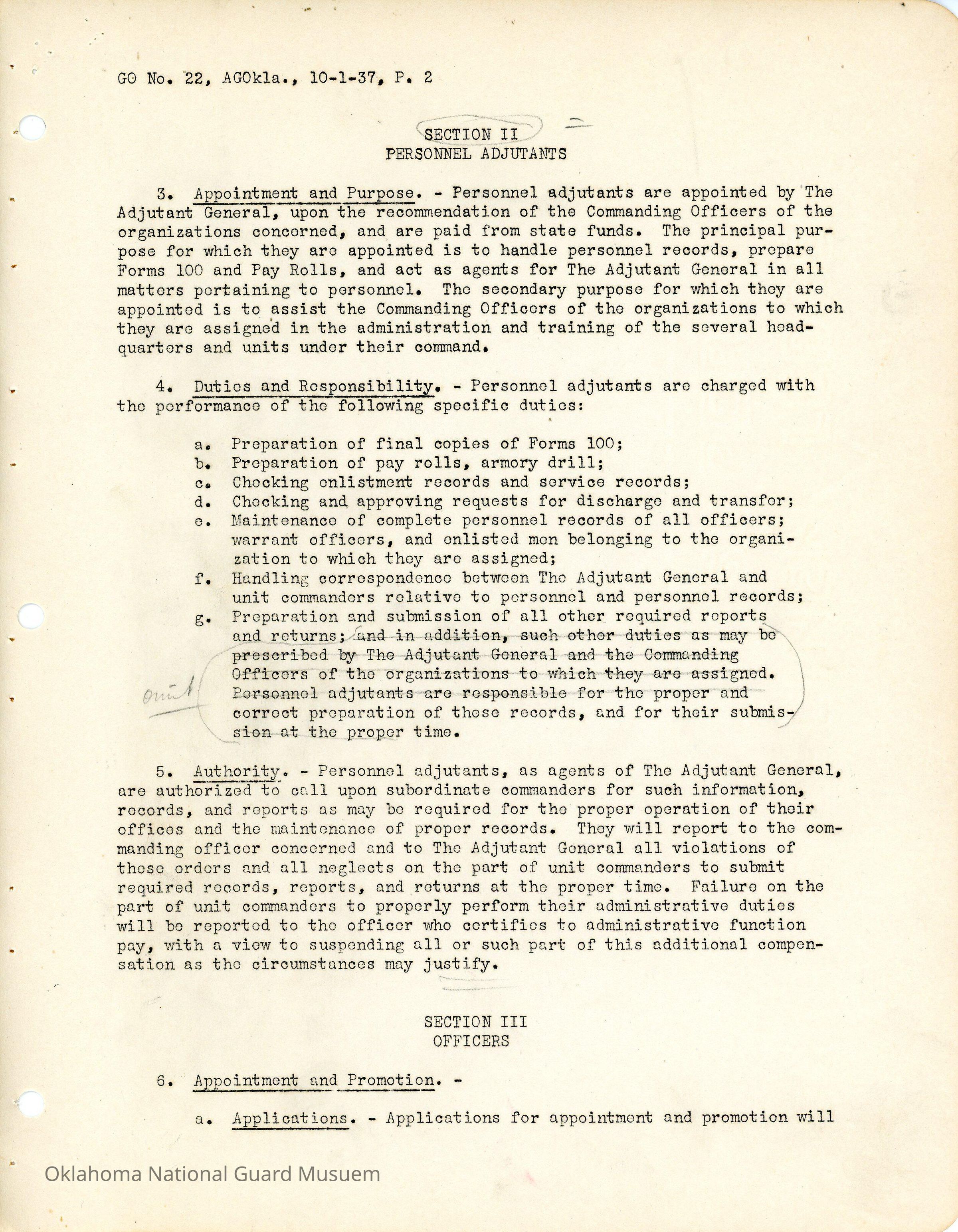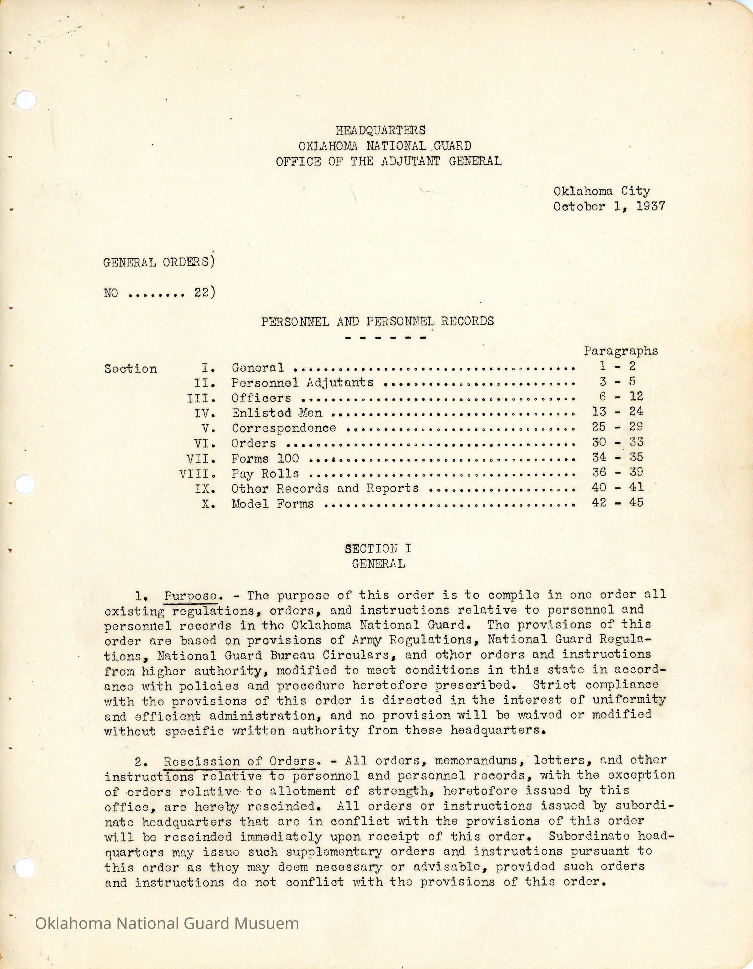 General Order #22 from Headquarters Adjutant General's Office in Oklahoma City. The order compiles all existing regulations, orders, and instructions related to personnel and personnel records in the Oklahoma National Guard. It also rescinds all previous orders, memorandums, letters, and other instructions relative to personnel.Date(s) of Creation
