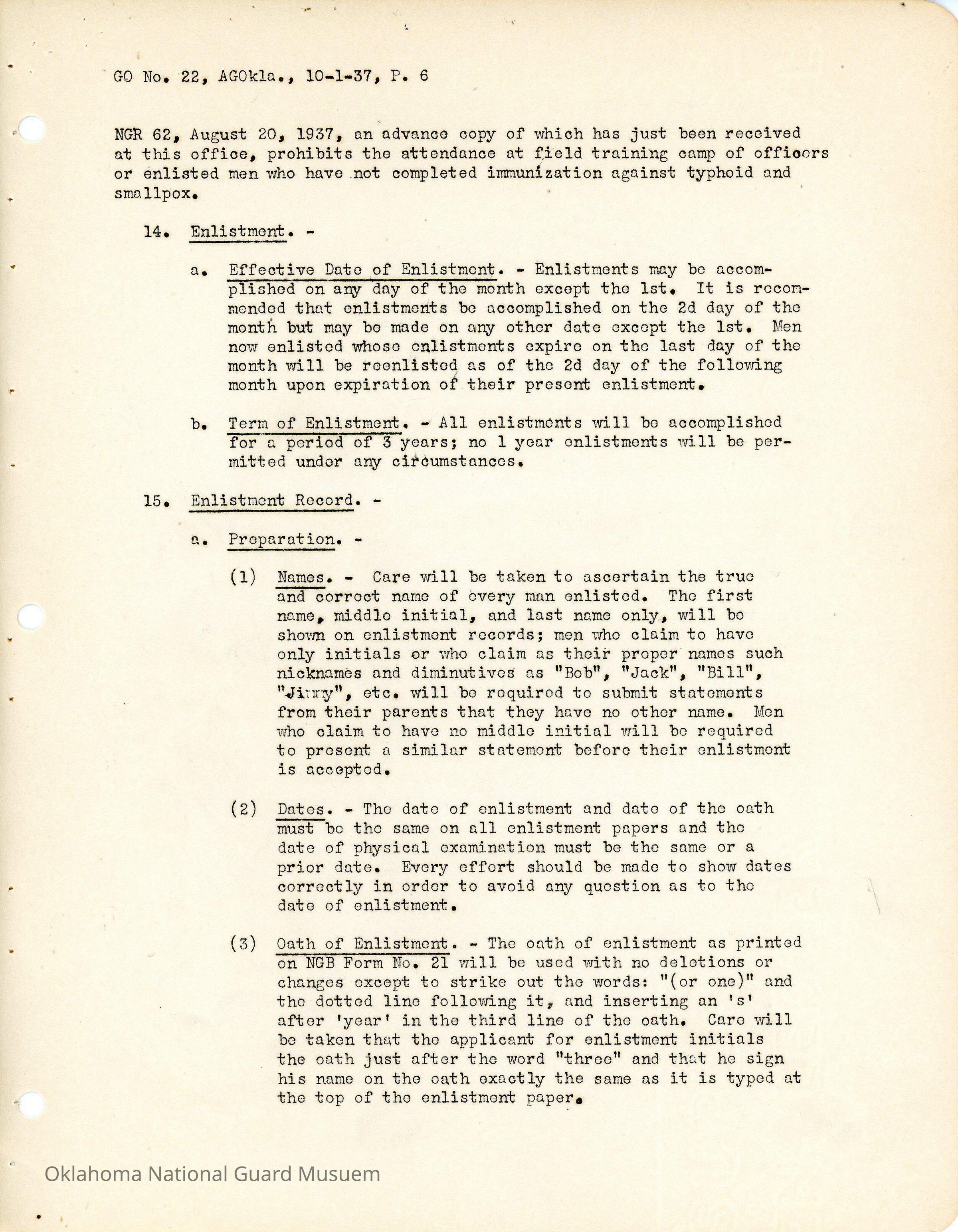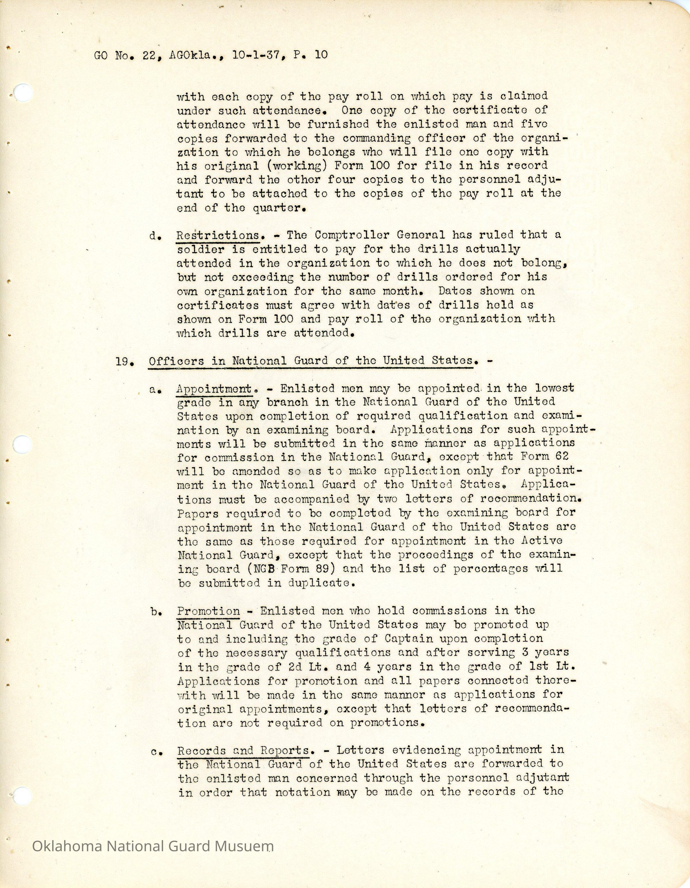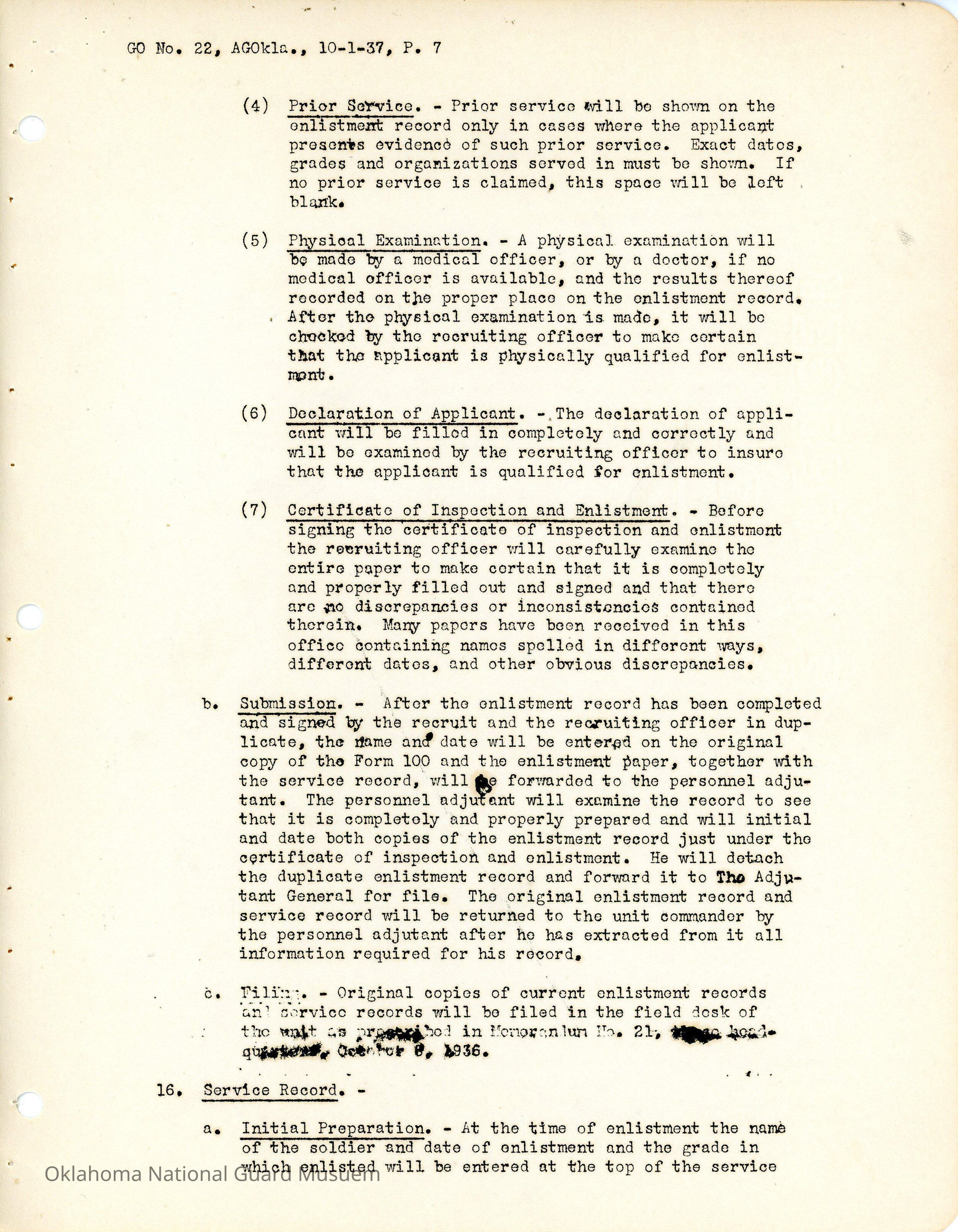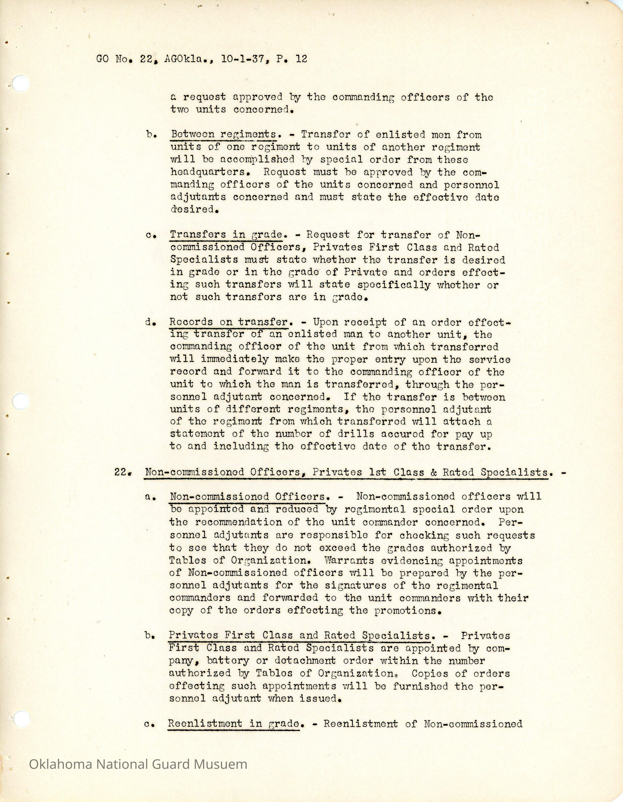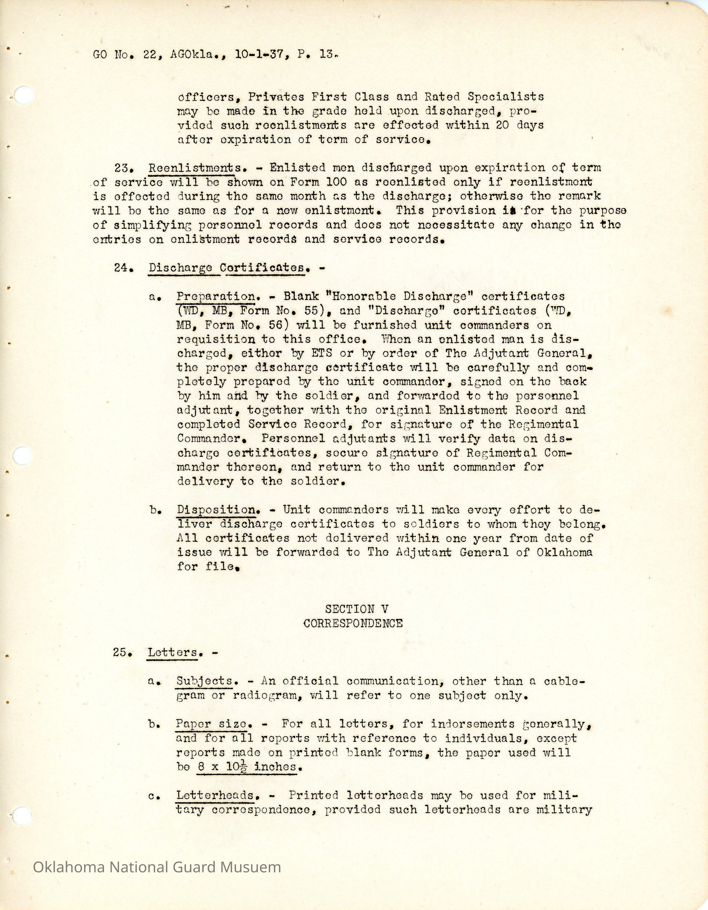 General Order #22 from Headquarters Adjutant General's Office in Oklahoma City. The order compiles all existing regulations, orders, and instructions related to personnel and personnel records in the Oklahoma National Guard. It also rescinds all previous orders, memorandums, letters, and other instructions relative to personnel.Date(s) of Creation