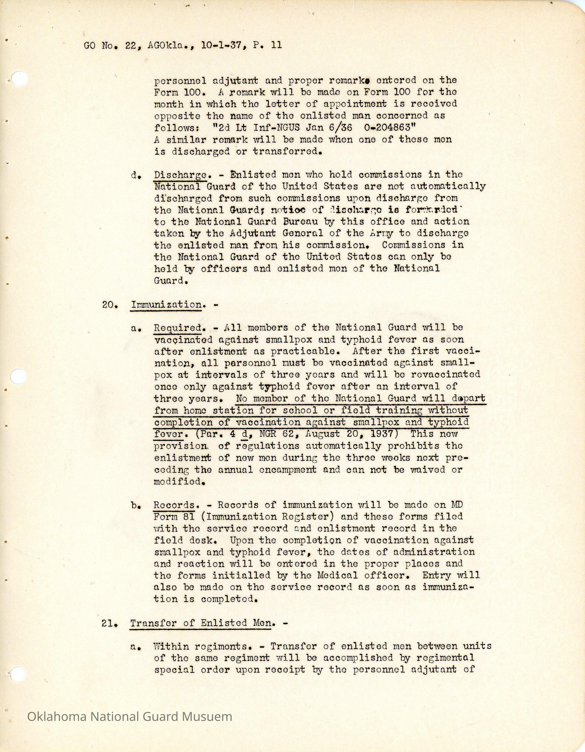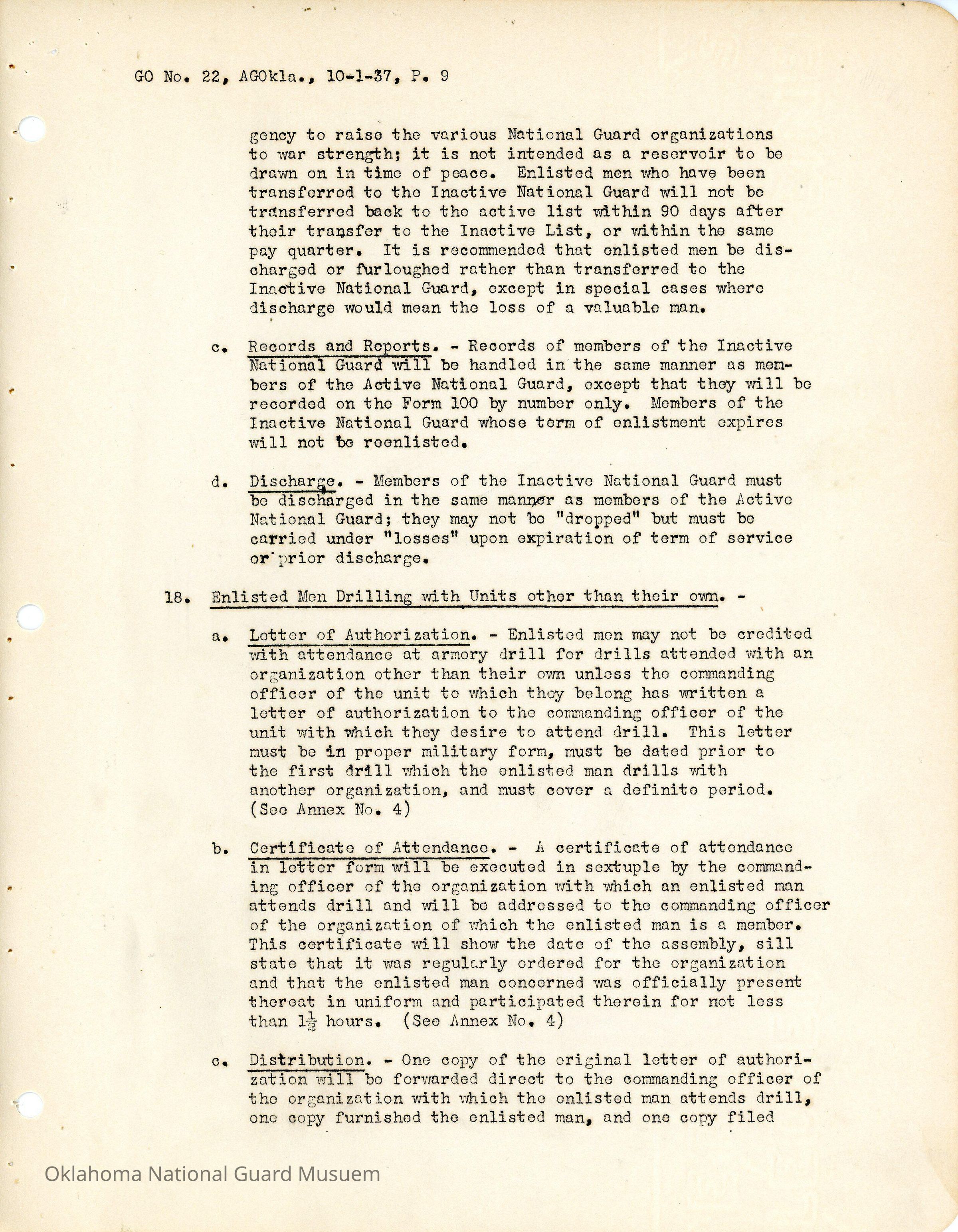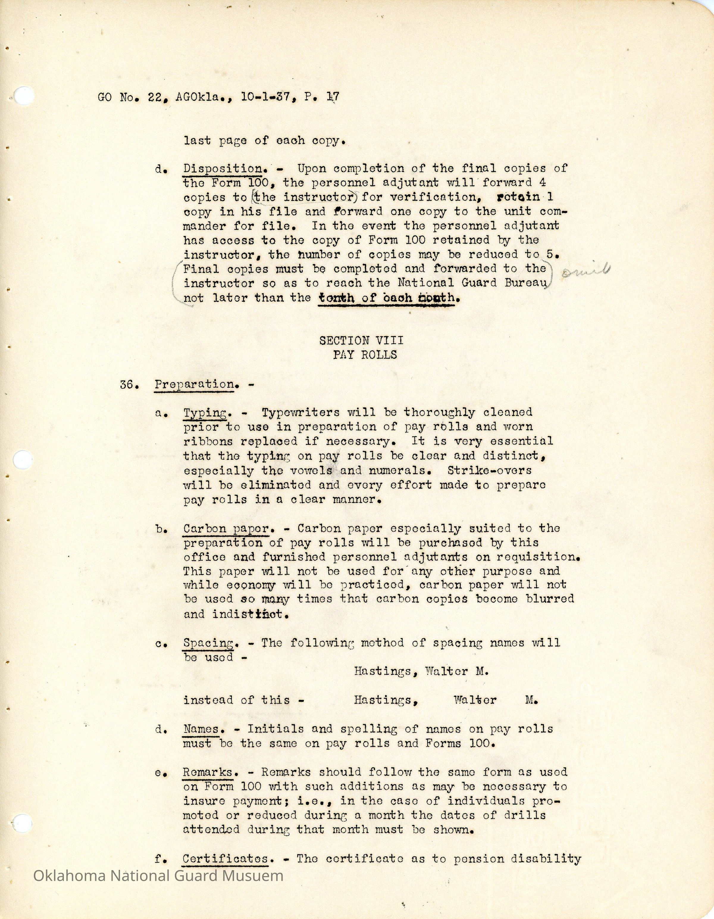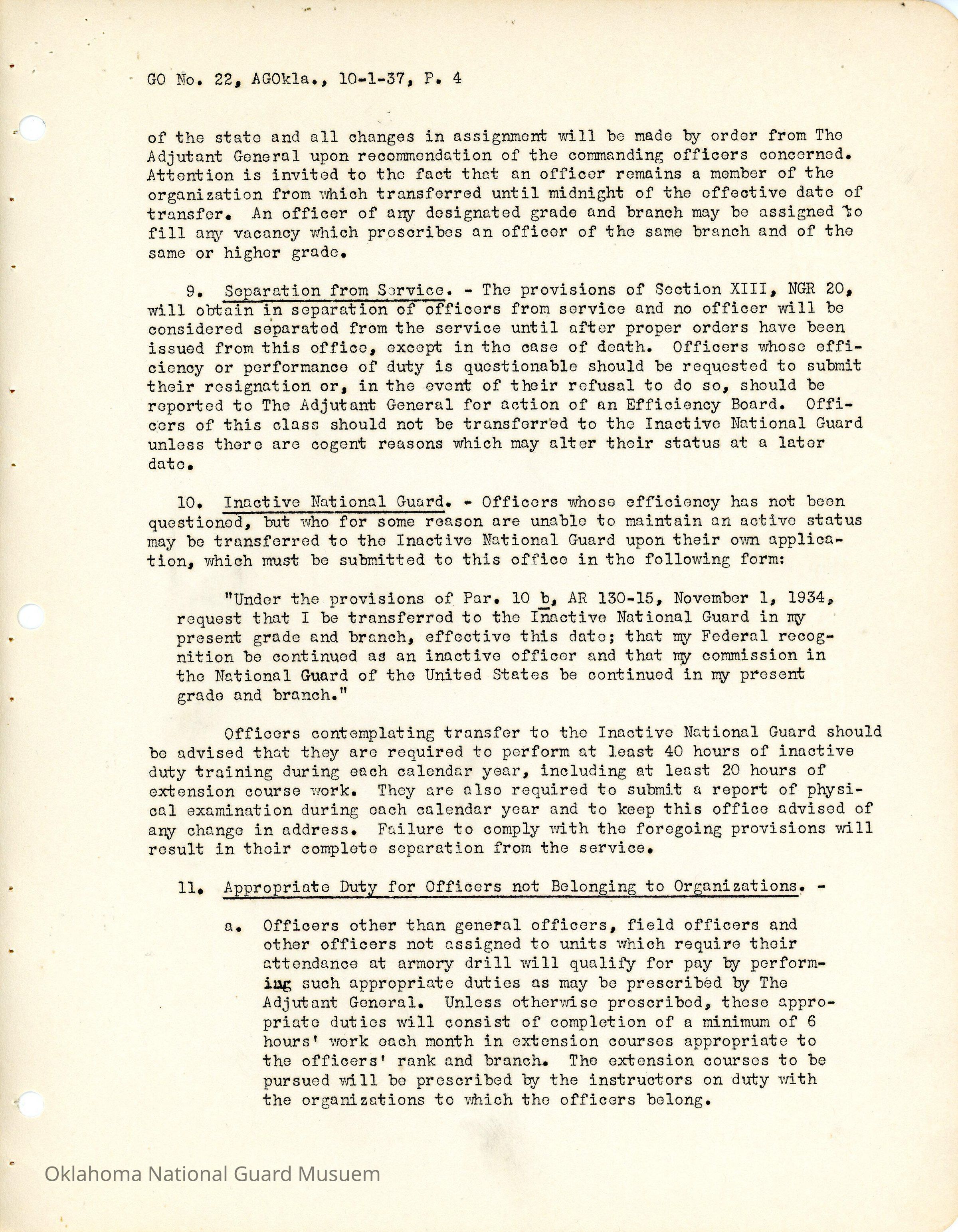 General Order #22 from Headquarters Adjutant General's Office in Oklahoma City. The order compiles all existing regulations, orders, and instructions related to personnel and personnel records in the Oklahoma National Guard. It also rescinds all previous orders, memorandums, letters, and other instructions relative to personnel.Date(s) of Creation