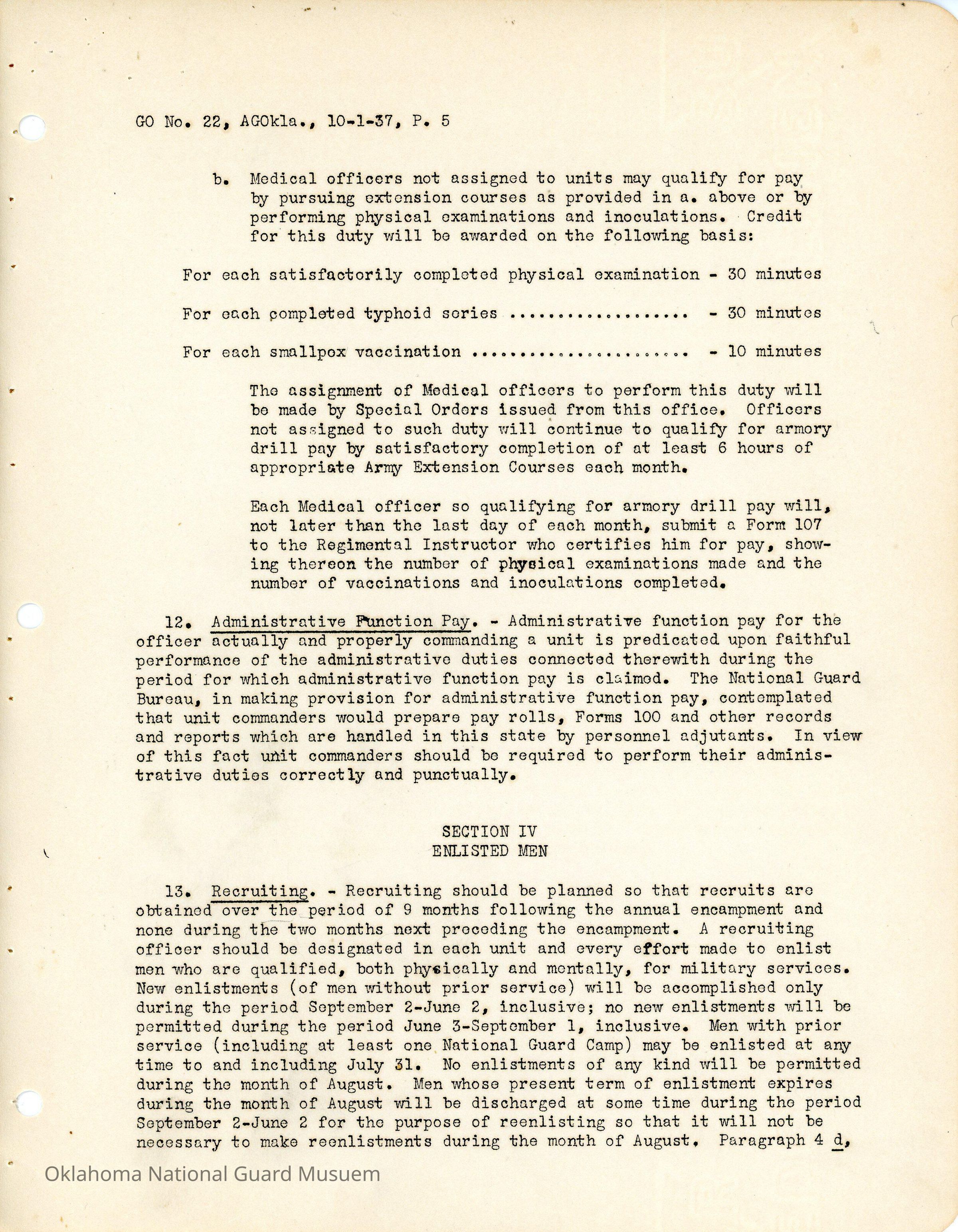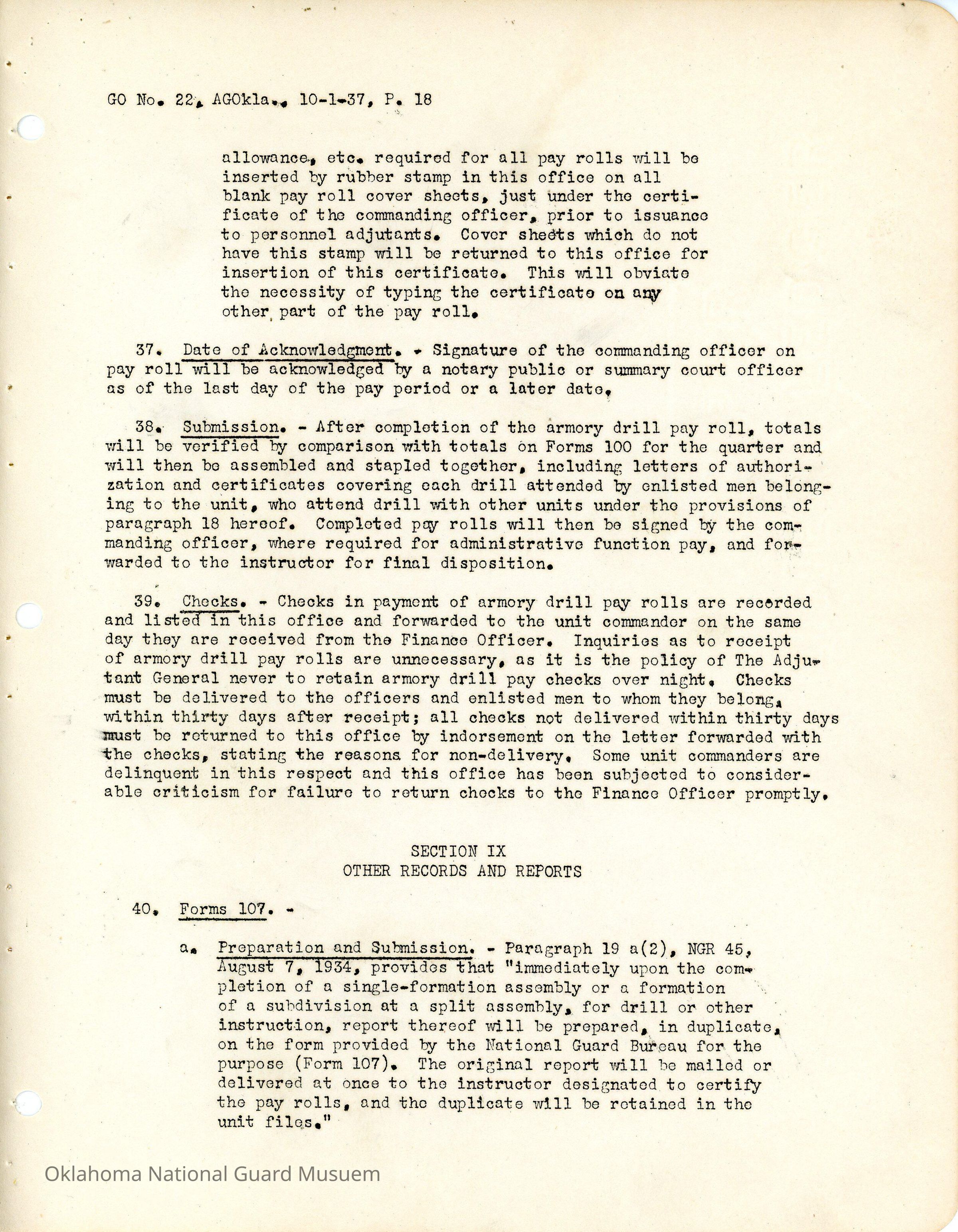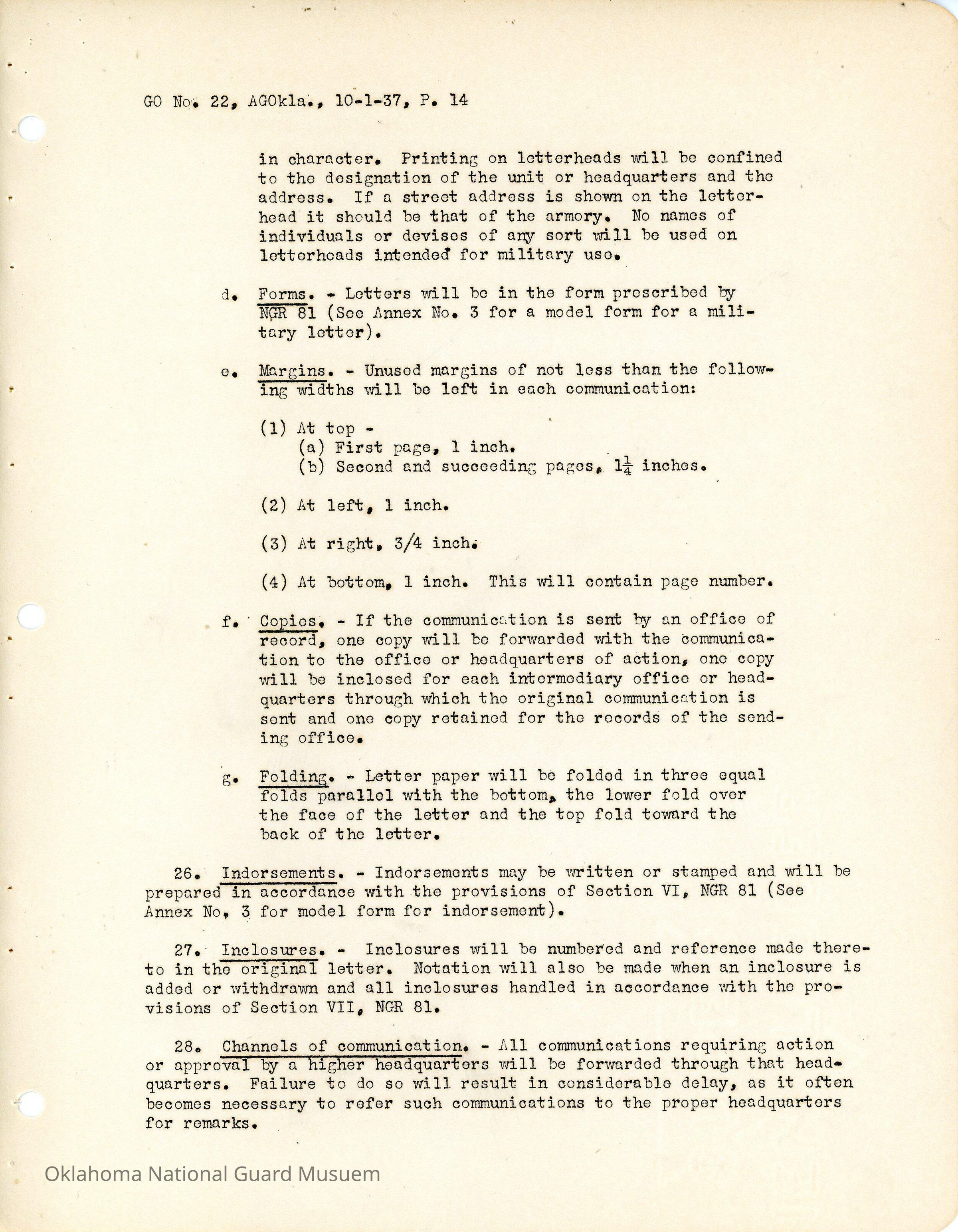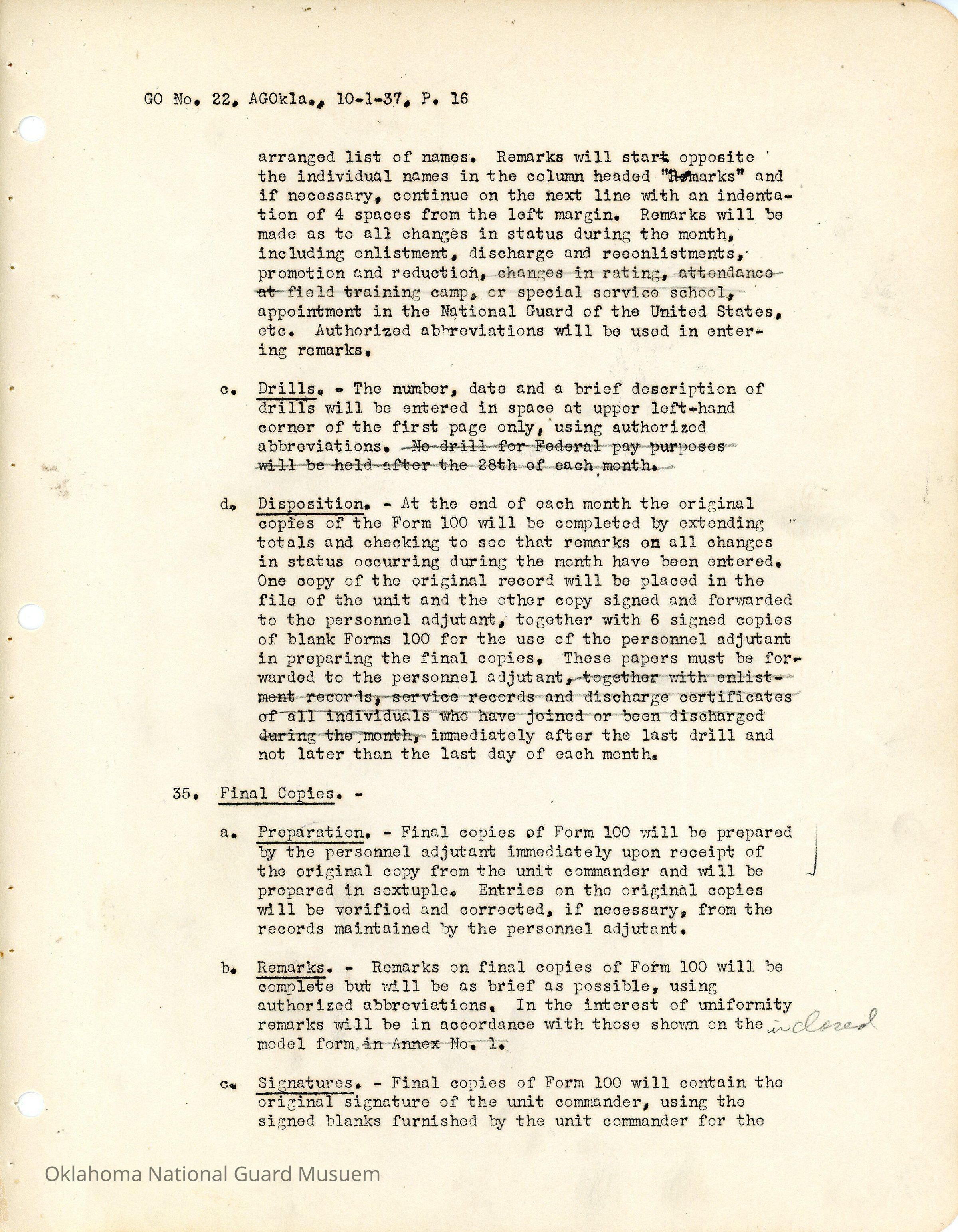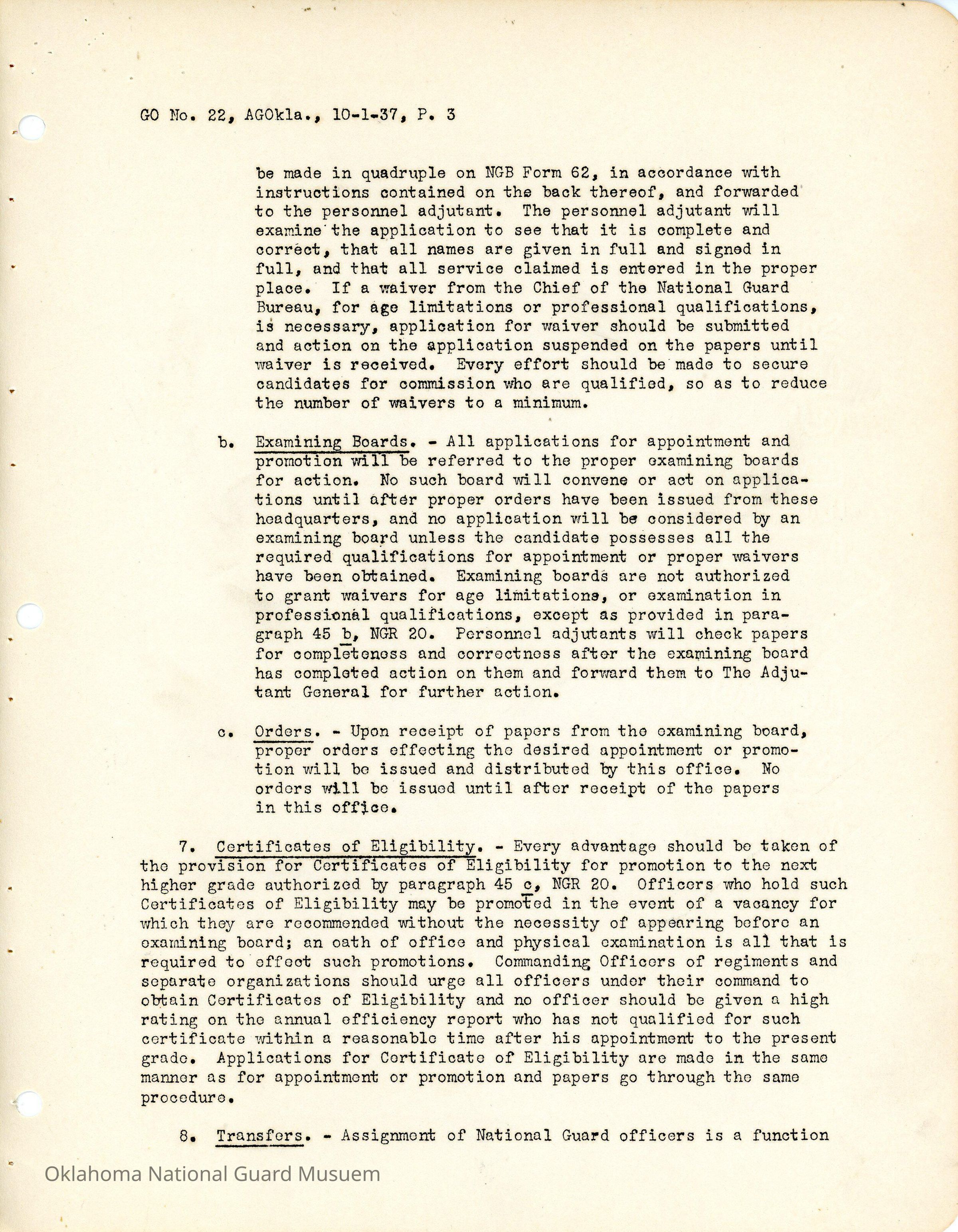 General Order #22 from Headquarters Adjutant General's Office in Oklahoma City. The order compiles all existing regulations, orders, and instructions related to personnel and personnel records in the Oklahoma National Guard. It also rescinds all previous orders, memorandums, letters, and other instructions relative to personnel.Date(s) of Creation