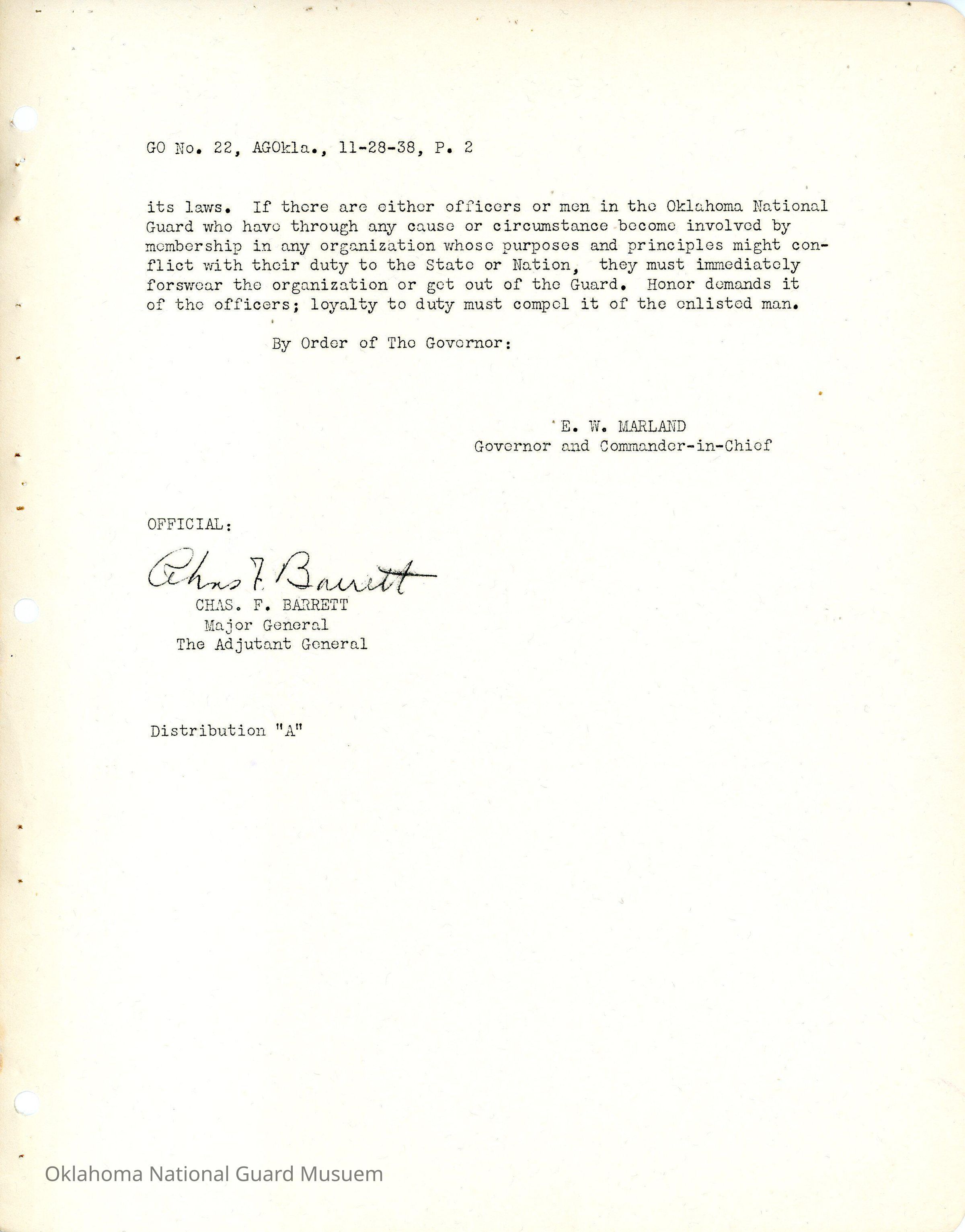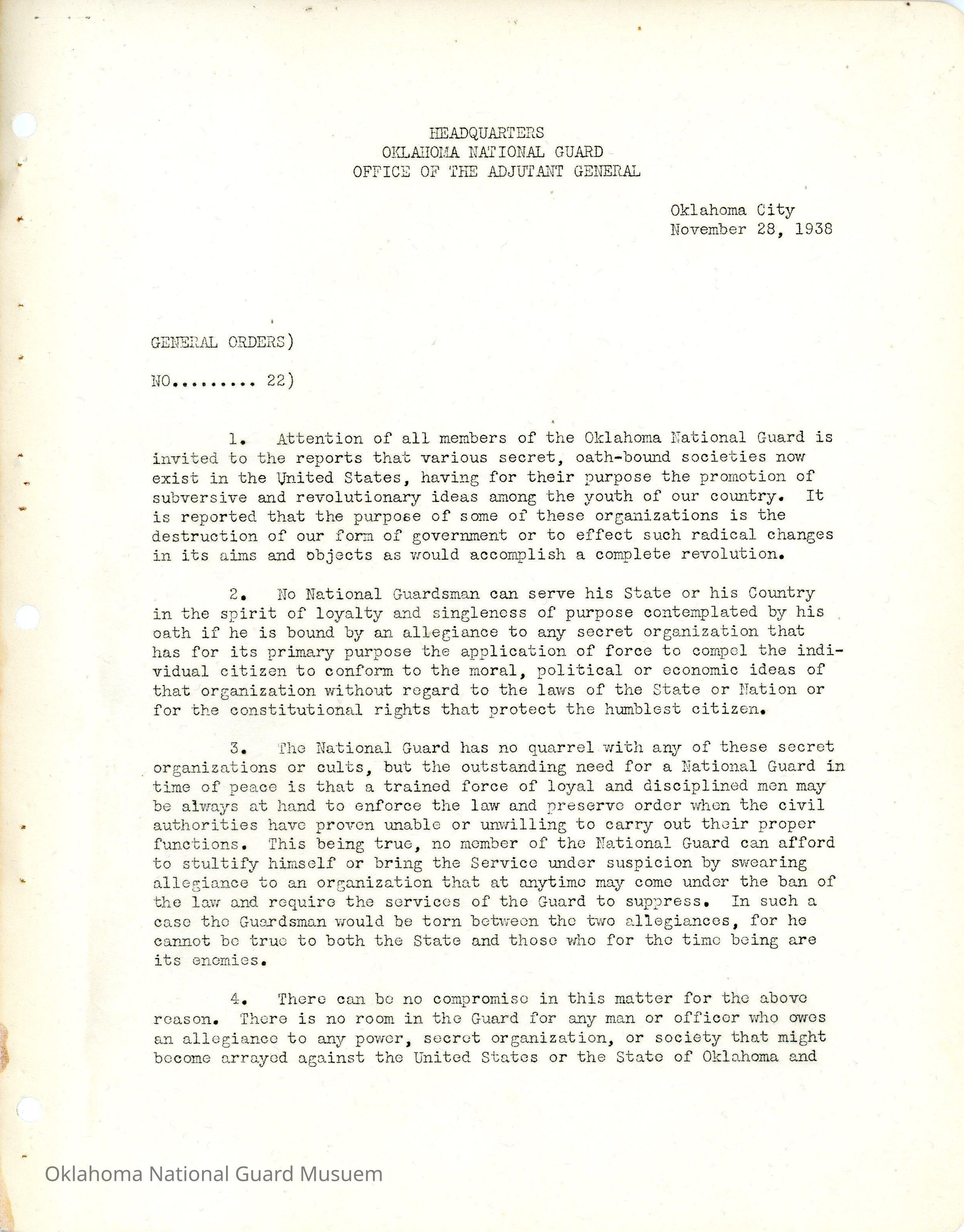 General Order #22 from Headquarters Adjutant General's Office in Oklahoma City. The order addresses the oath bound societies in the country. A member of the National Guard cannot swear allegiance to a secret organization while still upholding the duties and responsibilities required to be in the Oklahoma National Guard.Date(s) of Creation