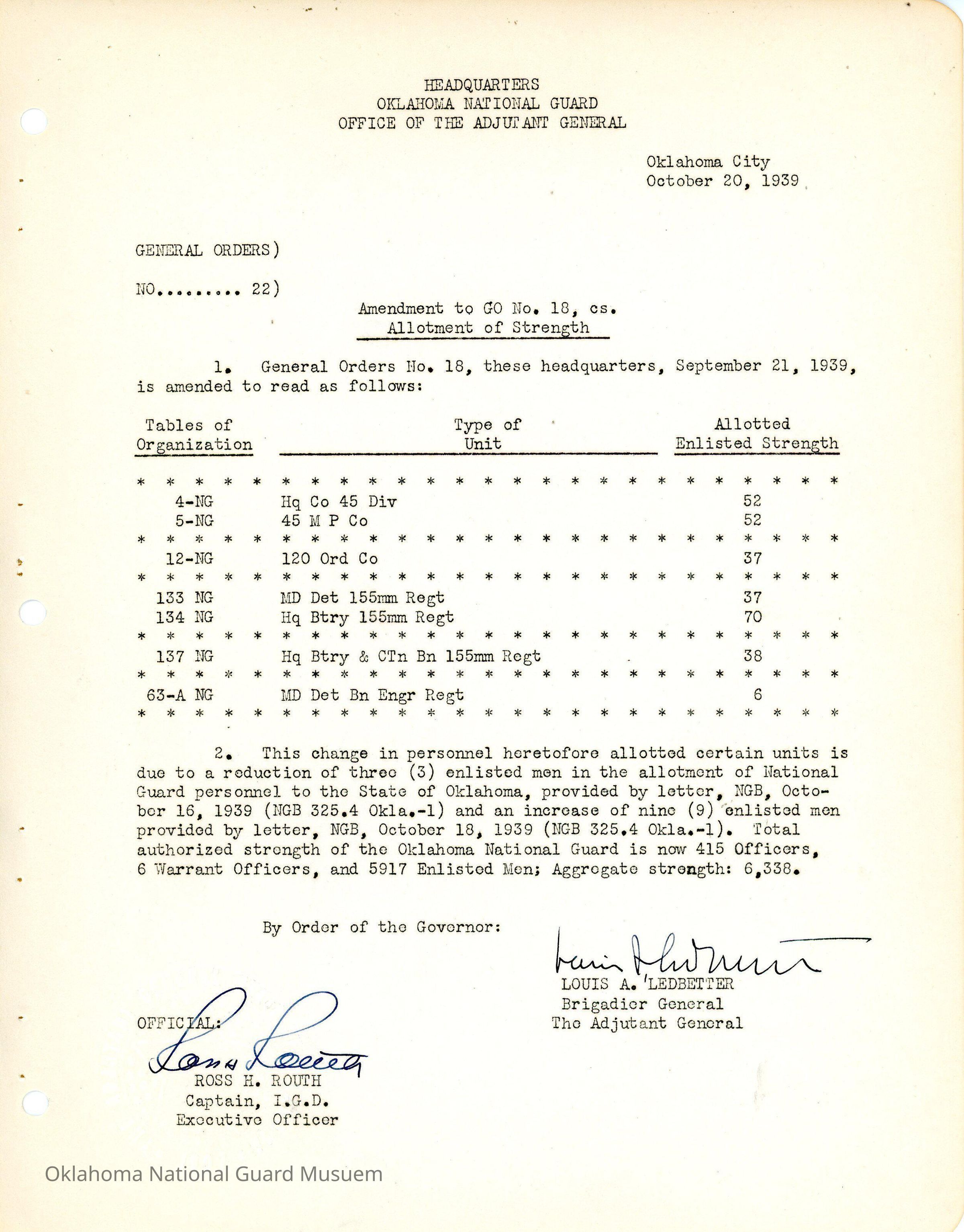 Adjutant General, Oklahoma City, Louis Ledbetter, Ross H. Routh, Amends, Allotment of Strength, 45th Division, 120th Ordinance Company