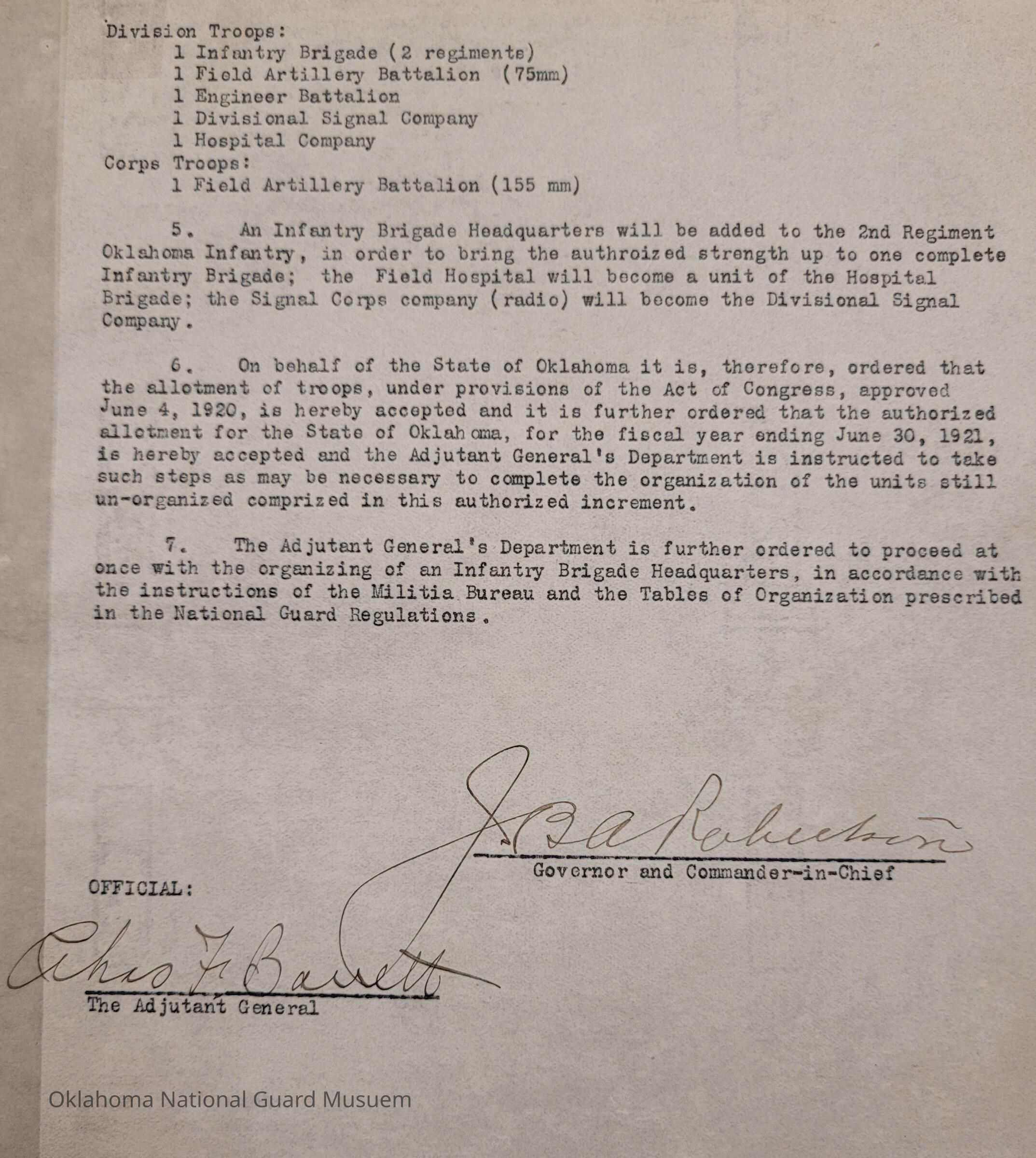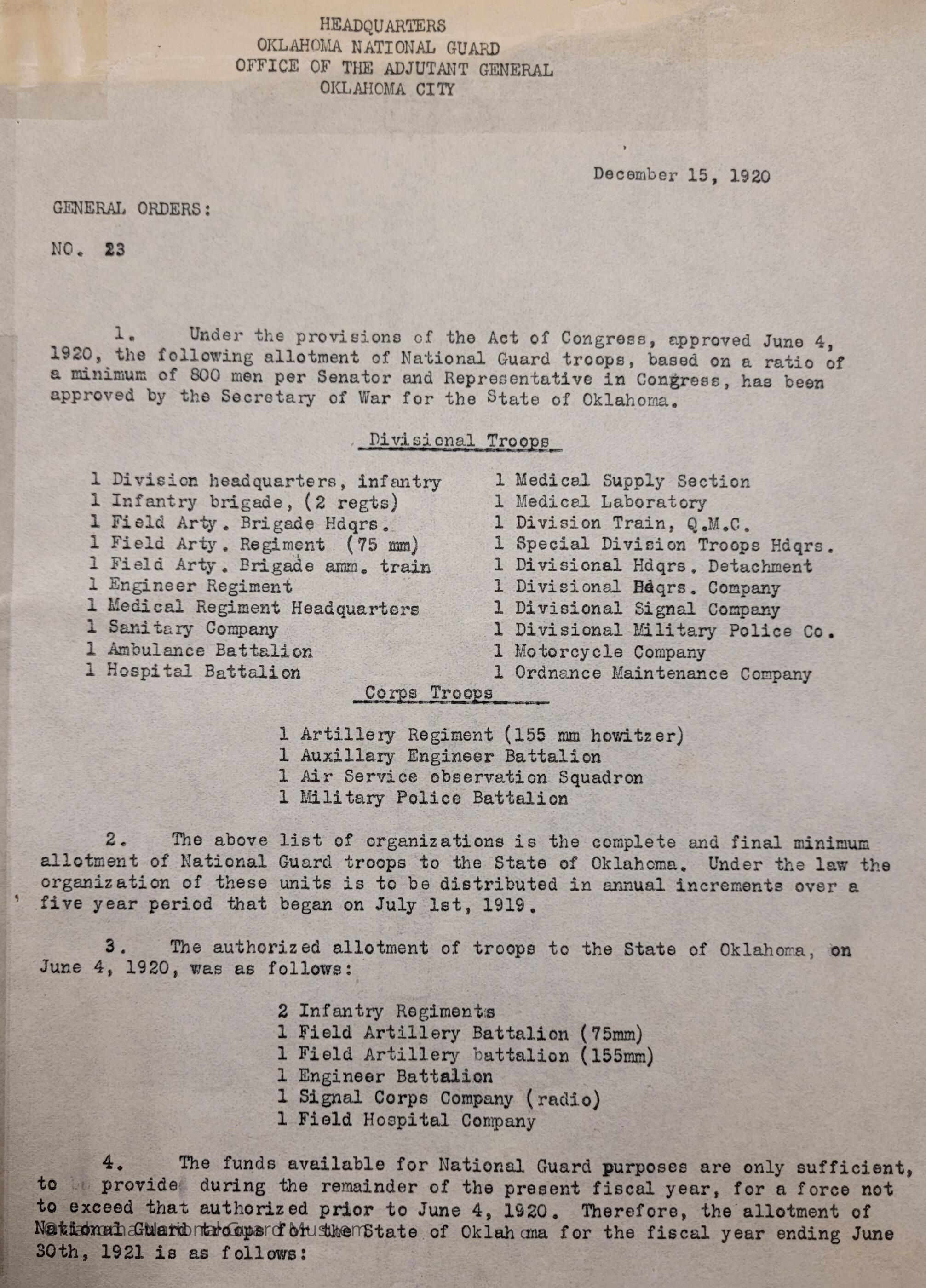 General Order #23 from Headquarters Adjutant General's Office in Oklahoma City. The order reorganizes the Oklahoma National Guard based on a ratio of a minimum of 800 men per Senator and Representative in Congress. The order lays out the Divisional Troops and Corps TroopsDate(s) of Creation