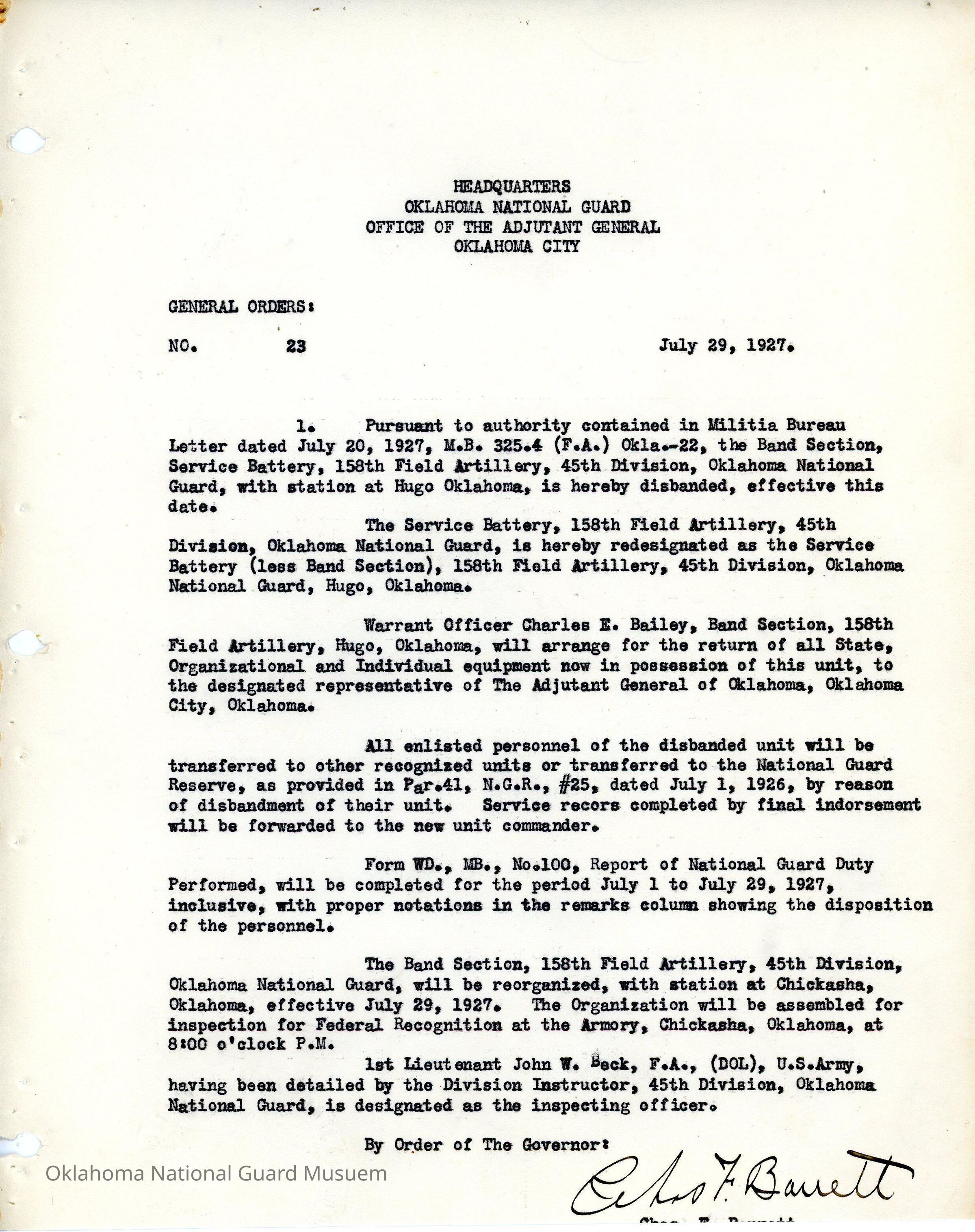 General Order #23 from Headquarters Adjutant General's Office in Oklahoma City. The order disbands the Band Section 158th Field Artillery 45th Division stationed in Hugo and reorganizes them in Chickasha. The order also re-designates Service Battery 158th Field Artillery to Service Battery (less Band Section) 158th Field ArtilleryDate(s) of Creation