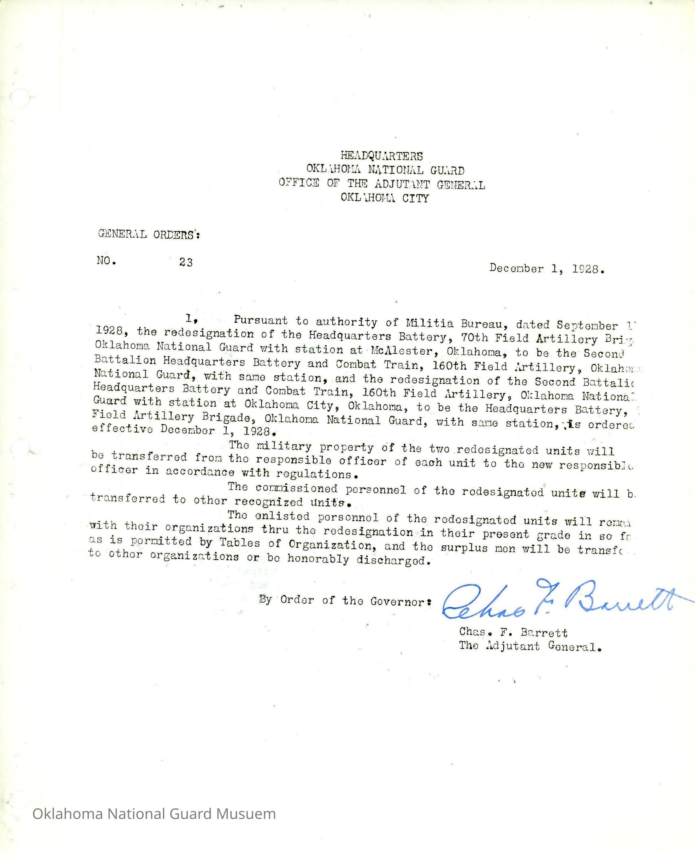 General Order #23 from Headquarters Adjutant General's Office in Oklahoma City. The order re-designates Headquarters Battery 70th Field Artillery Brigade in McAlester to Second Battalion Headquarters battery and Combat Train 160th Field Artillery. It also re-designates the Second Battalion Headquarters battery and Combat Train 160th Field Artillery to be Headquarters Battery 70th Field Artillery BrigadeDate(s) of Creation